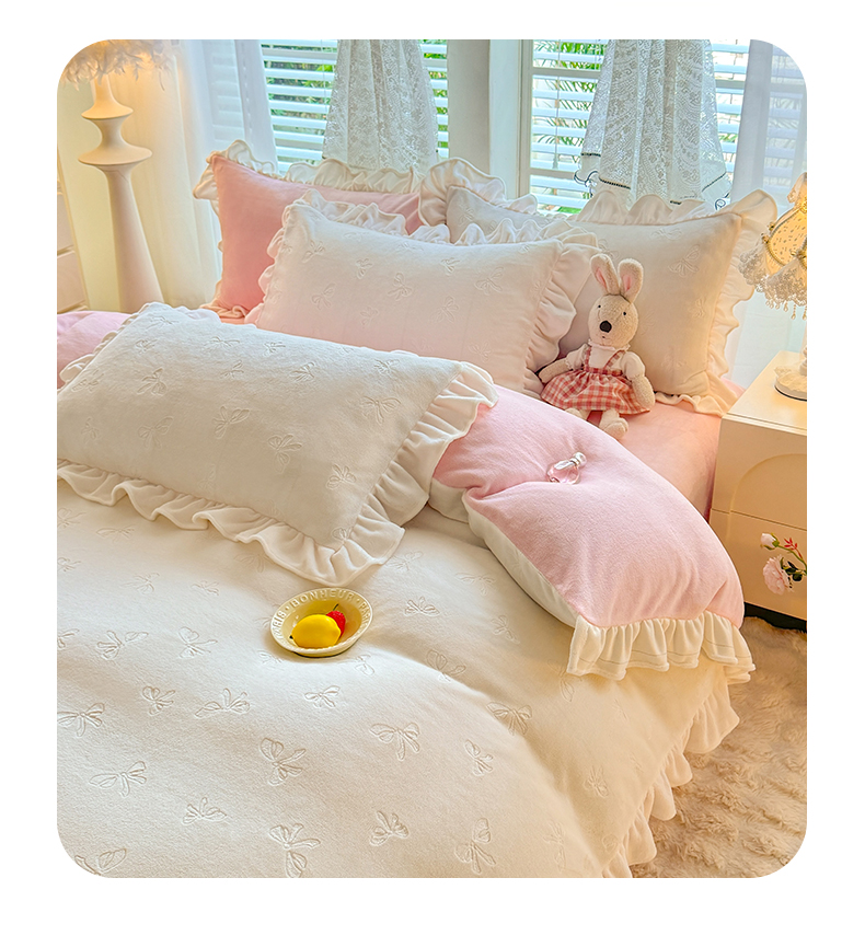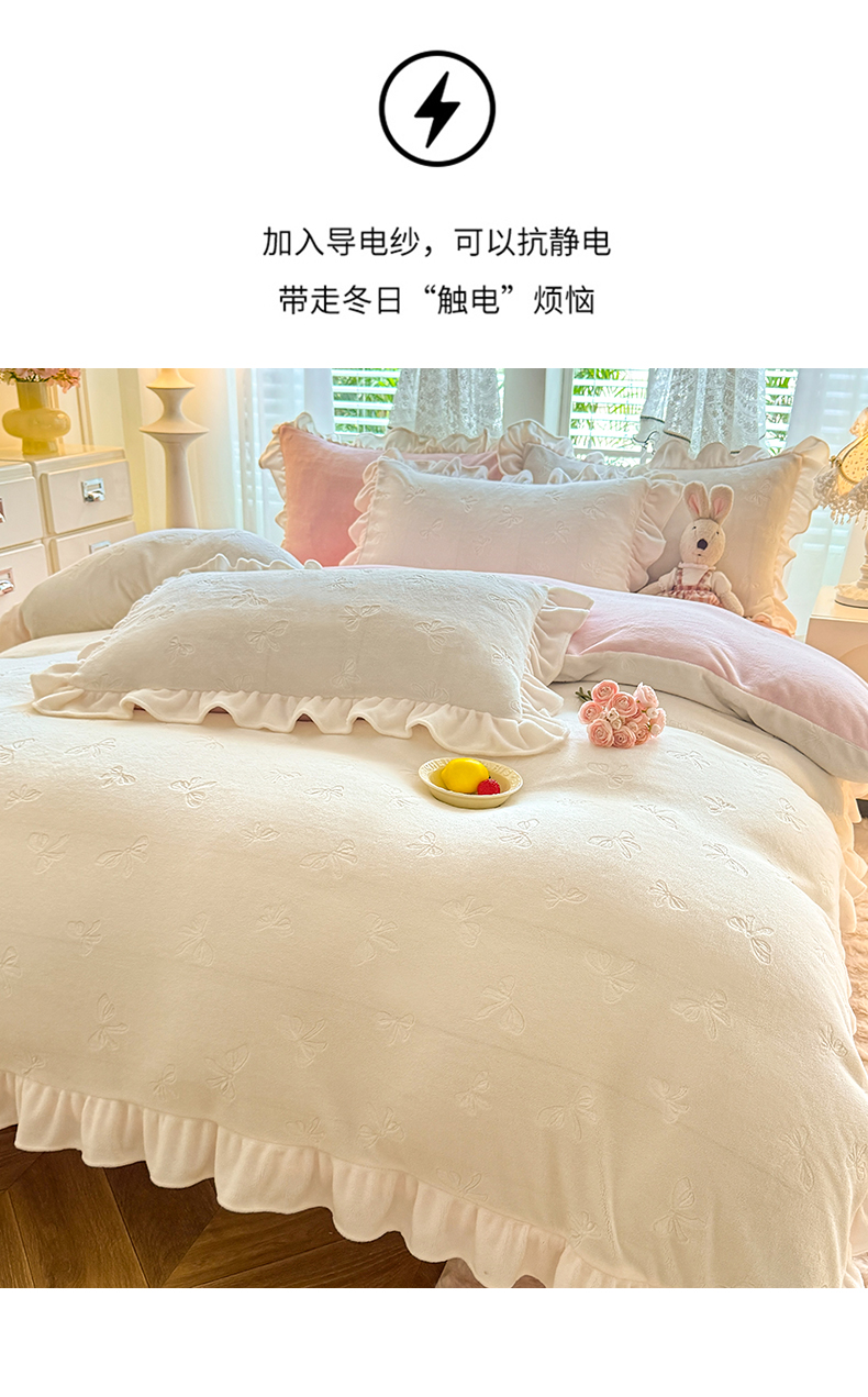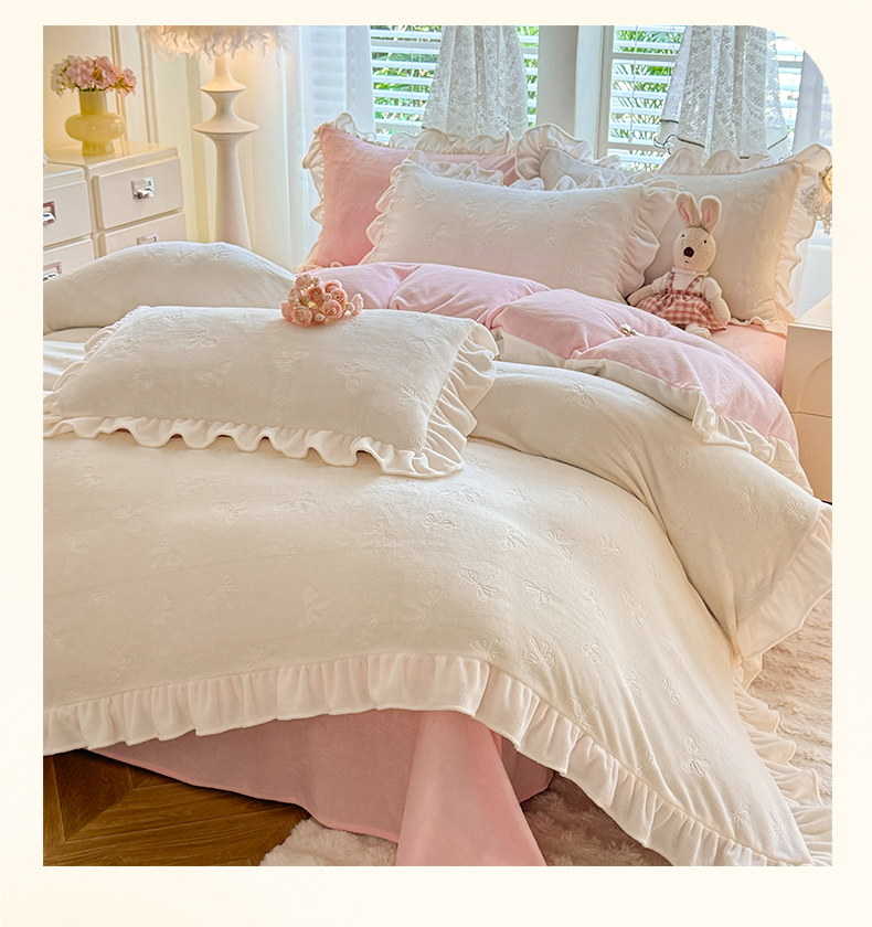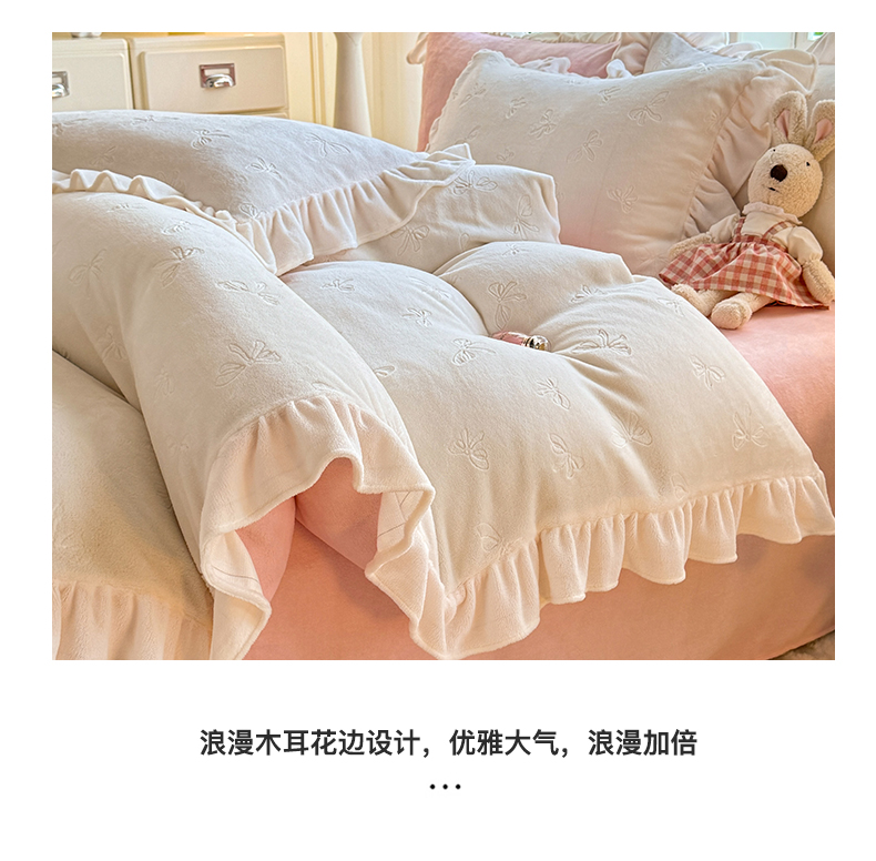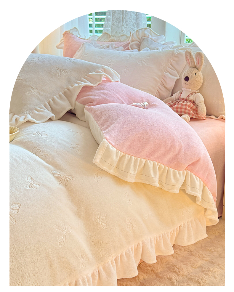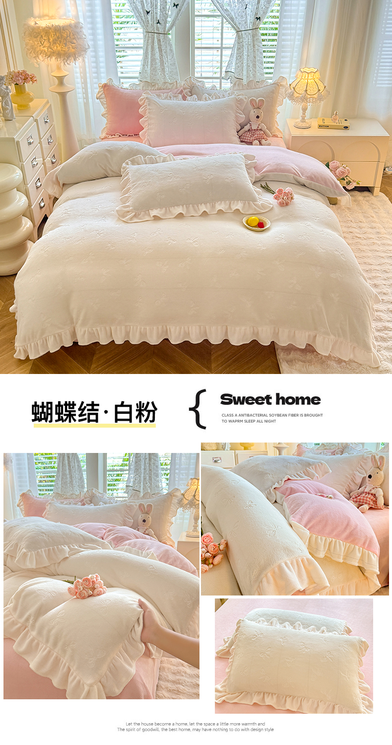 商品名称:逸尚阁 2025新款立体雕花牛奶绒花边四件套-蝴蝶结系列 蝴蝶结- 白粉