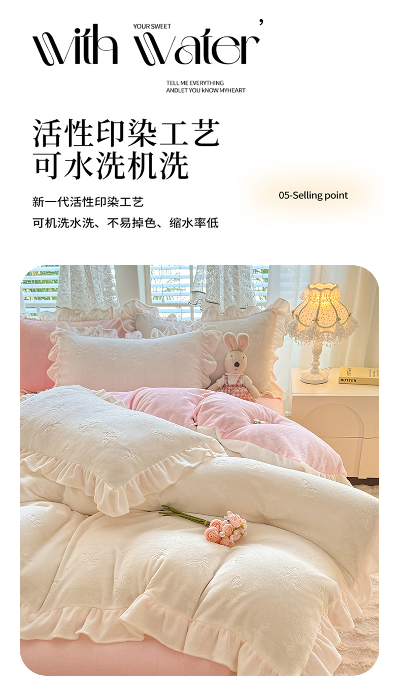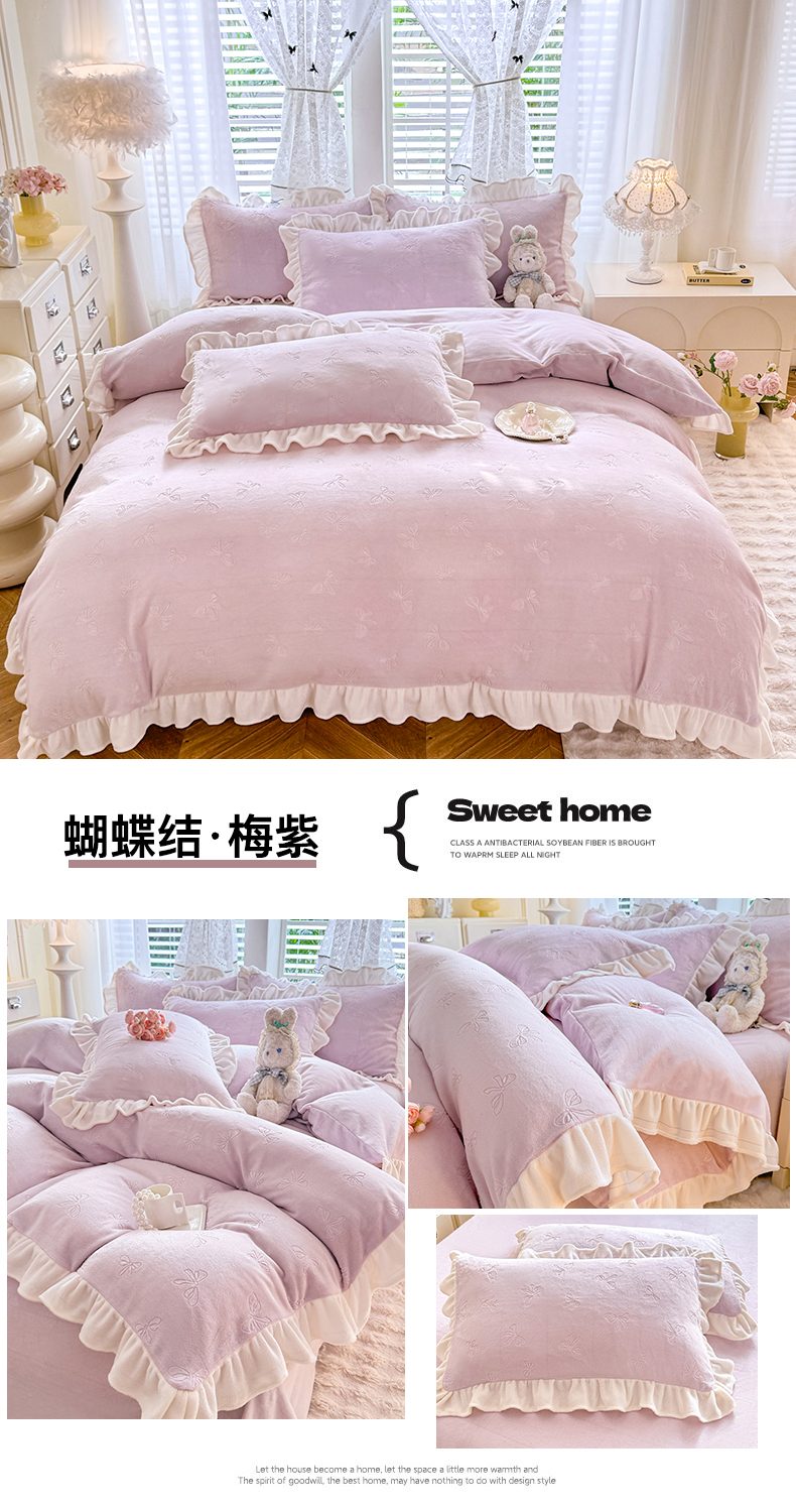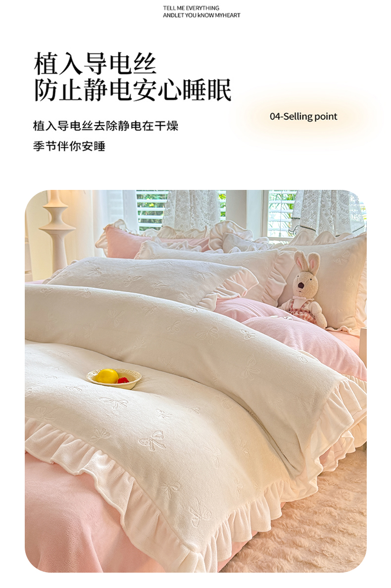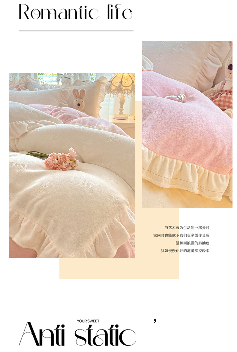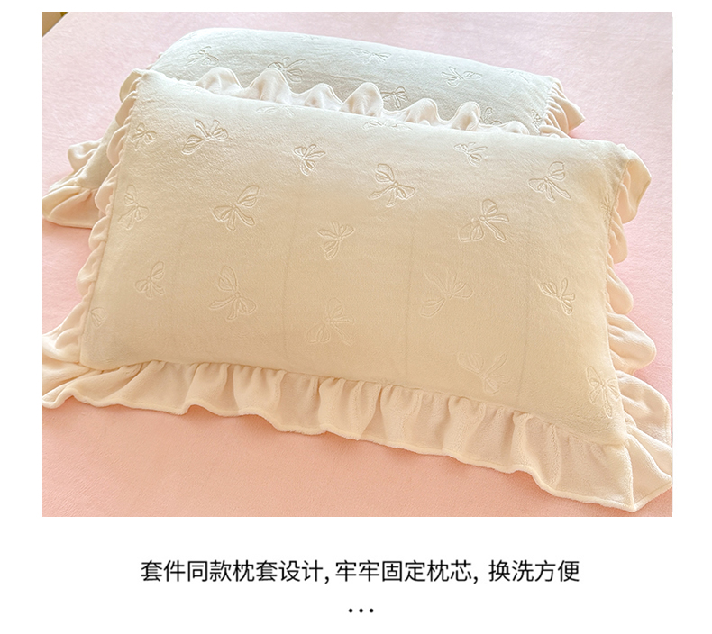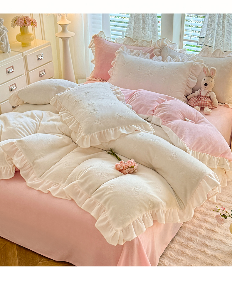 商品名称:逸尚阁 2025新款立体雕花牛奶绒花边四件套-蝴蝶结系列 蝴蝶结- 白粉