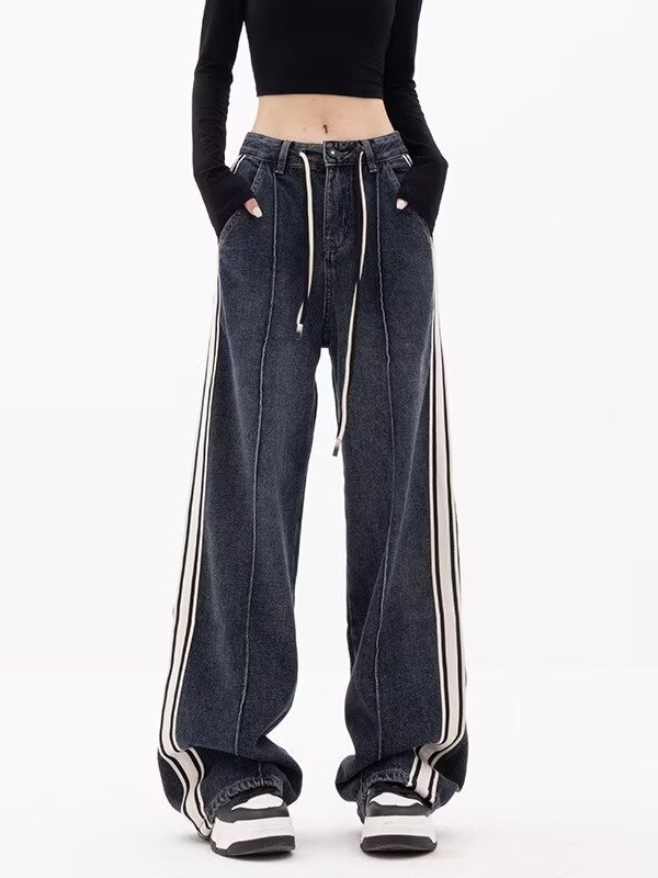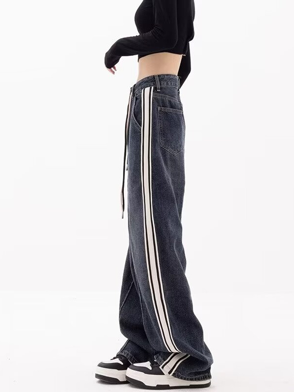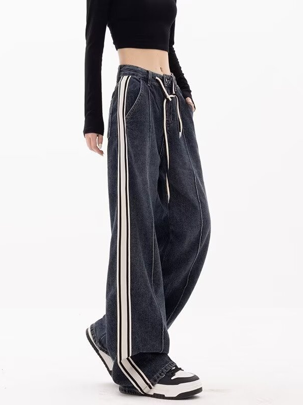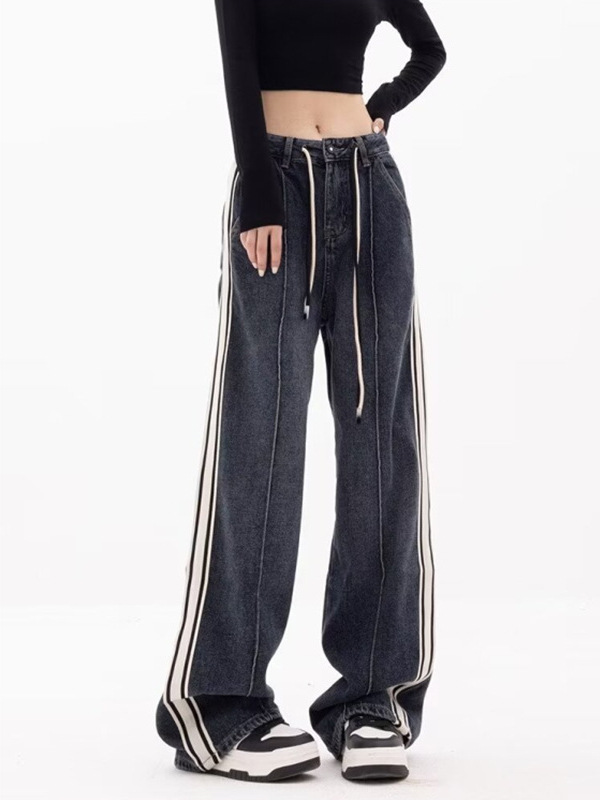 商品名称:(总)洛兰沙家居馆【只代发】【只代发】 2025新款只代发美式条纹拼接牛仔裤女春季薄款宽松直筒阔腿抽绳高街嘻哈复古裤子批22