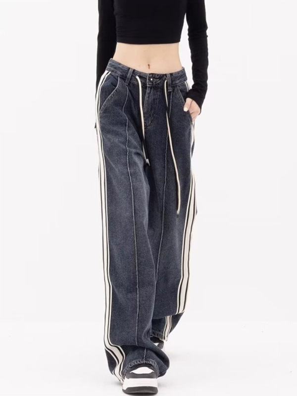 (总)洛兰沙家居馆【只代发】【只代发】 2025新款只代发美式条纹拼接牛仔裤女春季薄款宽松直筒阔腿抽绳高街嘻哈复古裤子批22