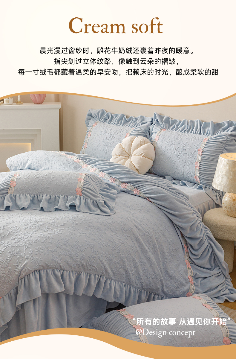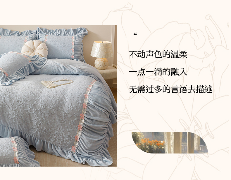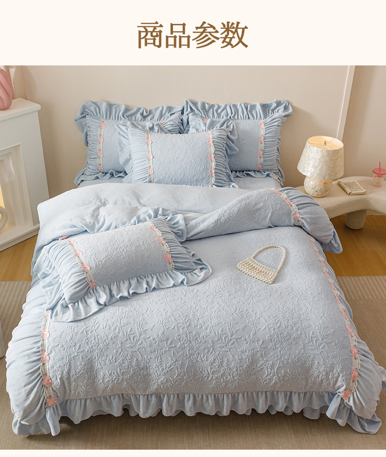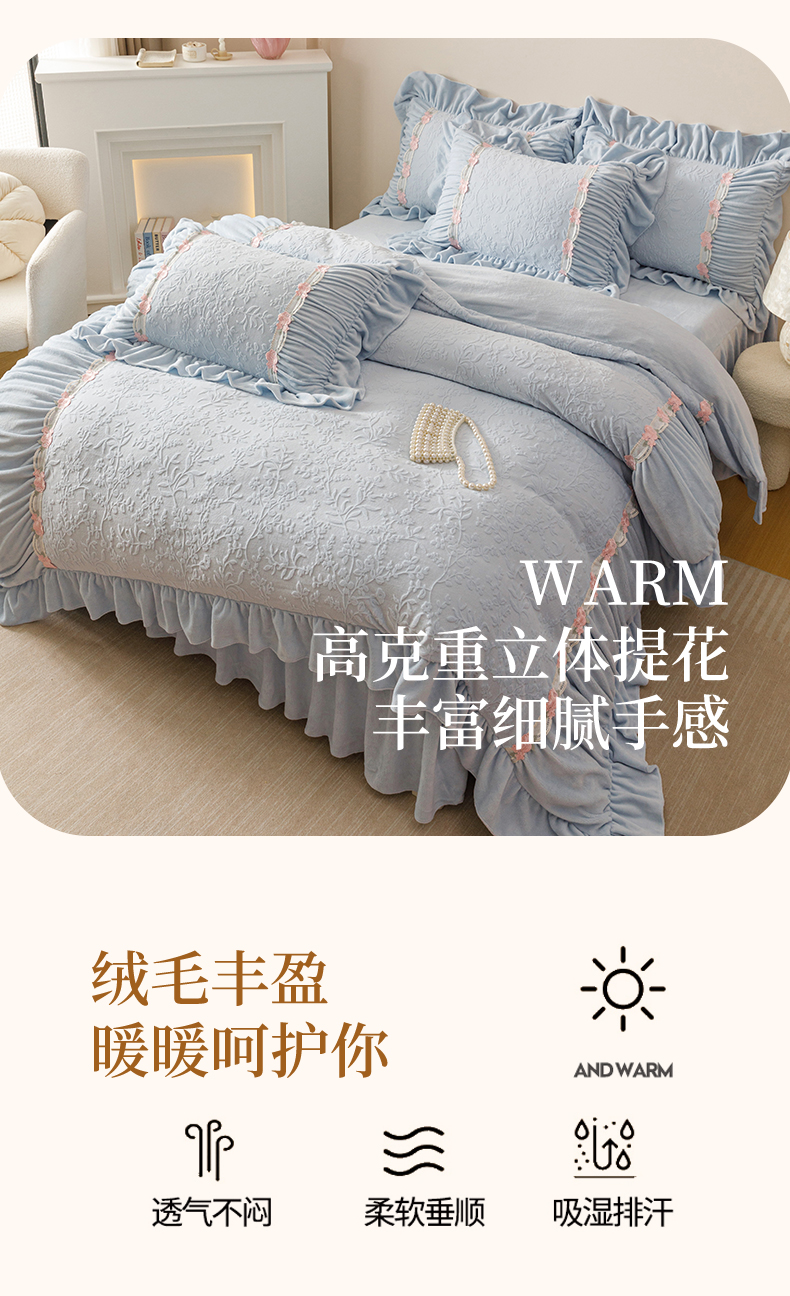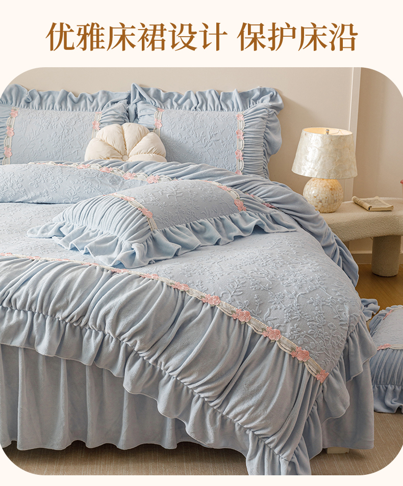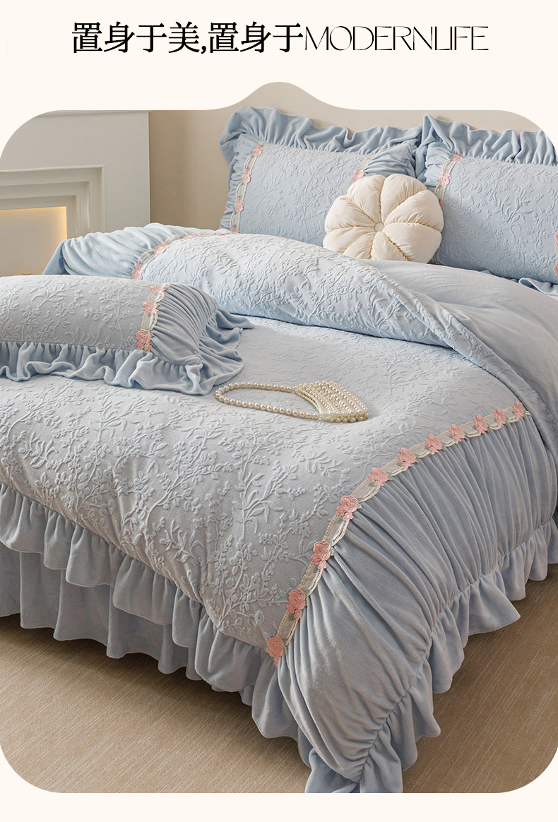 当前位置: 91家纺网 > 商品网购 > 床品套件 > 四件套 > 牛奶绒四件套 > (总)好儿喜家纺 2025新款雕花牛奶绒床裙款四件套—西雅图系列