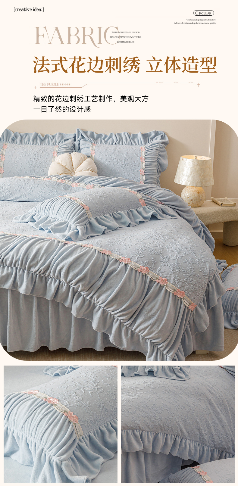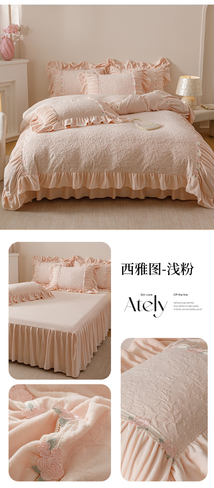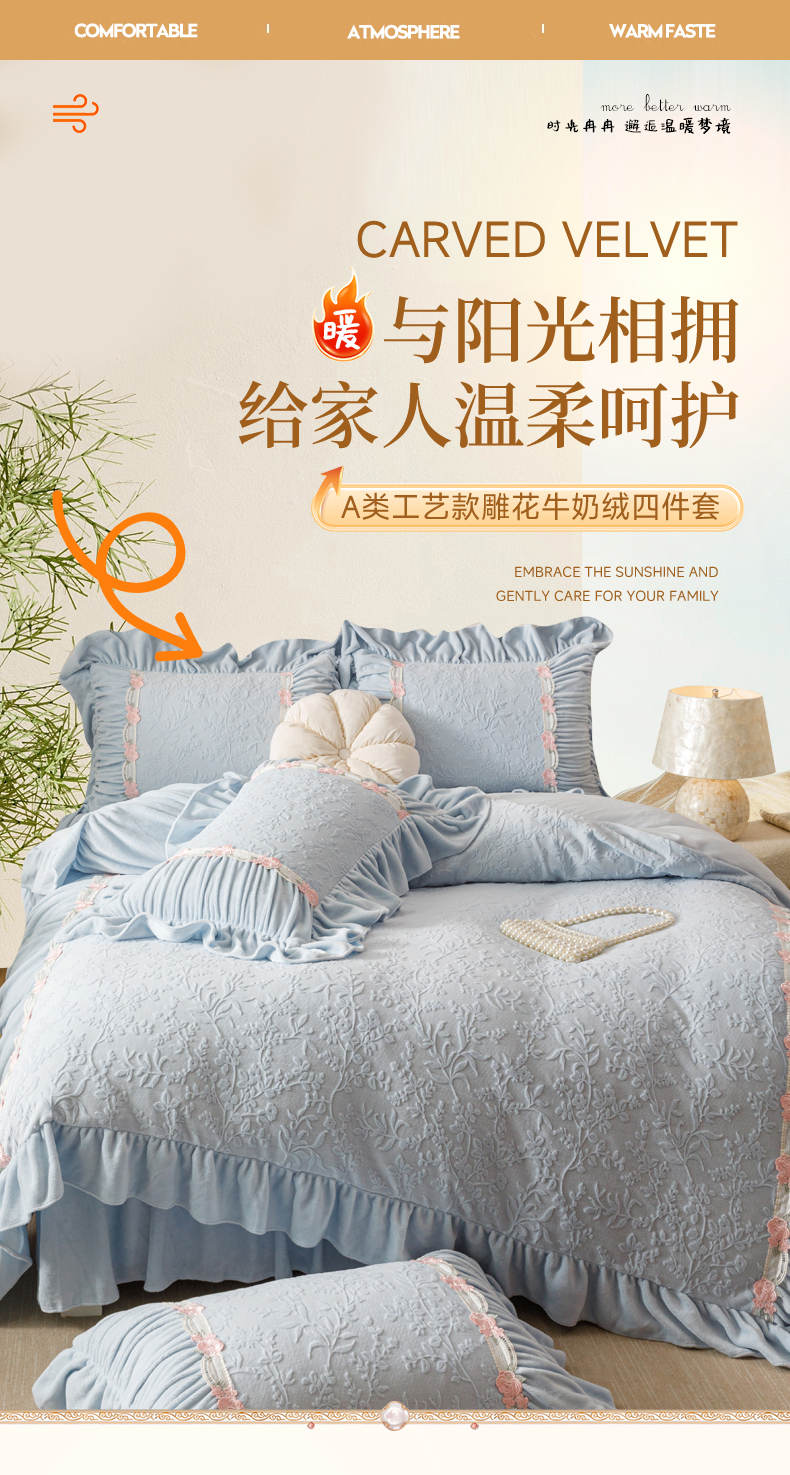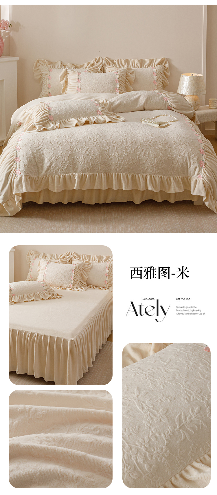 当前位置: 91家纺网 > 商品网购 > 床品套件 > 四件套 > 牛奶绒四件套 > (总)好儿喜家纺 2025新款雕花牛奶绒床裙款四件套—西雅图系列