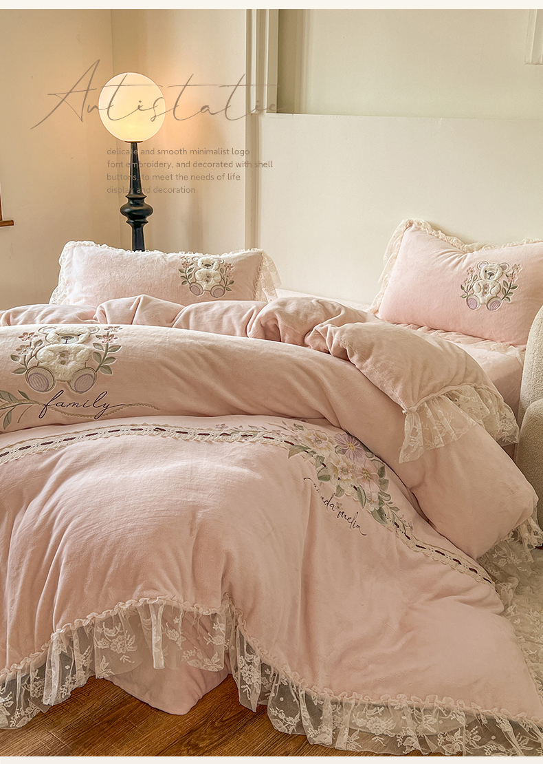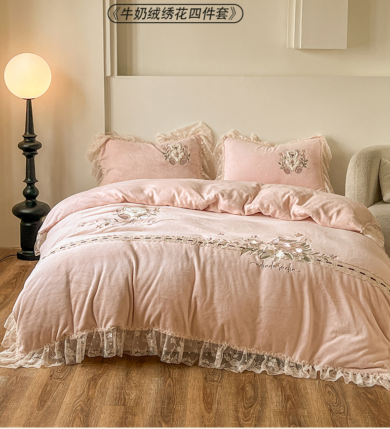 商品名称:新印象 2025新款全消光牛奶绒绣花活性印染四件套花梦小熊 花梦小熊-少女粉