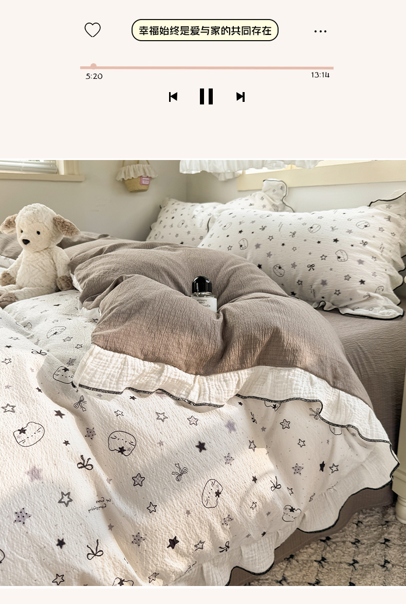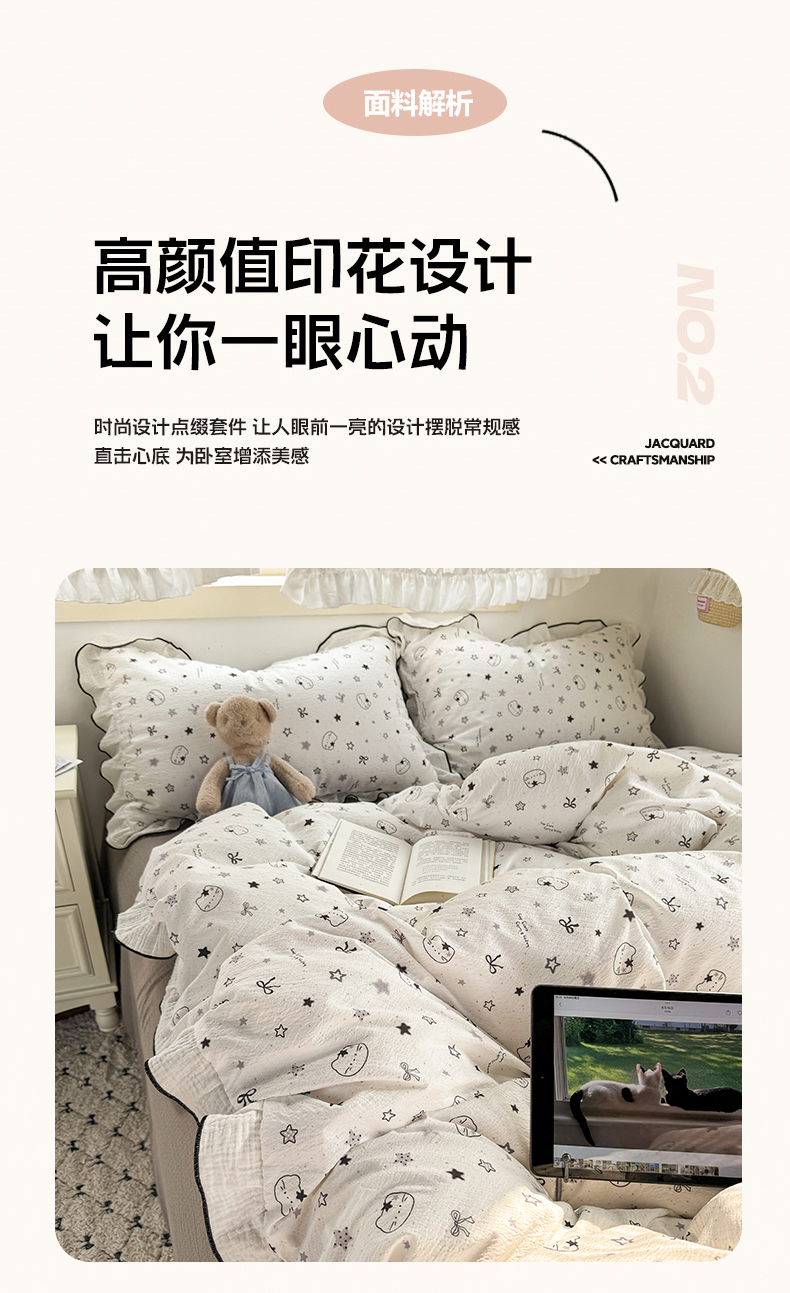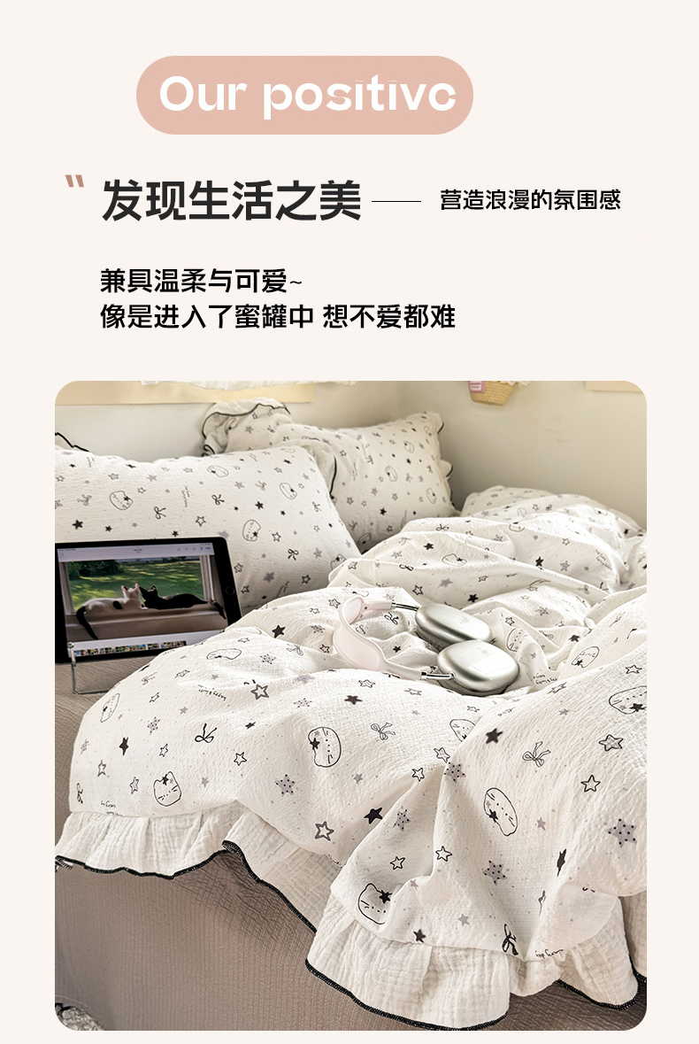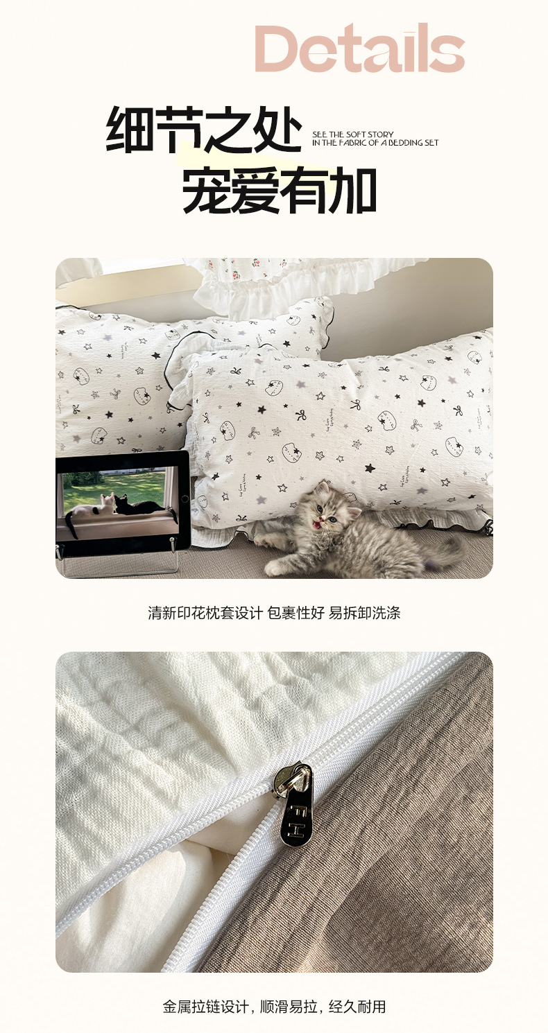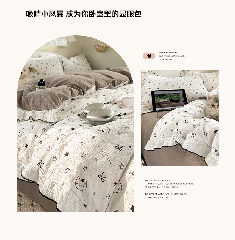 当前位置: 91家纺网 > 商品网购 > 床品套件 > 四件套 > 其它四件套 > 繁花家居 2025新款高弹线云感木棉多层纱花边超软四件套 灰头小猫