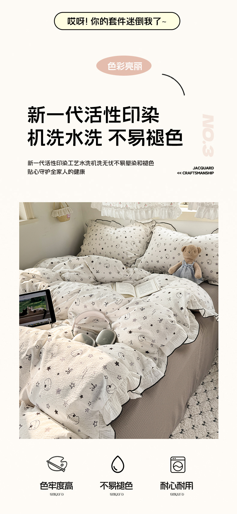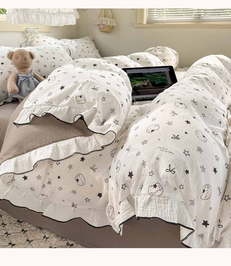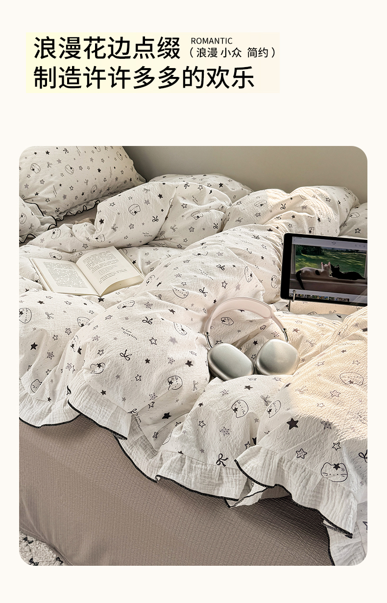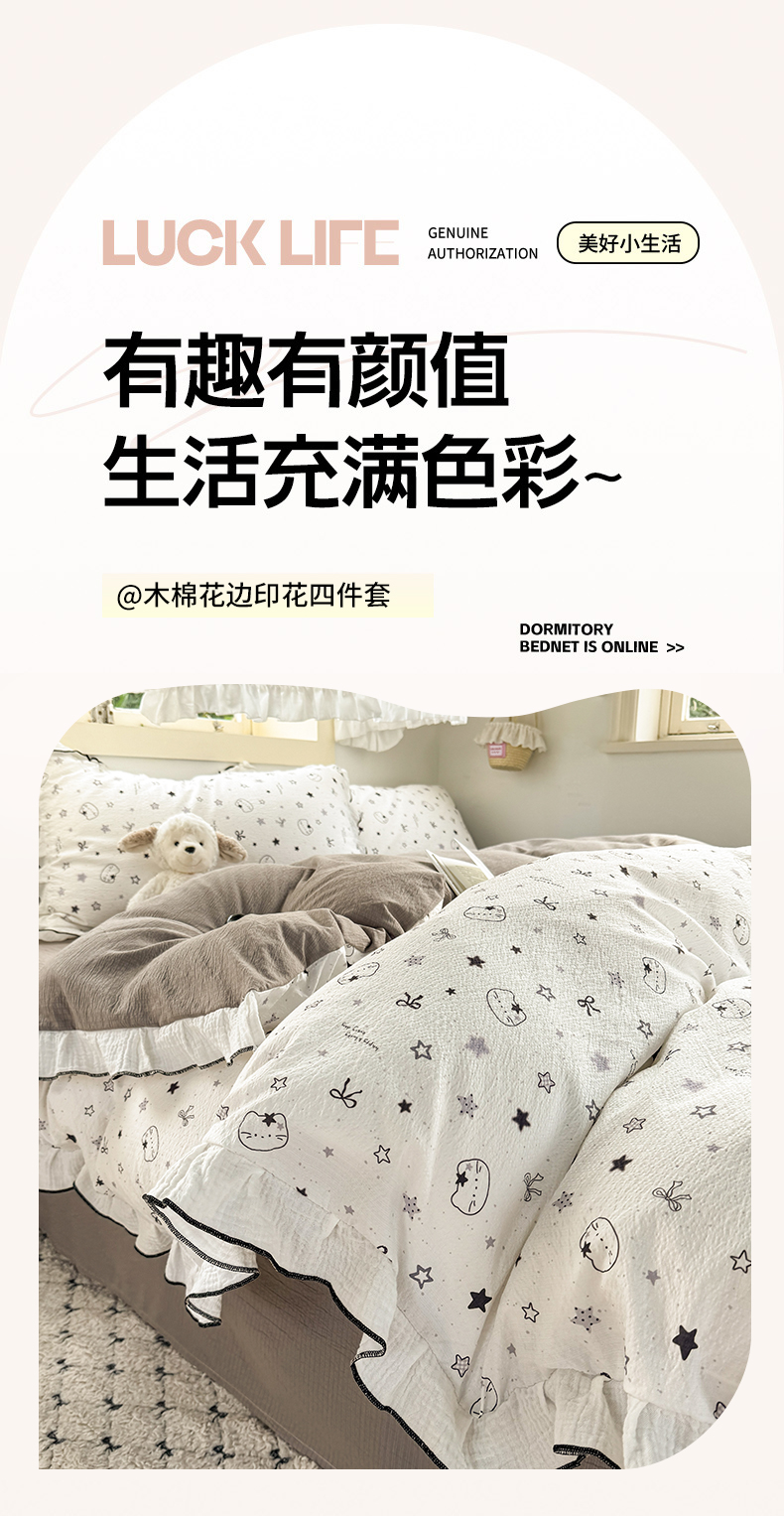 当前位置: 91家纺网 > 商品网购 > 床品套件 > 四件套 > 其它四件套 > 繁花家居 2025新款高弹线云感木棉多层纱花边超软四件套 灰头小猫