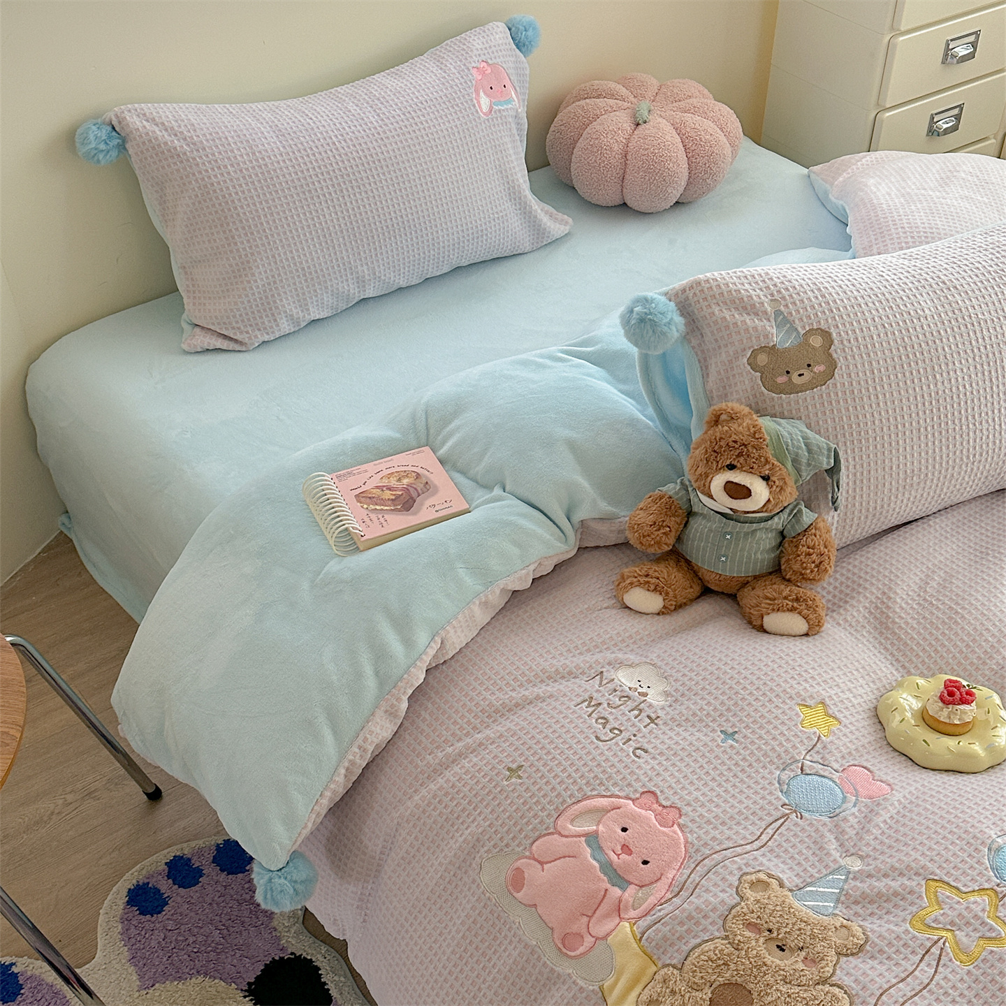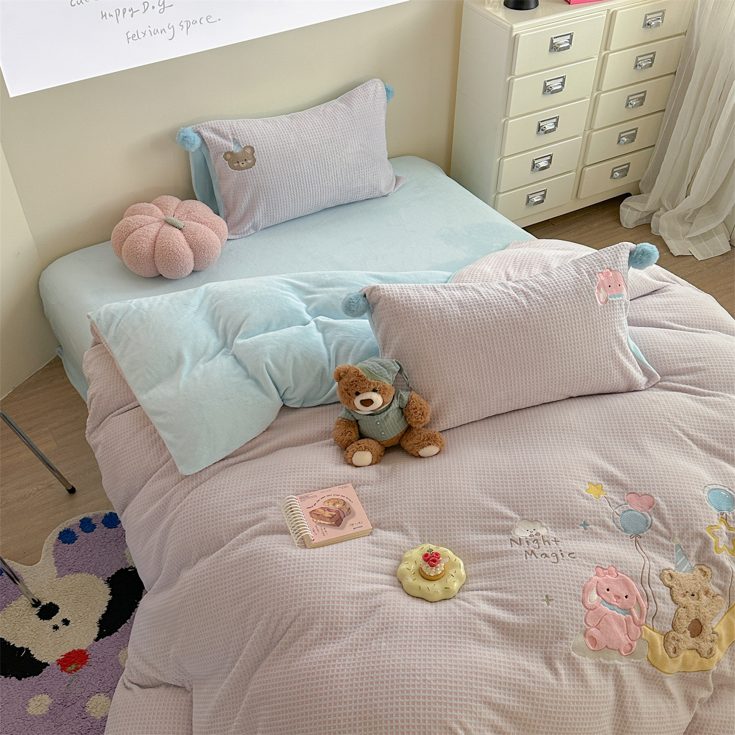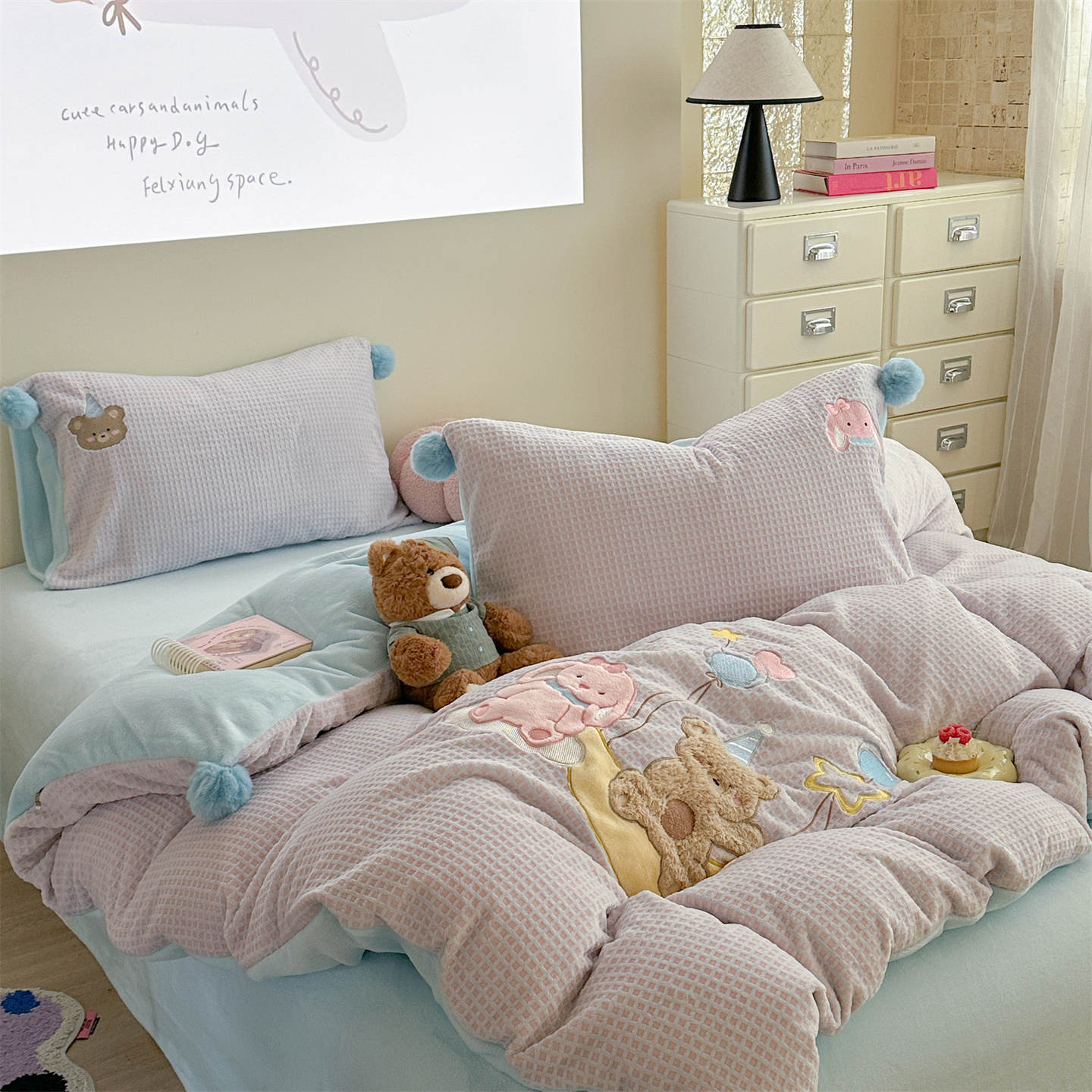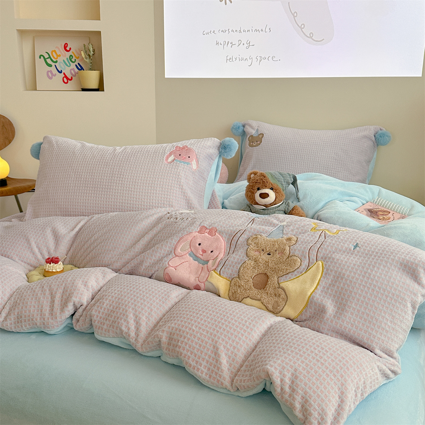 (总)柚子YOUTH 2025新款加厚牛奶绒卡通毛巾绣四件套-印加绣送同款毛毯,蛋糕小狗,公主猫,头套猫,兔兔花园,小伙伴,雪纳瑞
