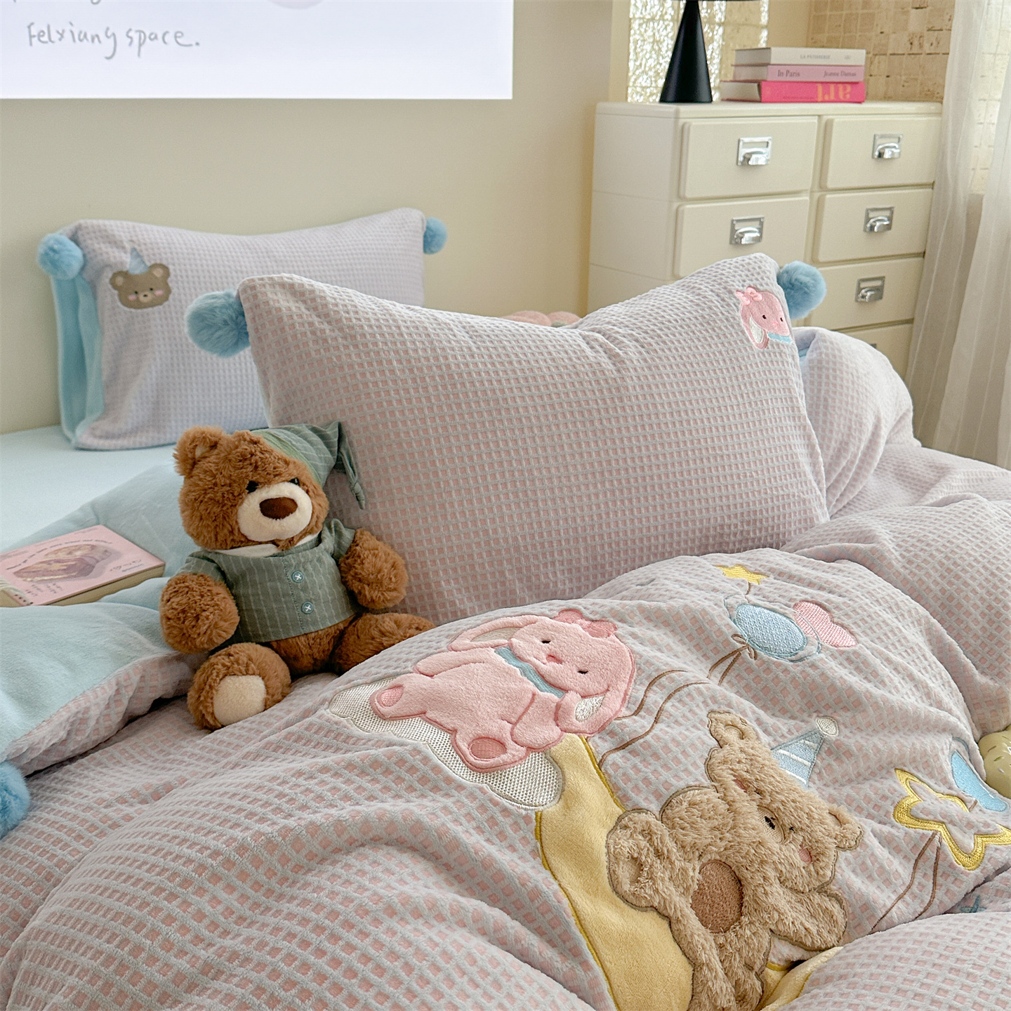 (总)柚子YOUTH 2025新款华夫格提花绒刺绣四件套,奔跑的小狗,冰雪世界,电话猫,黑猫的礼物,茄子蛋糕屋,月亮气球