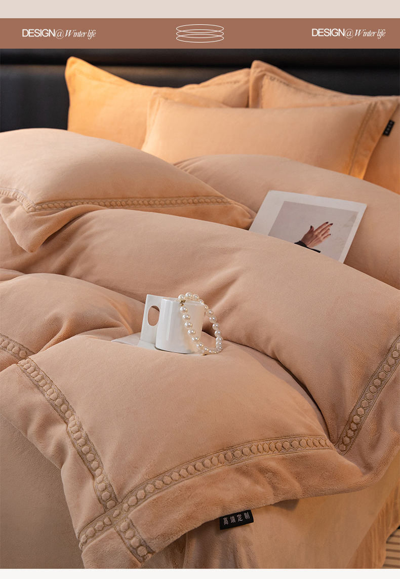 (总)暖洋 2025新款240克高克重全工艺纯色织带花边款牛奶绒四件套,枫糖橙,卡其紫,米奇,柔草绿,绅士灰,天空蓝,樱花粉,云锦红