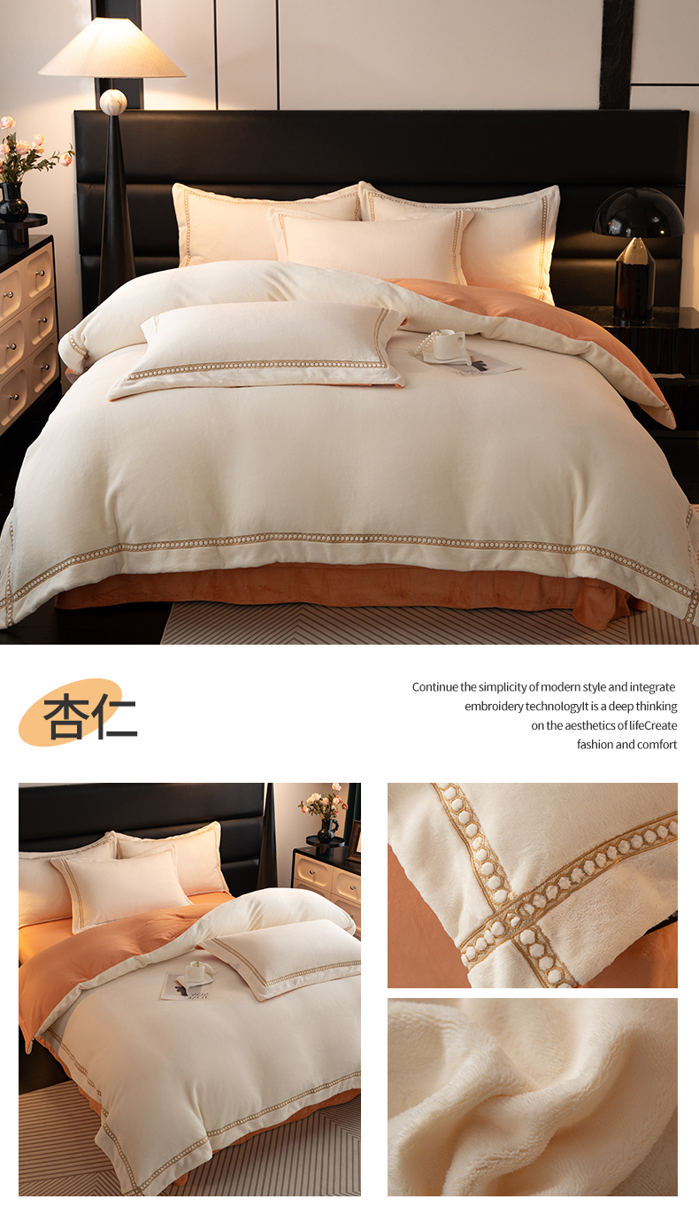 (总)暖洋家纺 2025新款暖芙绒纯色刺绣款套件四件套,爱玛橙,银灰色,香槟色,杏仁,玉色,湖绿色,蓝灰