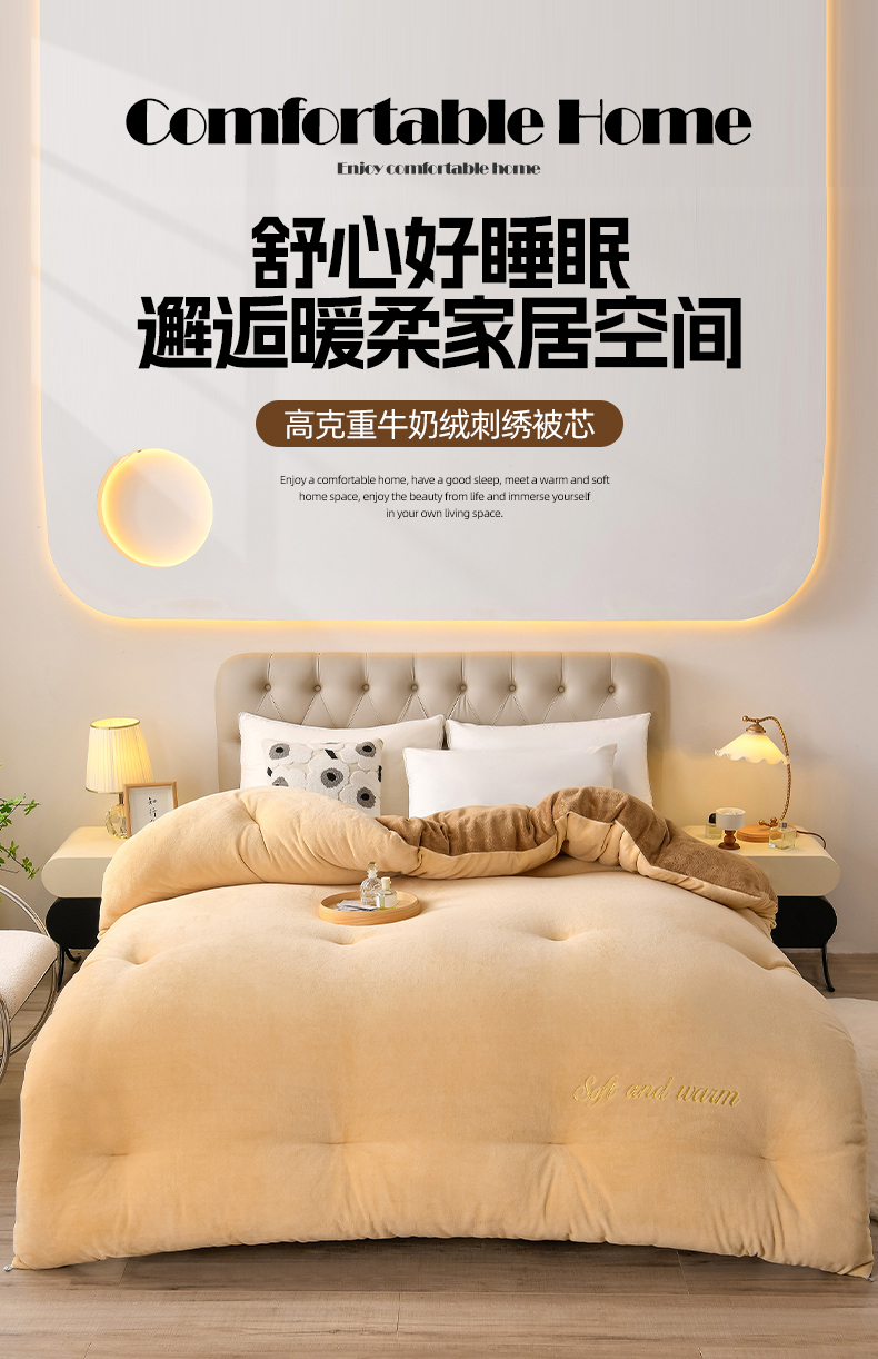 春雨家居 2025新款双面牛奶绒刺绣冬被被子被芯 奢华拿铁