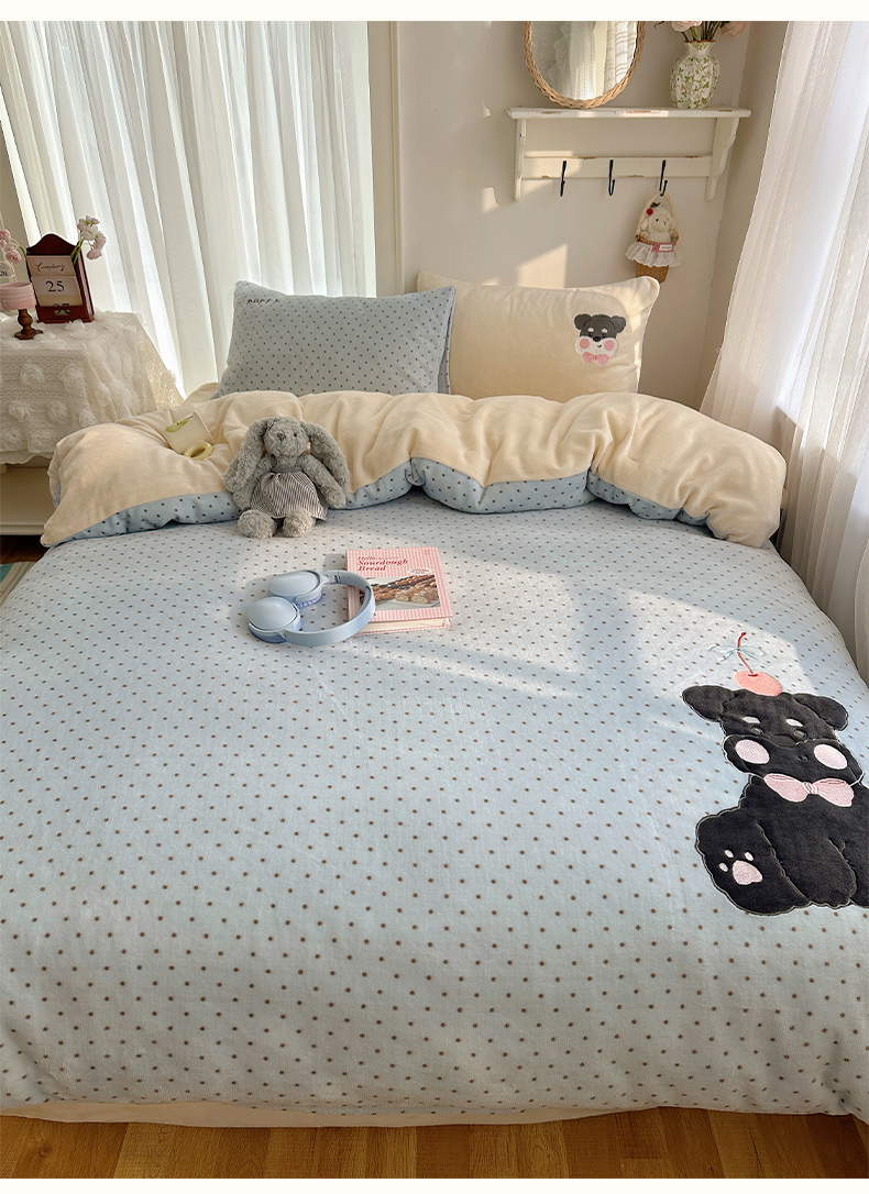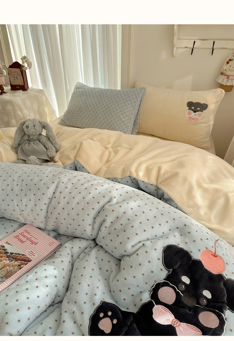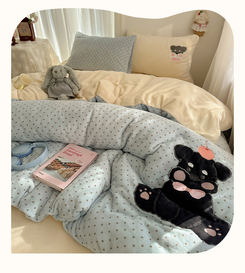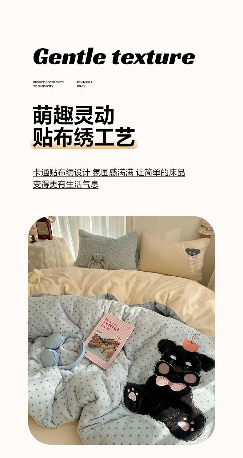 当前位置: 91家纺网 > 商品网购 > 床品套件 > 四件套 > 牛奶绒四件套 > 韩都家居 2025新款卡通贴布绣系列加厚牛奶绒四件套 苹果狗狗