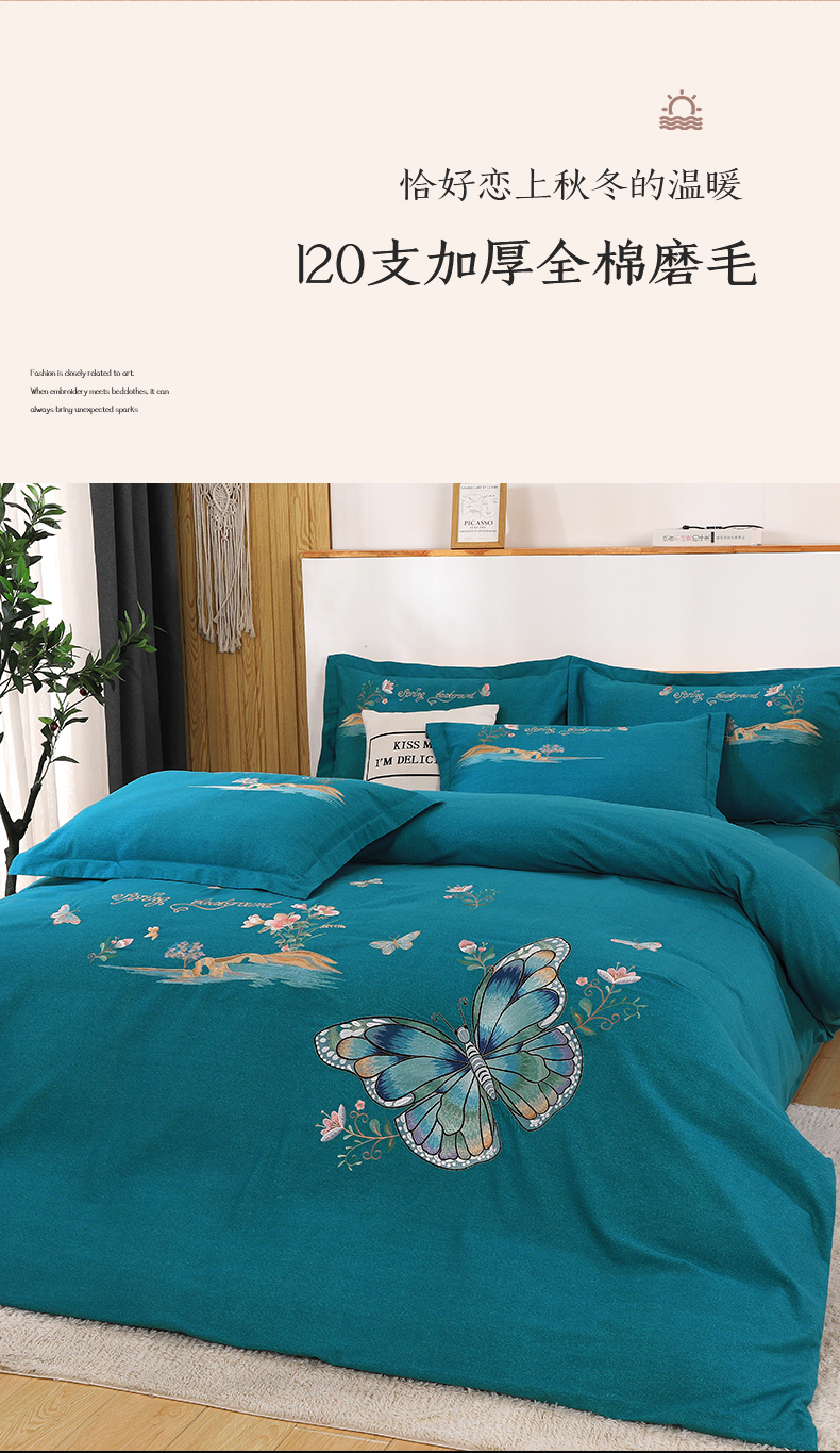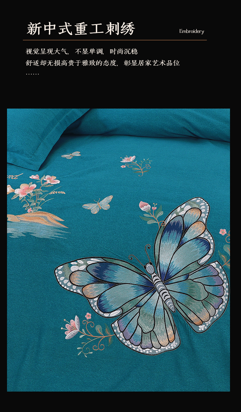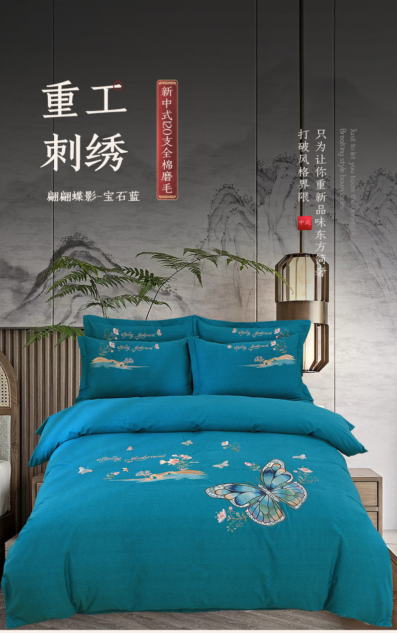 浩情国际婚庆供货中心 2026新款秋冬60S高端全棉刺绣磨毛系列 翩翩蝶影-宝石蓝