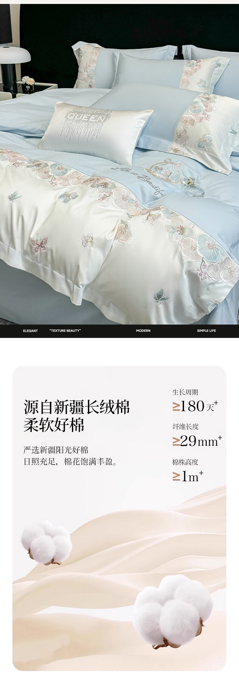 商品名称:欣宜家纺 2026春夏新款A类60支长绒棉刺绣四件套--蝶纷飞系列 蝶纷飞-蓝