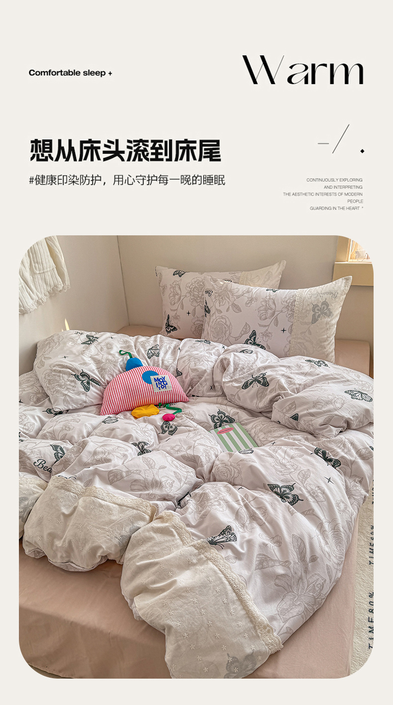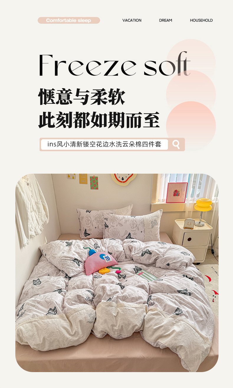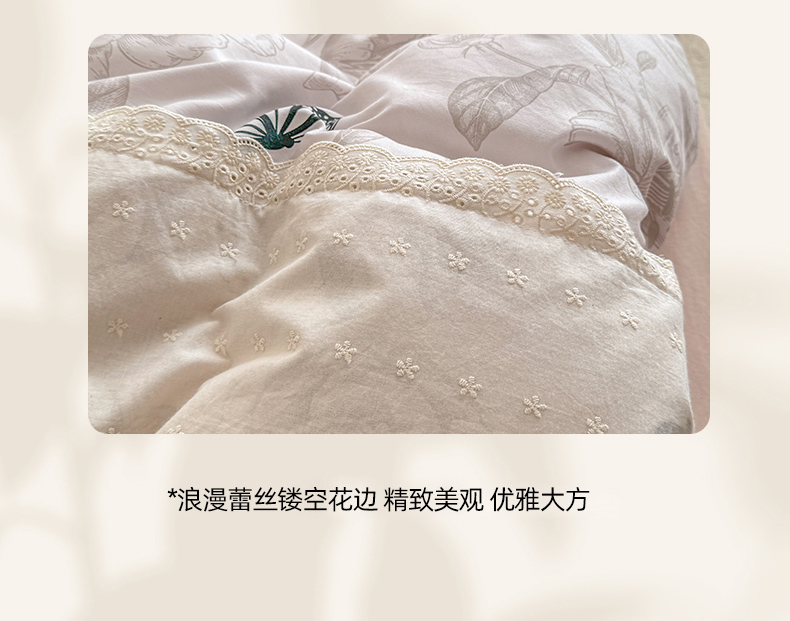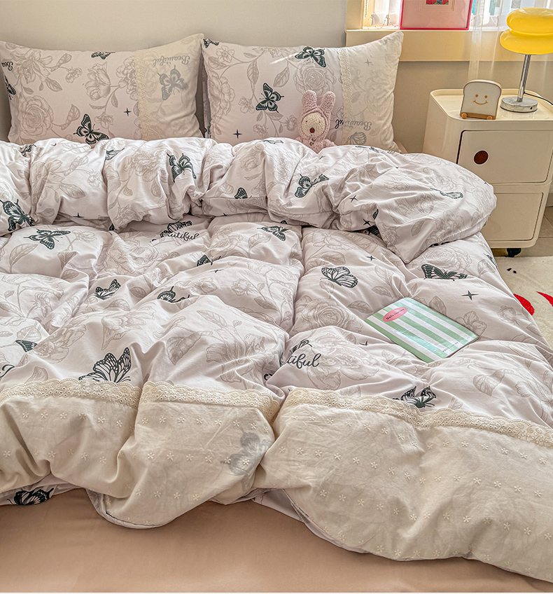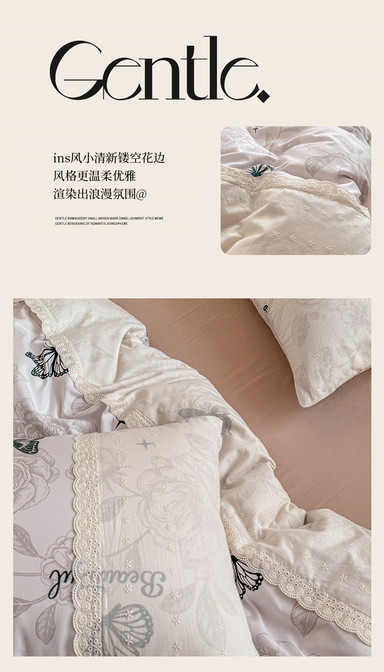 当前位置: 91家纺网 > 商品网购 > 床品套件 > 四件套 > 水洗棉四件套 > 温眠家纺 2025新款ins风小清新镂空花边水洗云朵棉四件套-风格二 蝶恋花