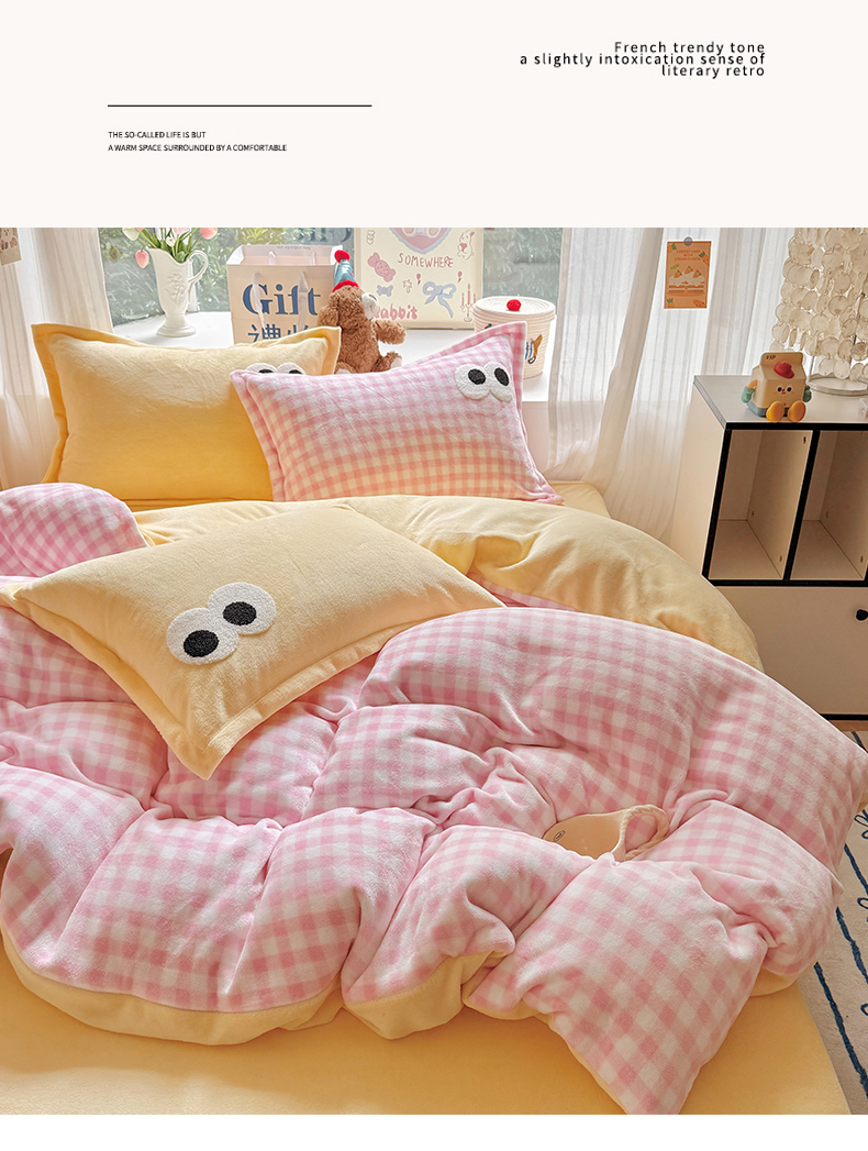 商品名称:温眠家纺 2025新款ins加厚毛巾绣大眼睛混搭撞色奶油格子牛奶绒四件套 绒-粉格米黄