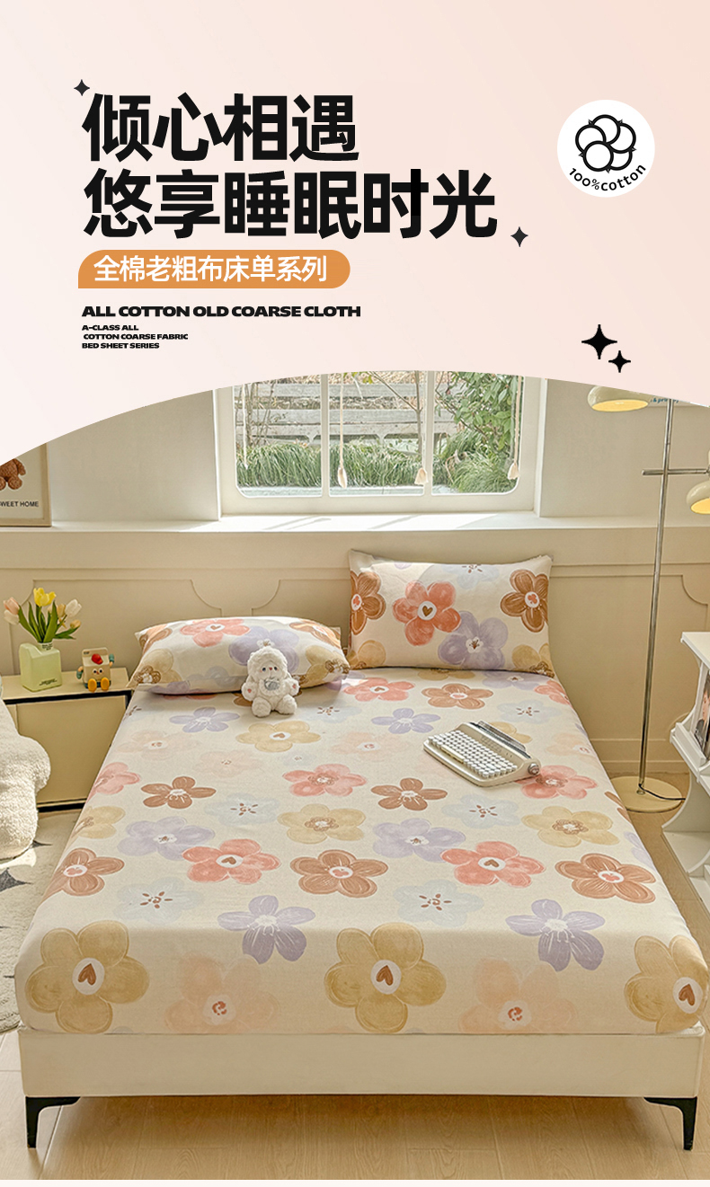 爱彼家纺 2026新款舒适透气老粗布凉席印花床笠单件-床笠三件套 老粗布床笠-向阳花开