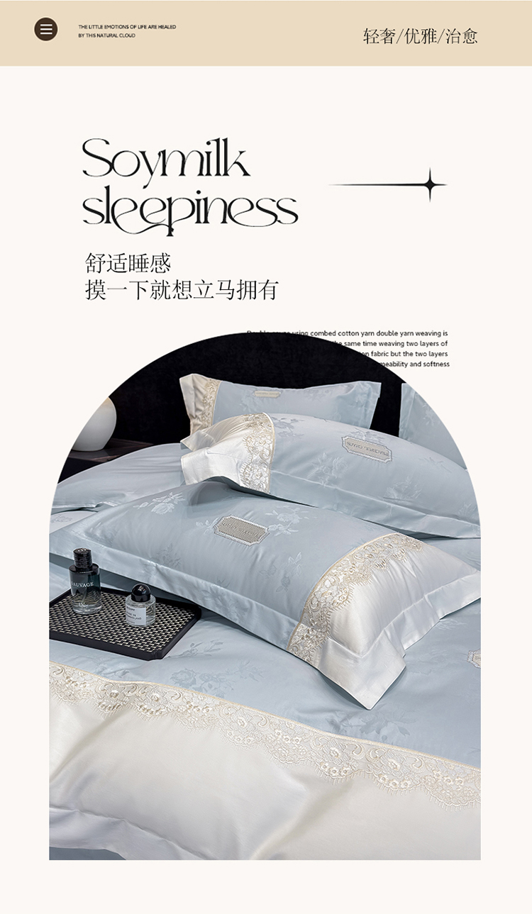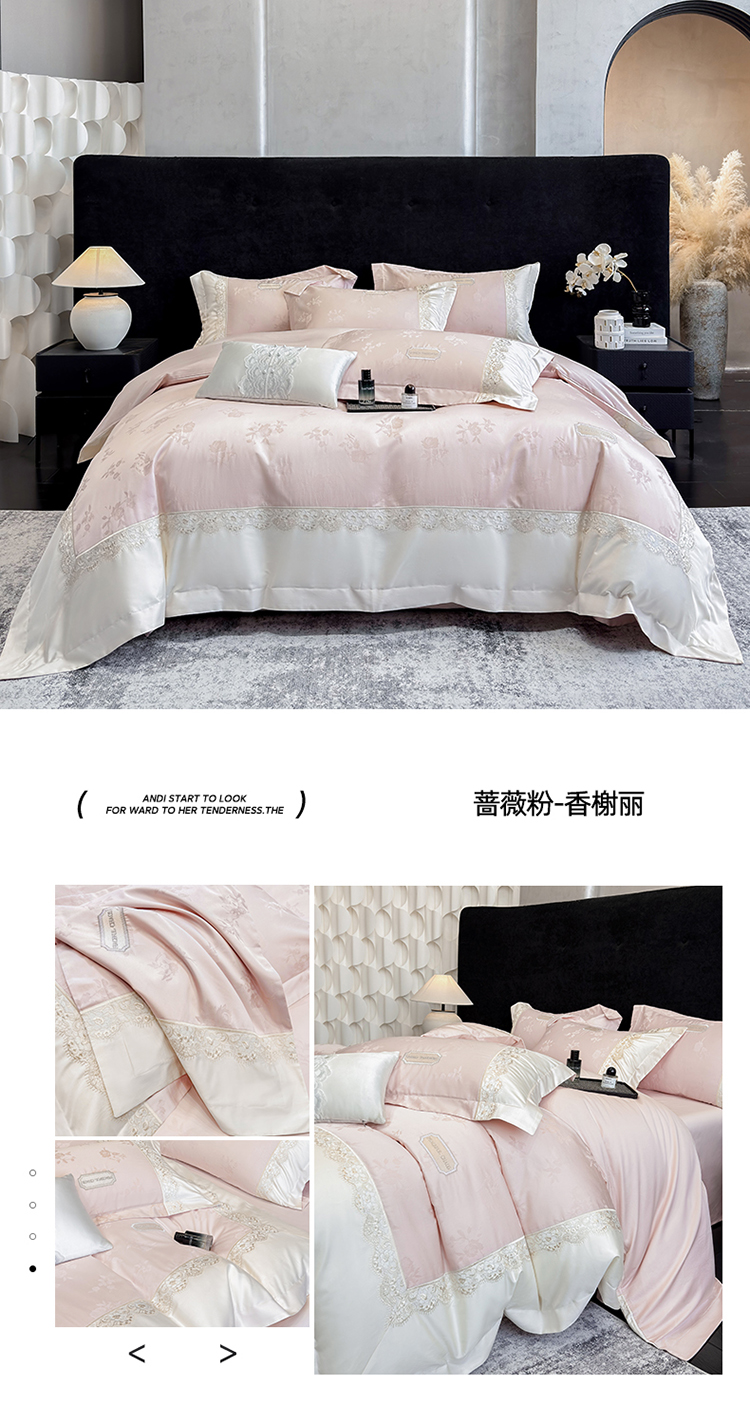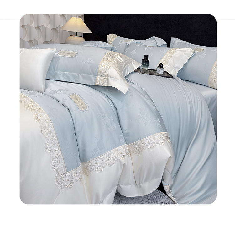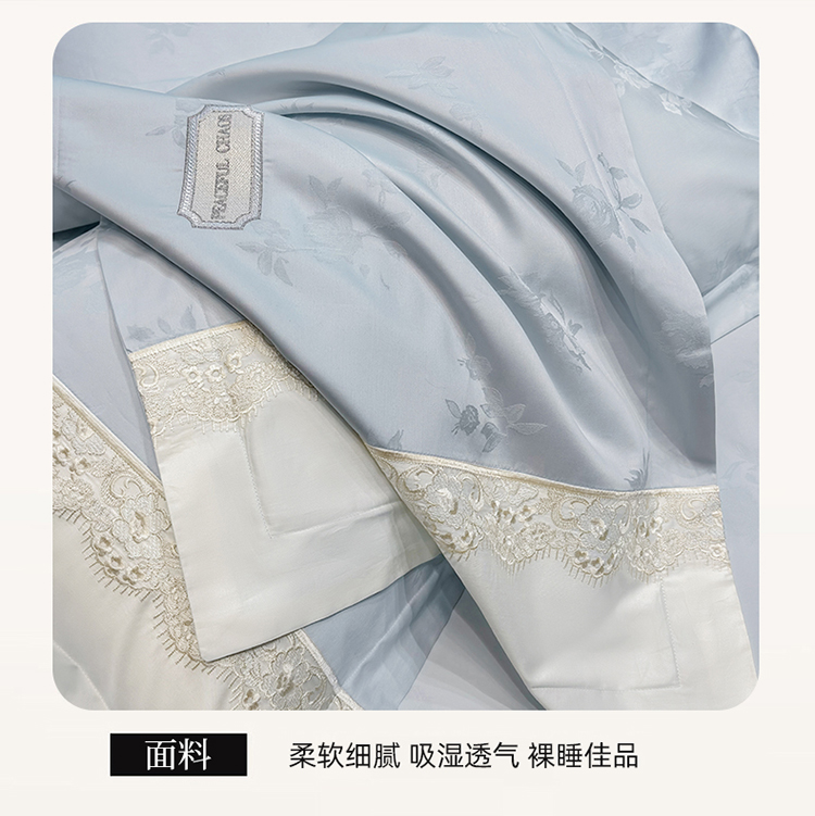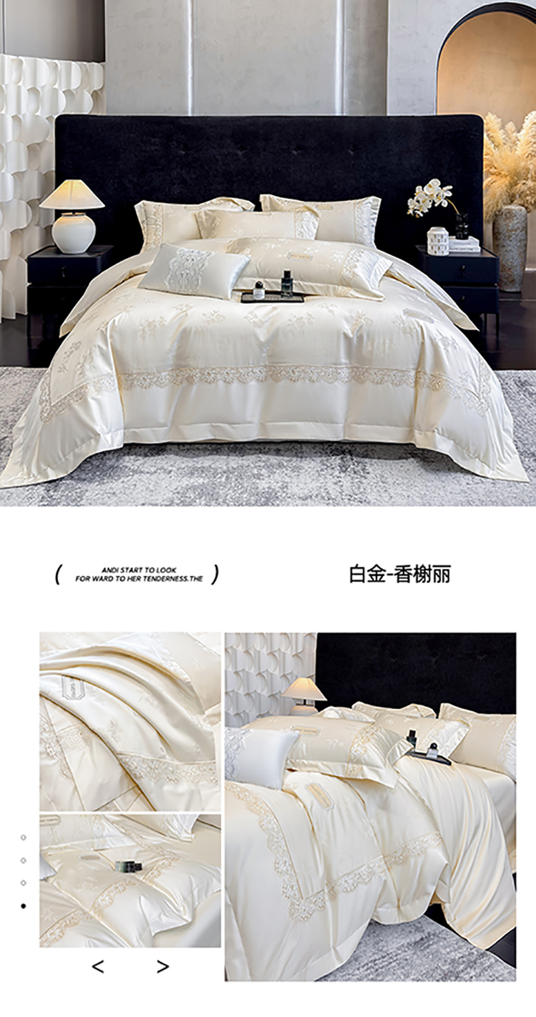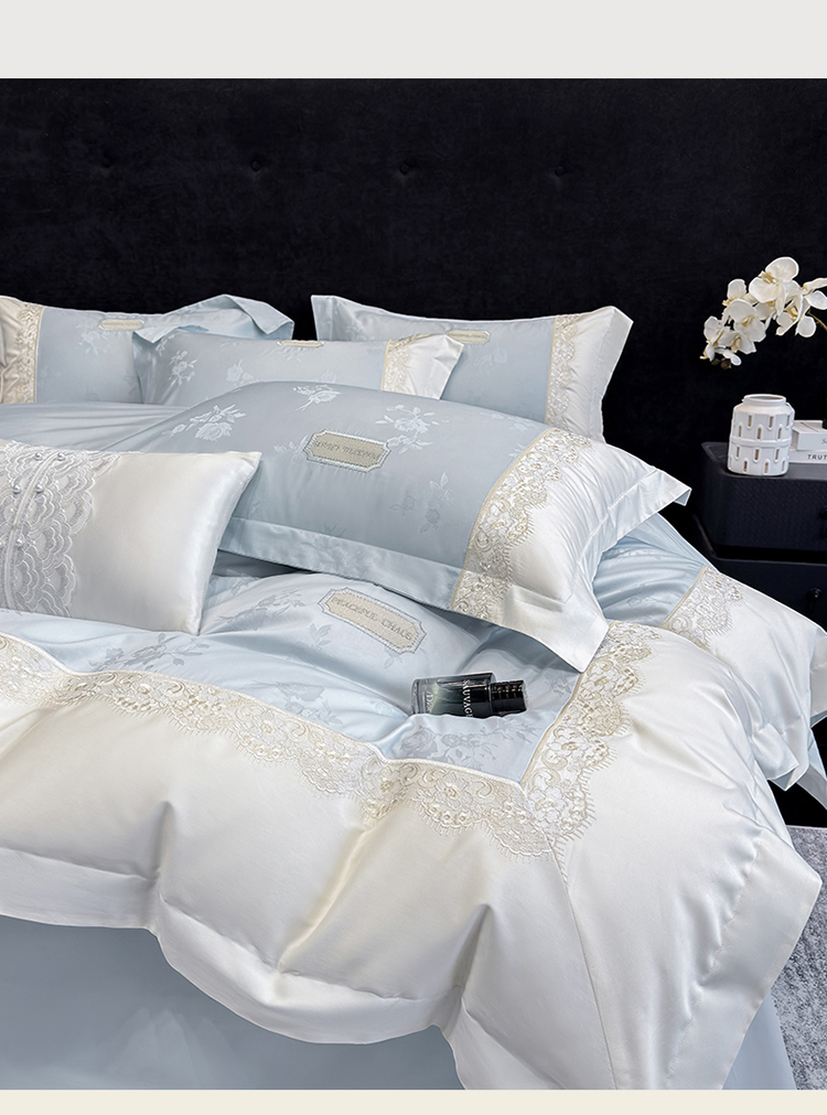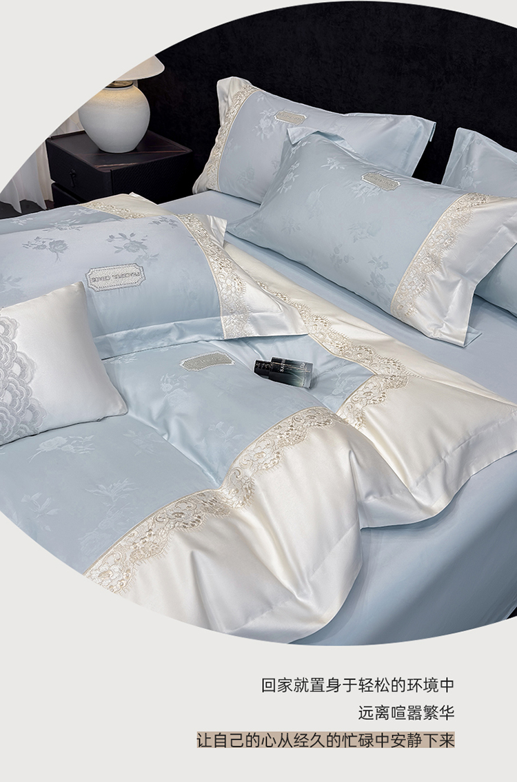 当前位置: 91家纺网 > 商品网购 > 床品套件 > 四件套 > 贡缎全棉四件套 > (总)高档礼盒装50S双股100支色织空气提花长绒棉+法式蕾丝刺绣100%全棉纯棉高级四件套床单床笠款