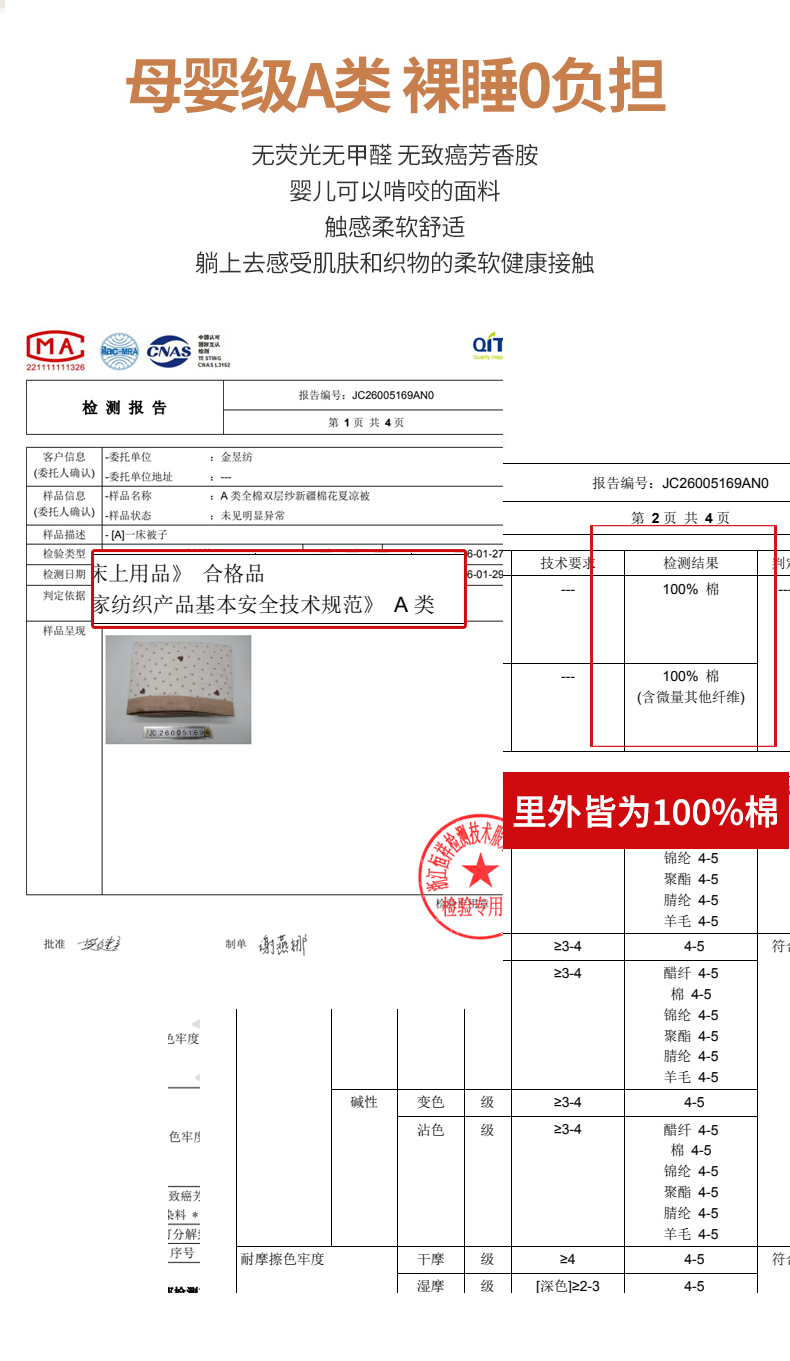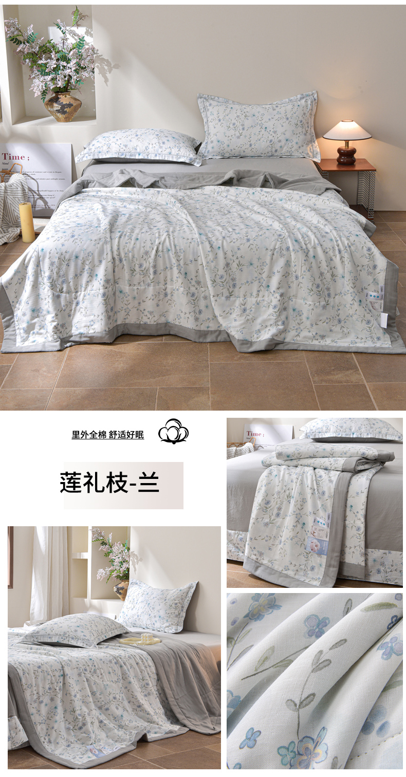 当前位置: 91家纺网 > 商品网购 > 被子 > 夏被 > 金昱纺 2026新款A类全棉双层纱新疆棉花夏被四件套(带检测报告,包检测,有微信+买家秀) 莲礼枝-兰