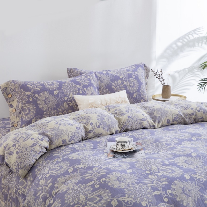 商品名称:(总)仰望棉麻双层纱供应链 2026春夏新款紫色全棉纯棉色织提花双层纱纽扣款四件套