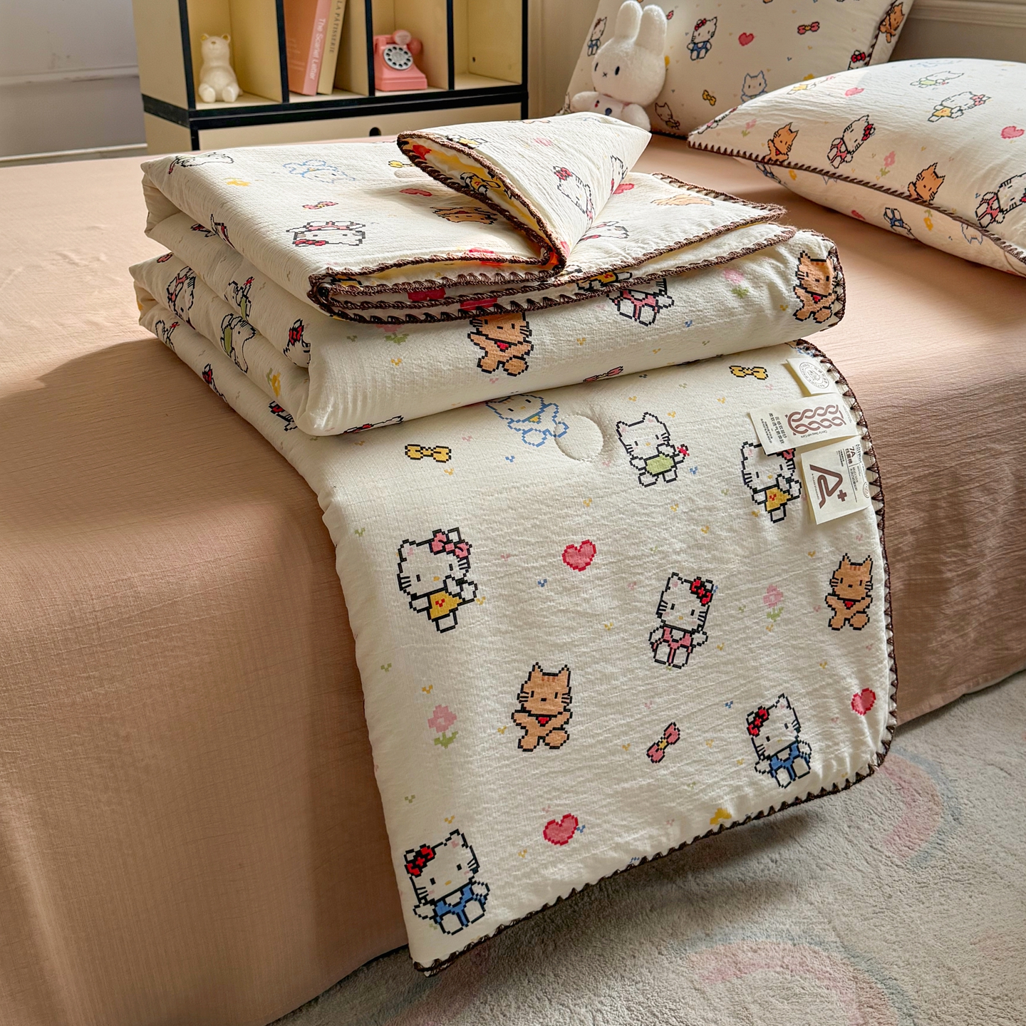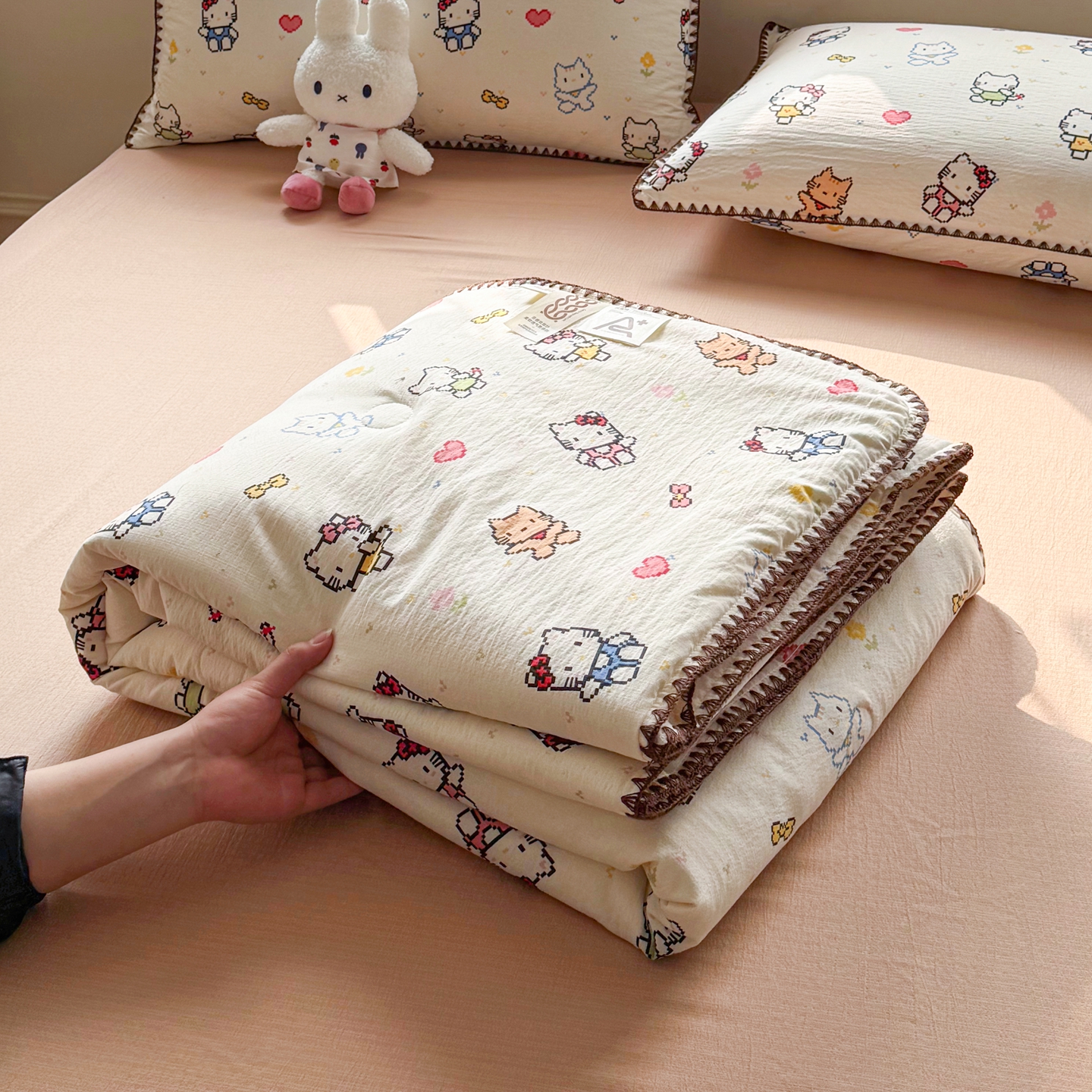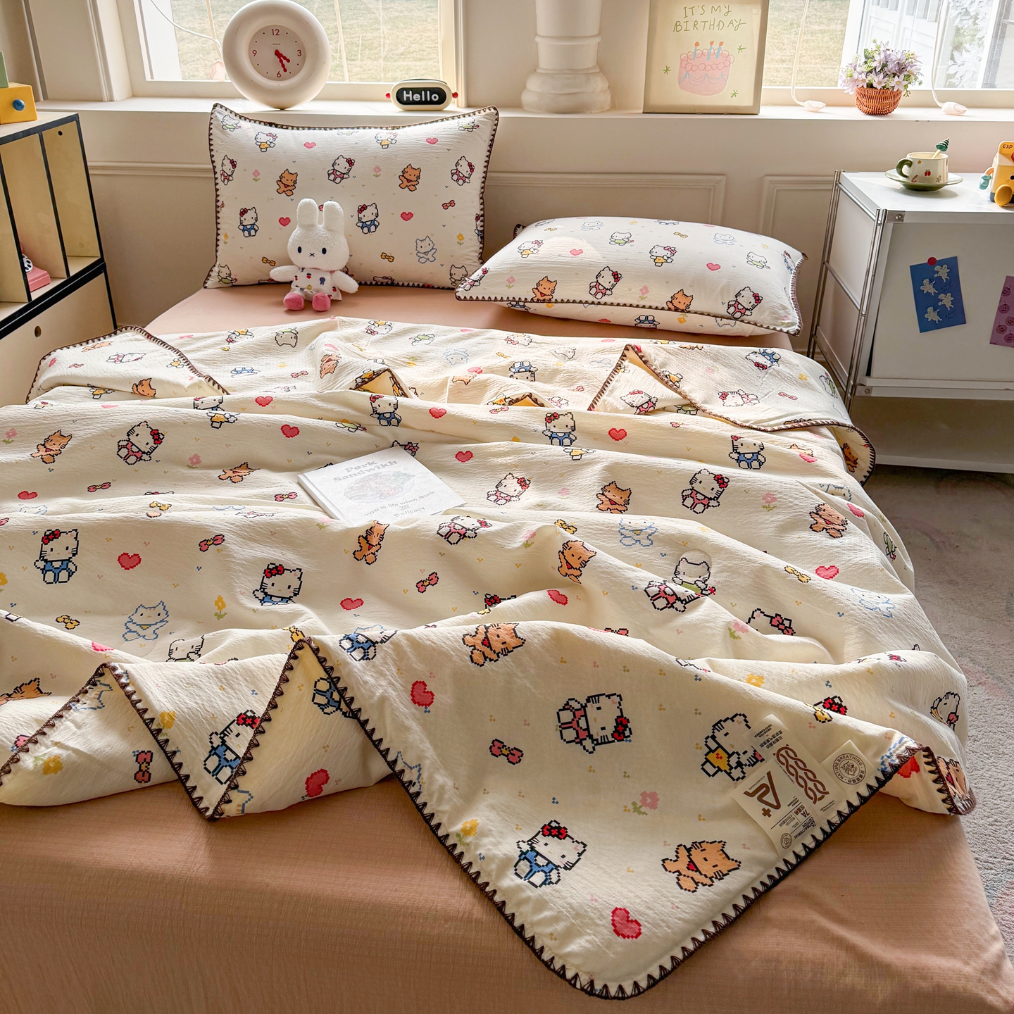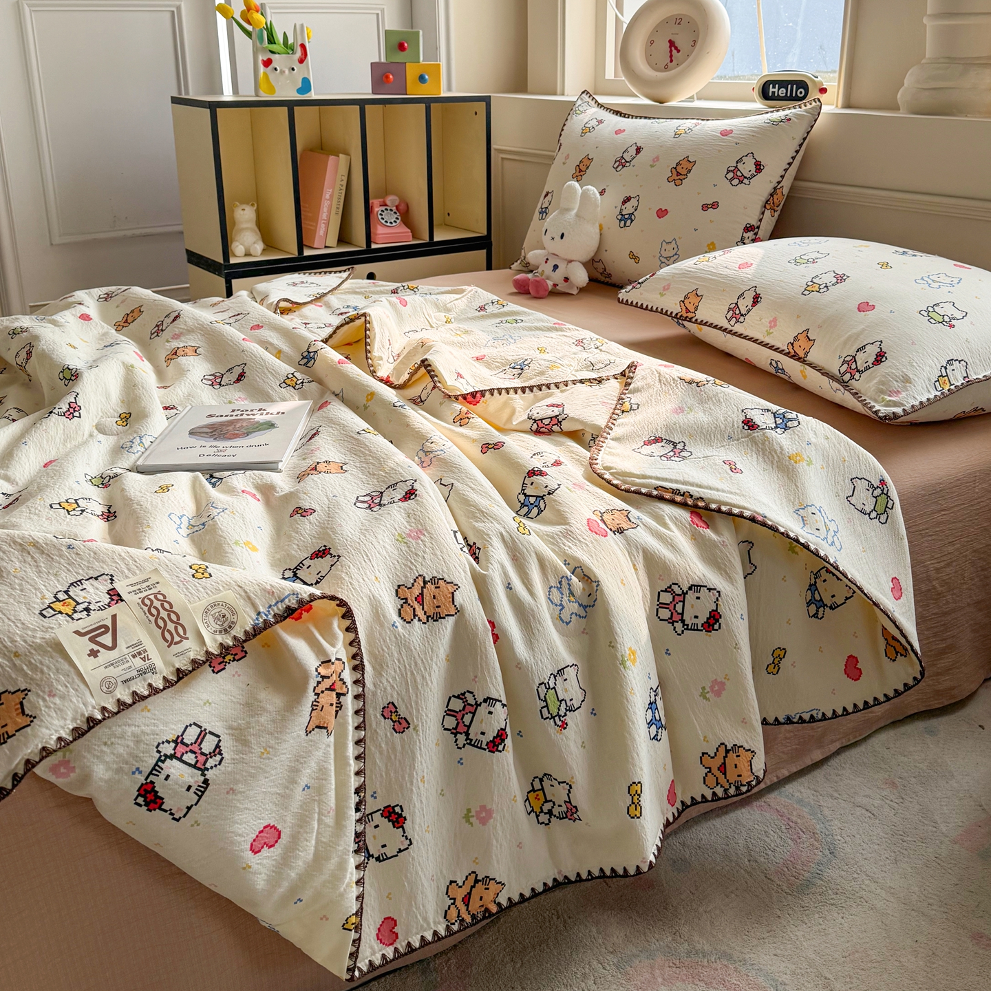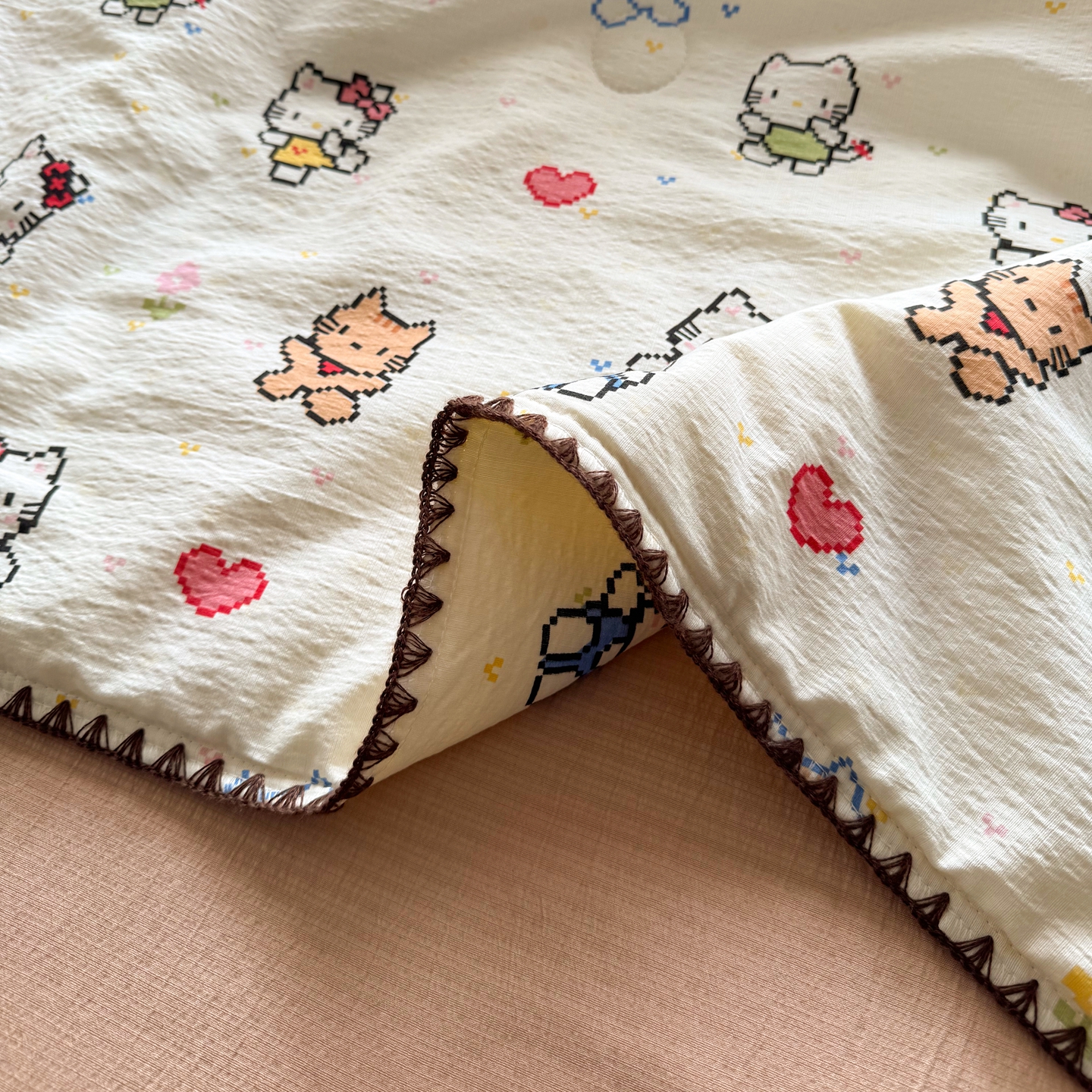 当前位置: 91家纺网 > 商品网购 > 床品套件 > 四件套 > 夏被四件套 > 2026新款春夏云感双层纱母婴级三角针夏被贝壳边夏凉被贝壳绣 像素小猫