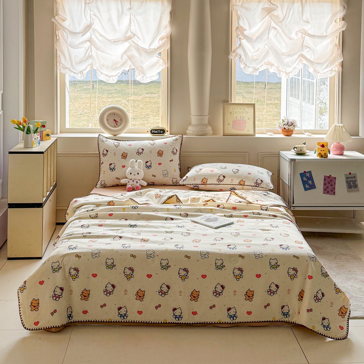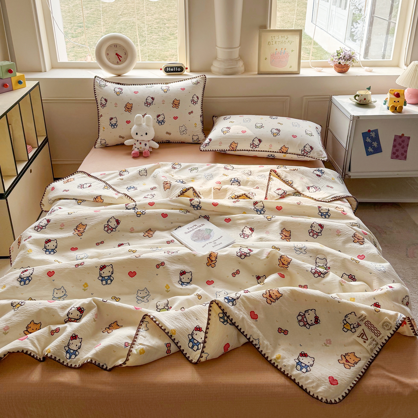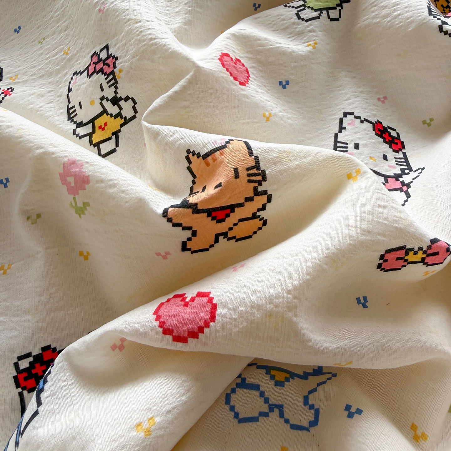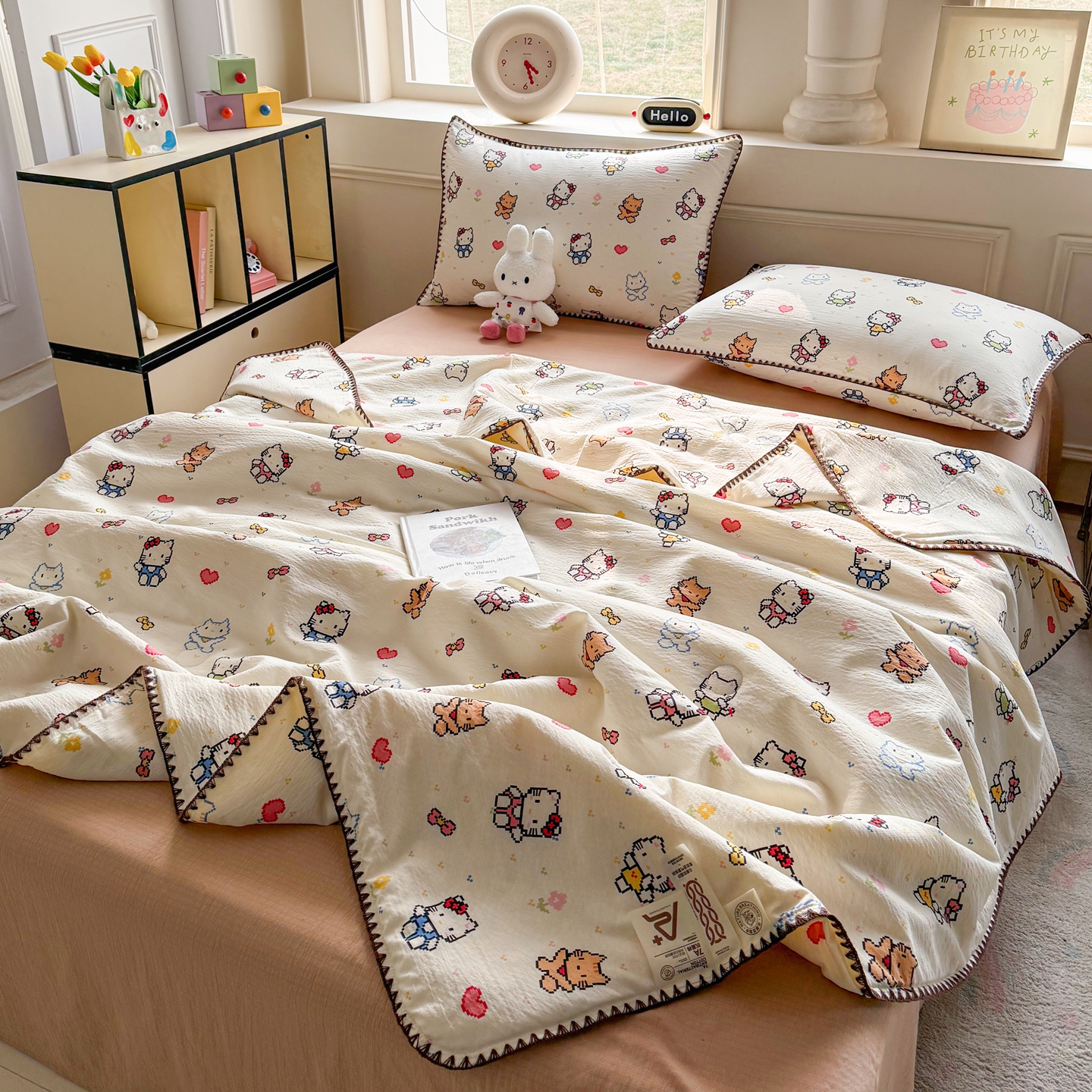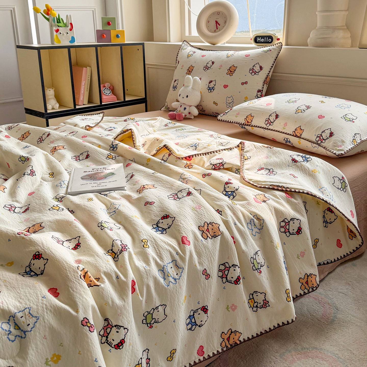当前位置: 91家纺网 > 商品网购 > 床品套件 > 四件套 > 夏被四件套 > 2026新款春夏云感双层纱母婴级三角针夏被贝壳边夏凉被贝壳绣 像素小猫