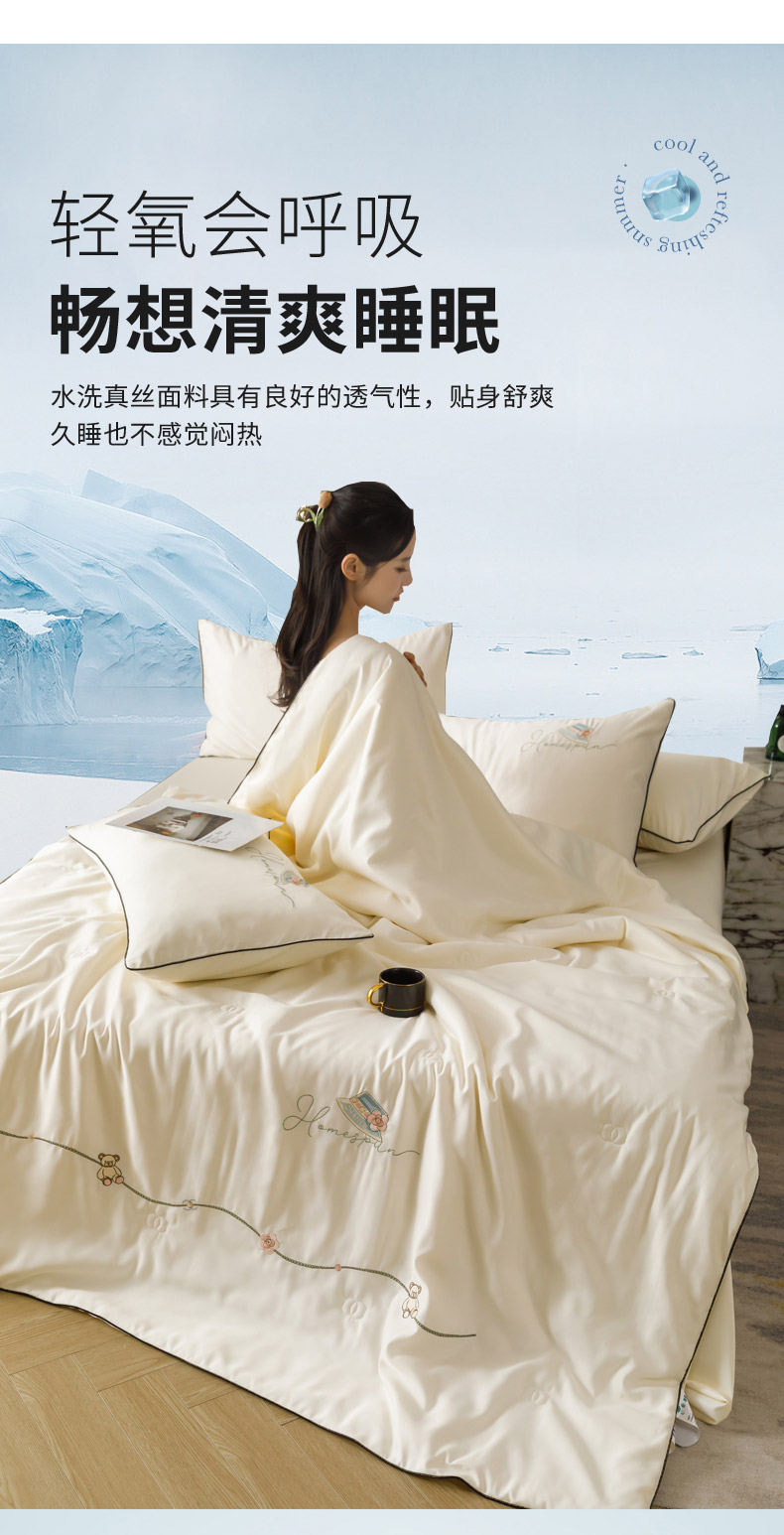 • 91家纺网 家纺一手货源 找家纺 (总)丝印良品 2026新款水洗真丝盛夏系列四件套单被套四件套,香槟深灰,宝石绿,北卡蓝,宾利蓝,粉玉香槟,高级灰,月光蓝,珍珠白
