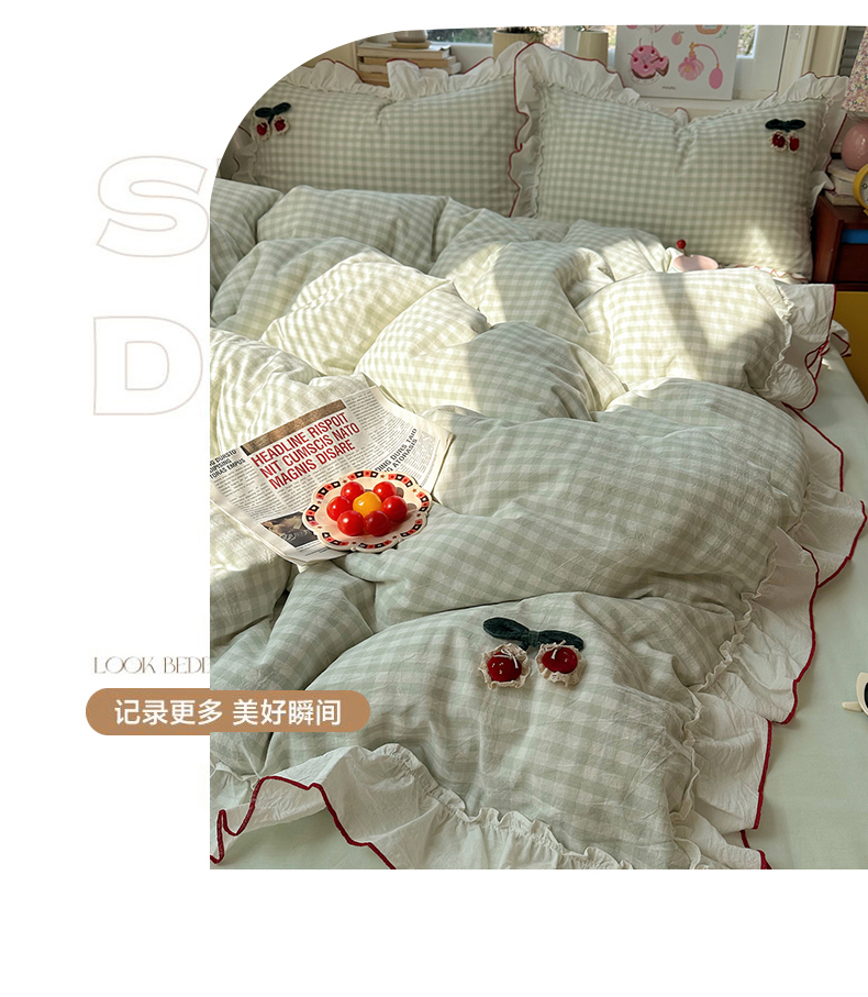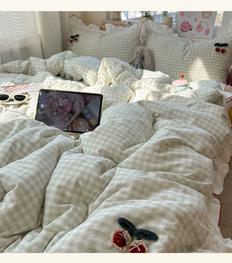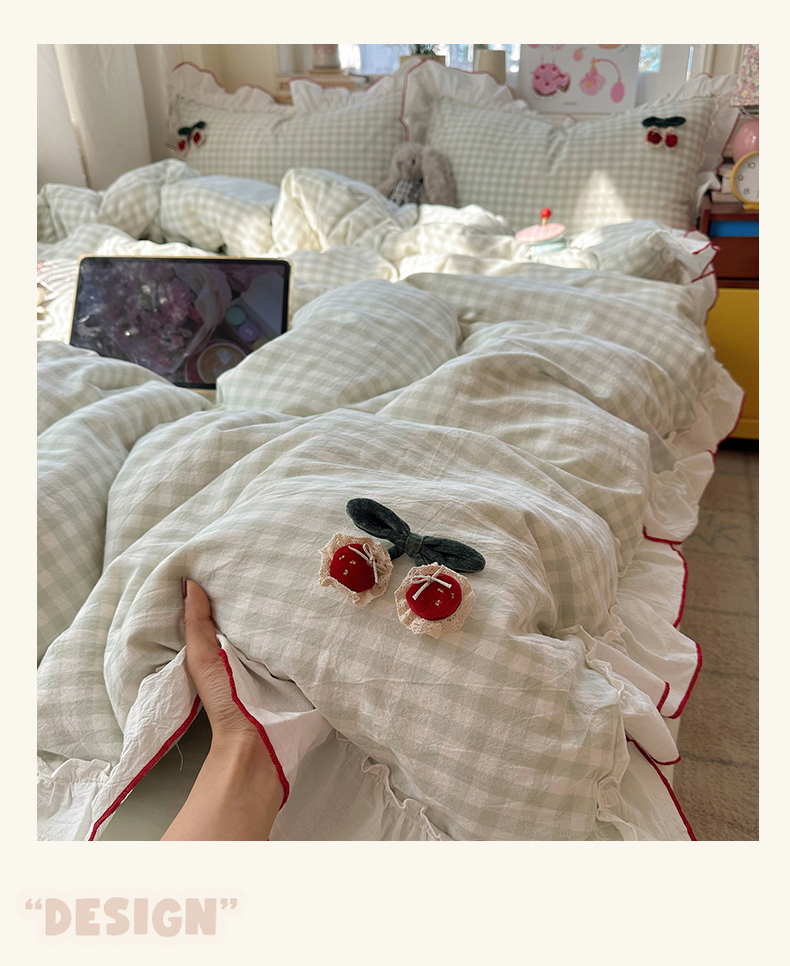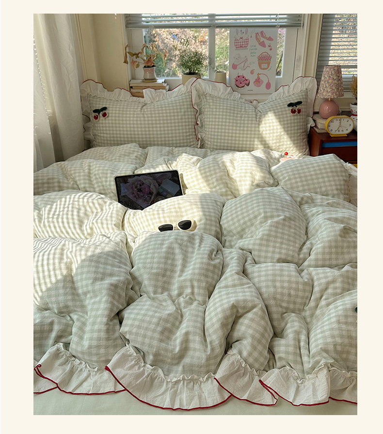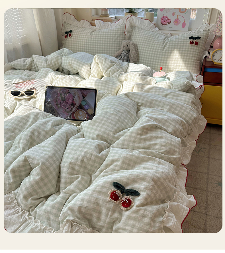 首尔家纺 2026新款全棉色织水洗棉四件套花边款小红书ins风-樱桃可露丽 樱桃可露丽-绿格