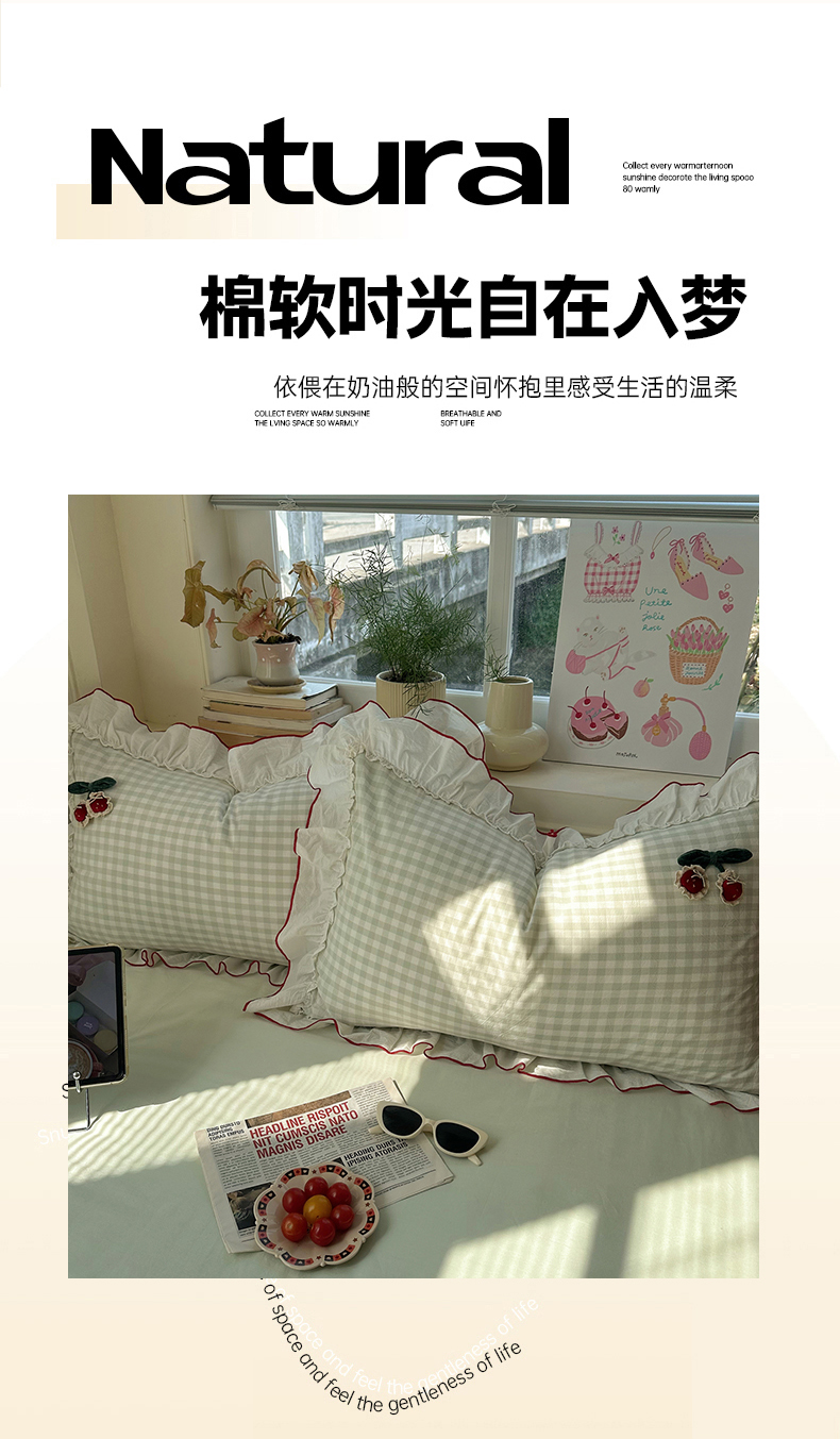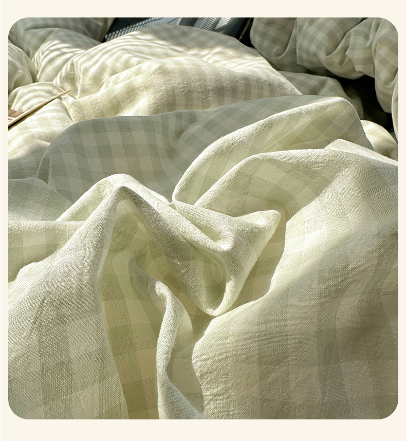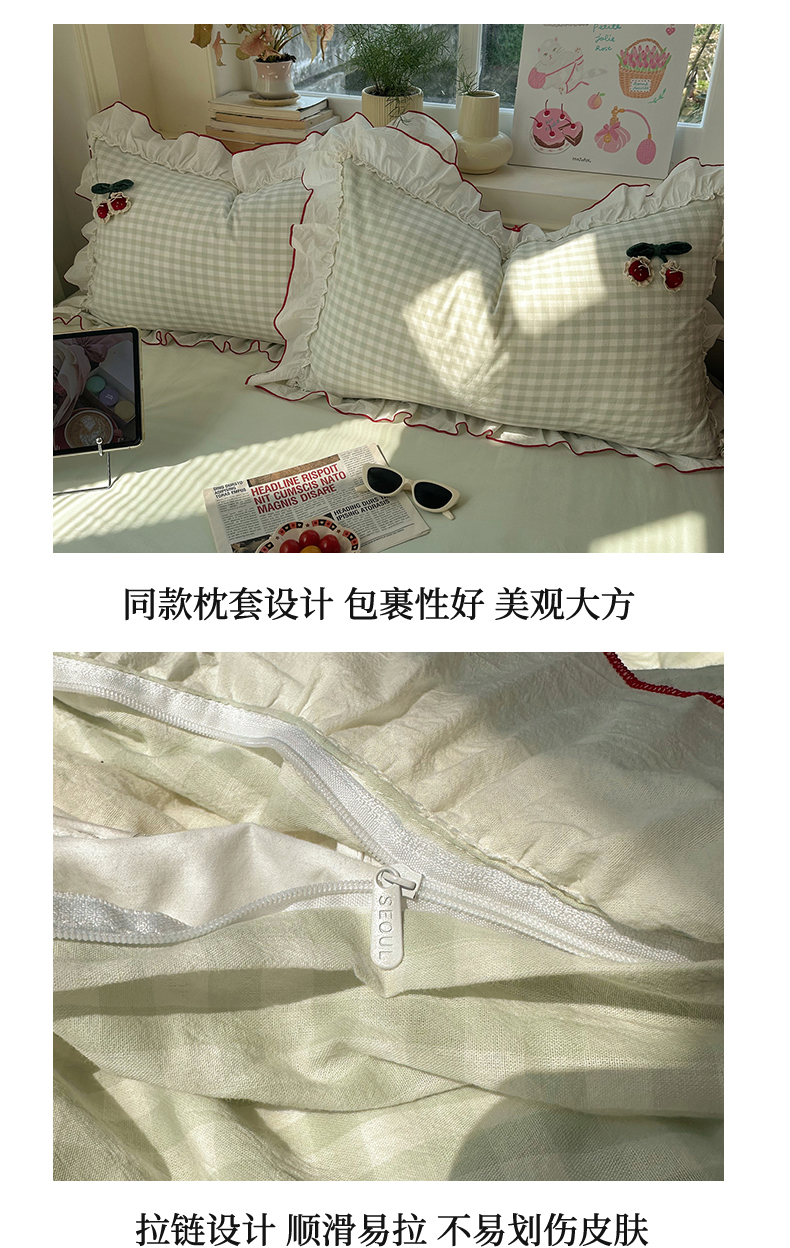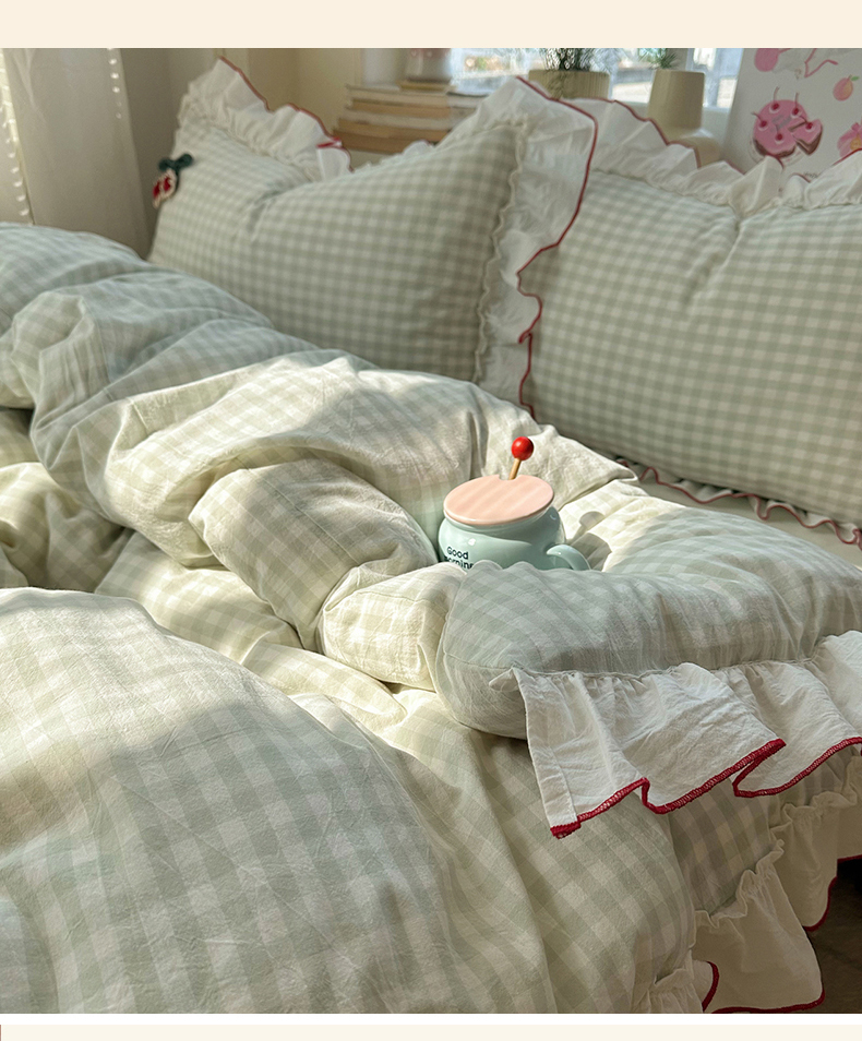 首尔家纺 2026新款全棉色织水洗棉四件套花边款小红书ins风-樱桃可露丽 樱桃可露丽-绿格
