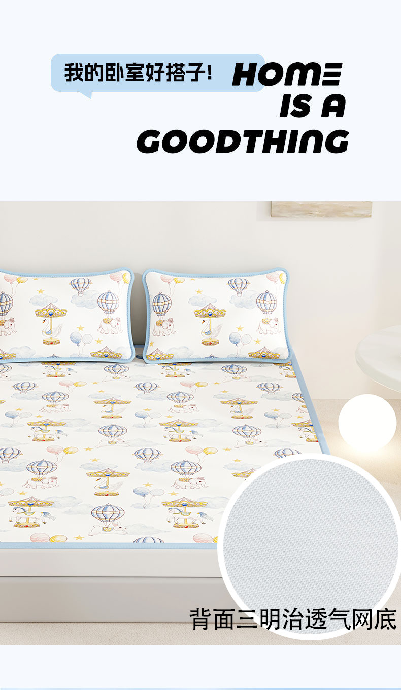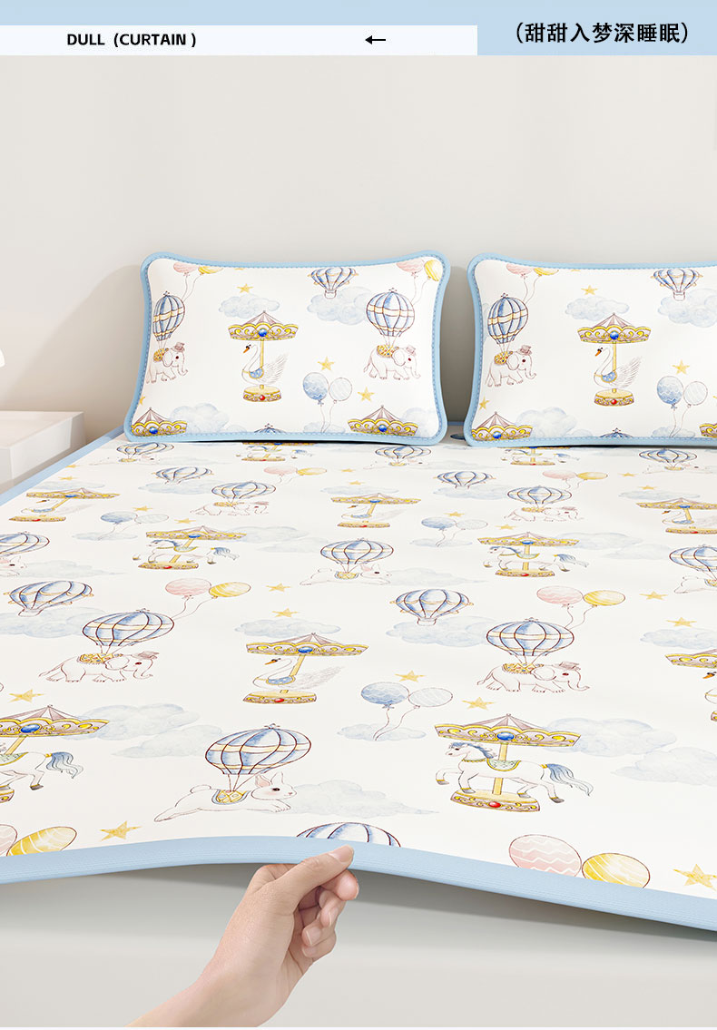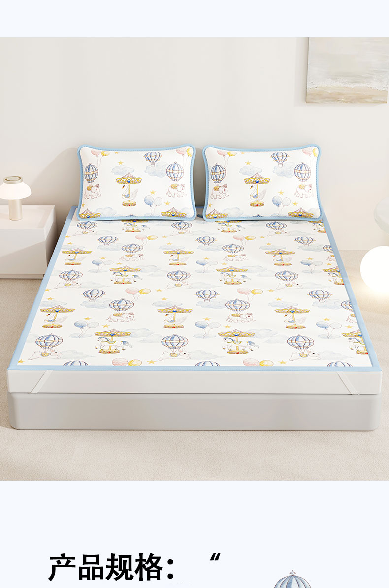 • 91家纺网 家纺一手货源 找家纺 奇丝雅 2026A类数码印花大版卡通冰丝凉席双人席可机洗学生宿舍空调软席三件套三明治网底 萌象木马