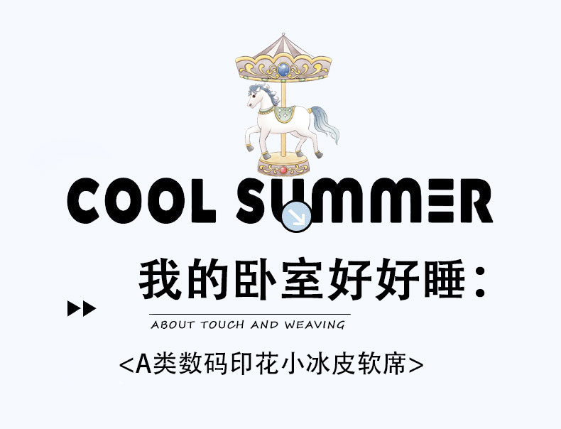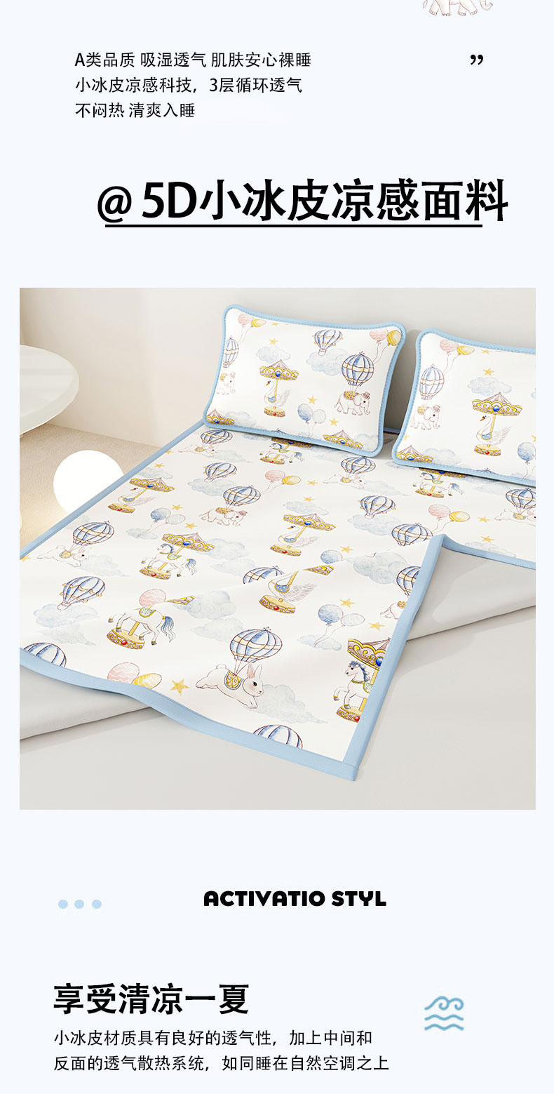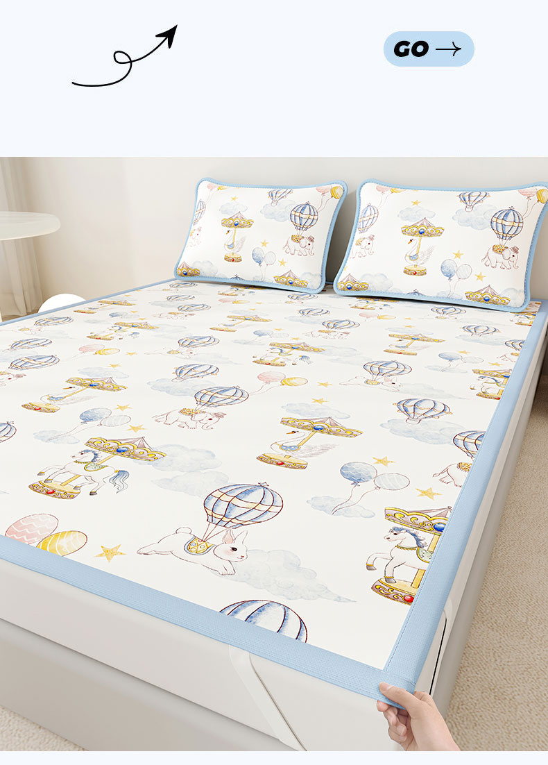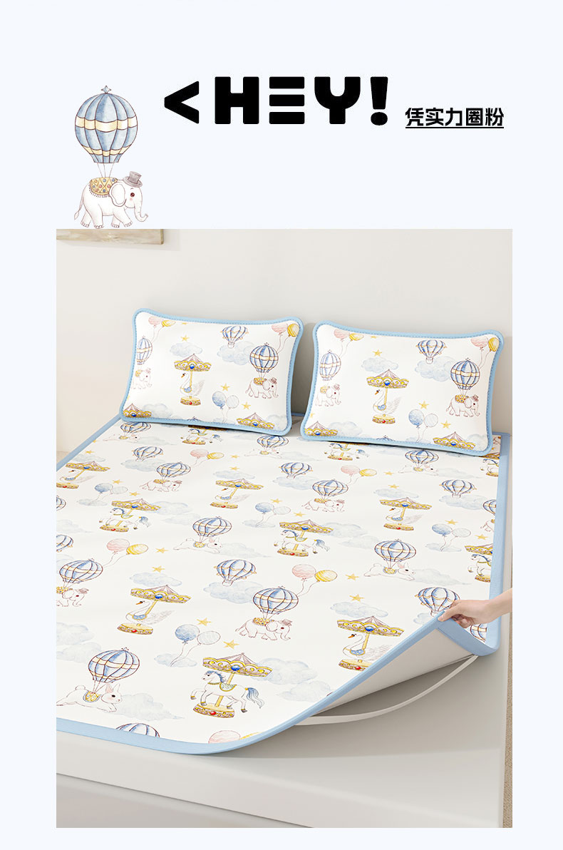 • 91家纺网 家纺一手货源 找家纺 奇丝雅 2026A类数码印花大版卡通冰丝凉席双人席可机洗学生宿舍空调软席三件套三明治网底 萌象木马