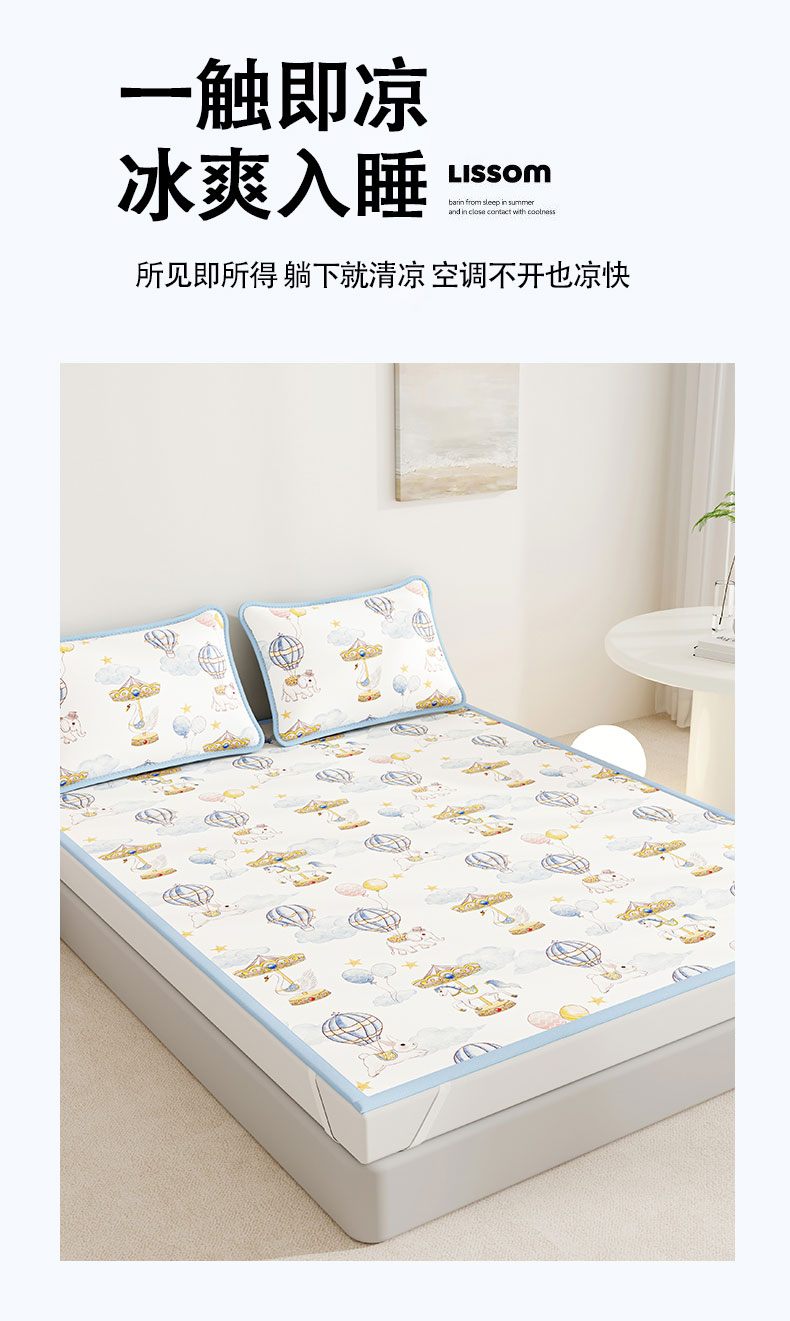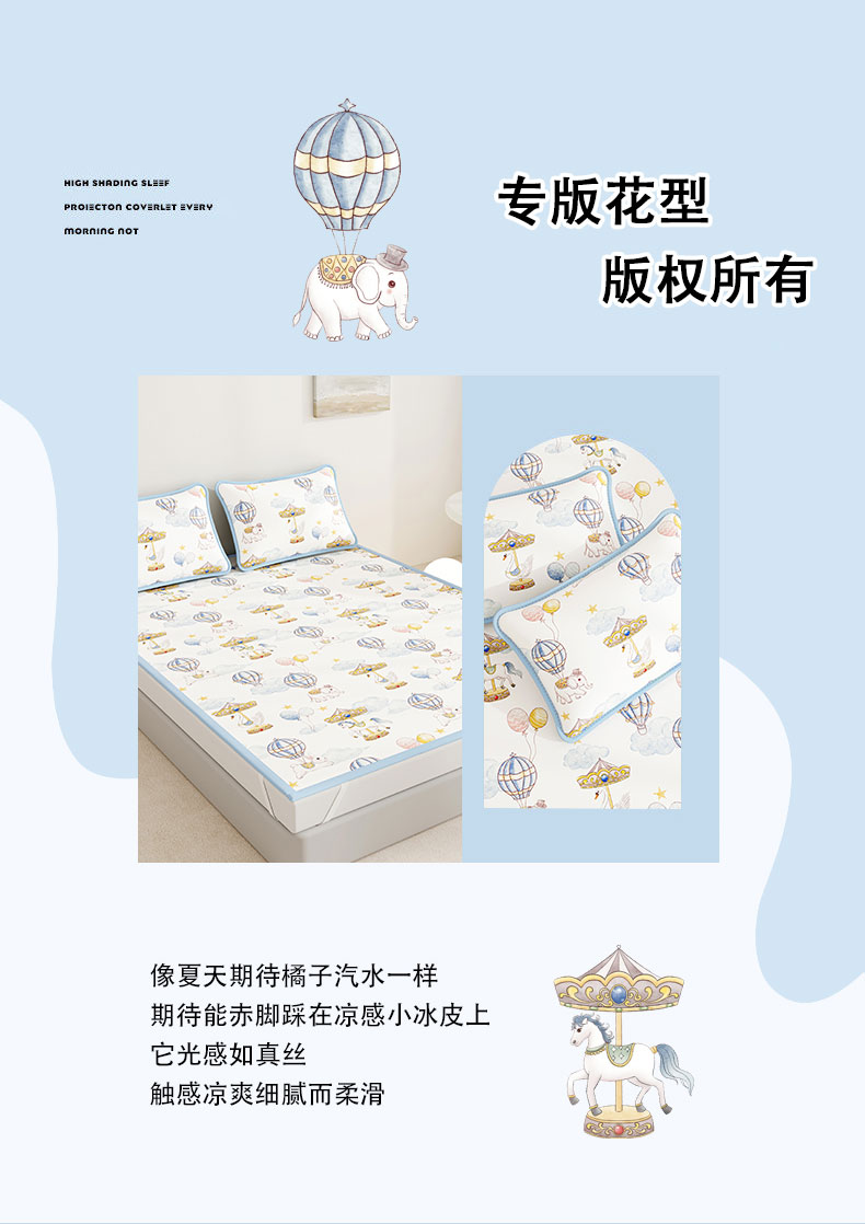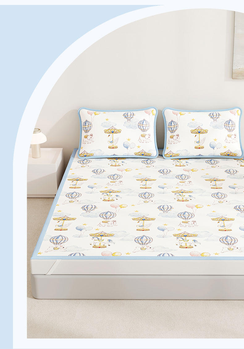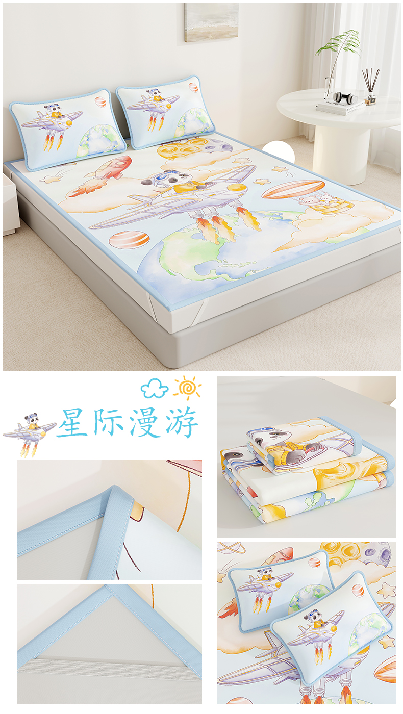 • 91家纺网 家纺一手货源 找家纺 (总)奇丝雅 2026A类数码印花大版卡通冰丝凉席双人席可机洗学生宿舍空调软席三件套三明治网底,海豚奇遇,呆萌恐龙,动物乐园,精灵小兔,满天星辰,萌宝小火车,萌象木马,蘑菇城堡,星际漫游,月亮熊