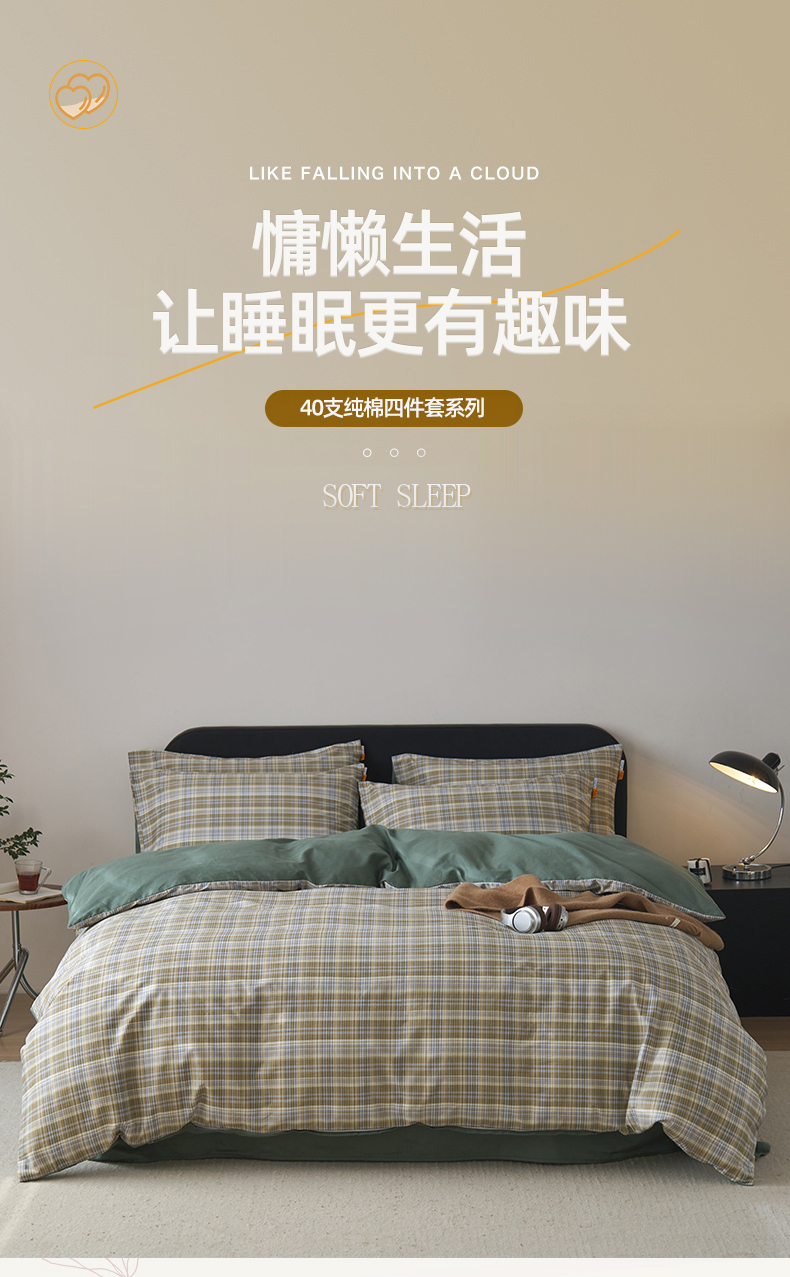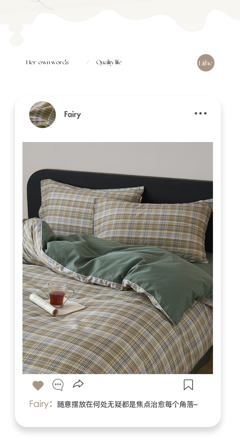 女子家纺 2026新款全棉13070简约格子系列四件套 抹茶格