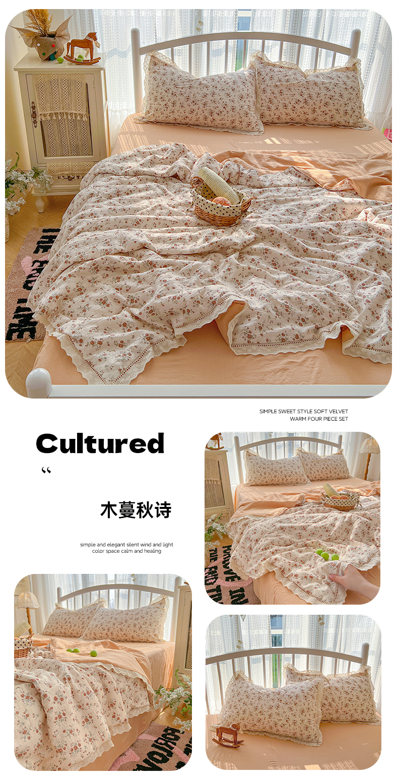 (总)港岛妹妹 2026新款仿棉云柔纱韩版双花边四件套,花边-知秋,花边-禾时,花边-花影,花边-桔夏,花边-萌兔花园,花边-葡萄园,花边-兔兔小姐,花边-兔薇薇,花边-小草莓,花边-樱桃枝枝,花边-枝影,花边-枝枝草莓