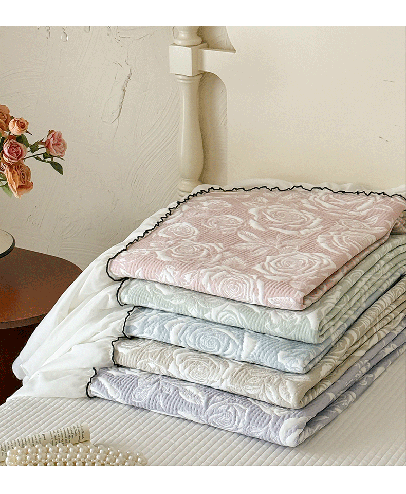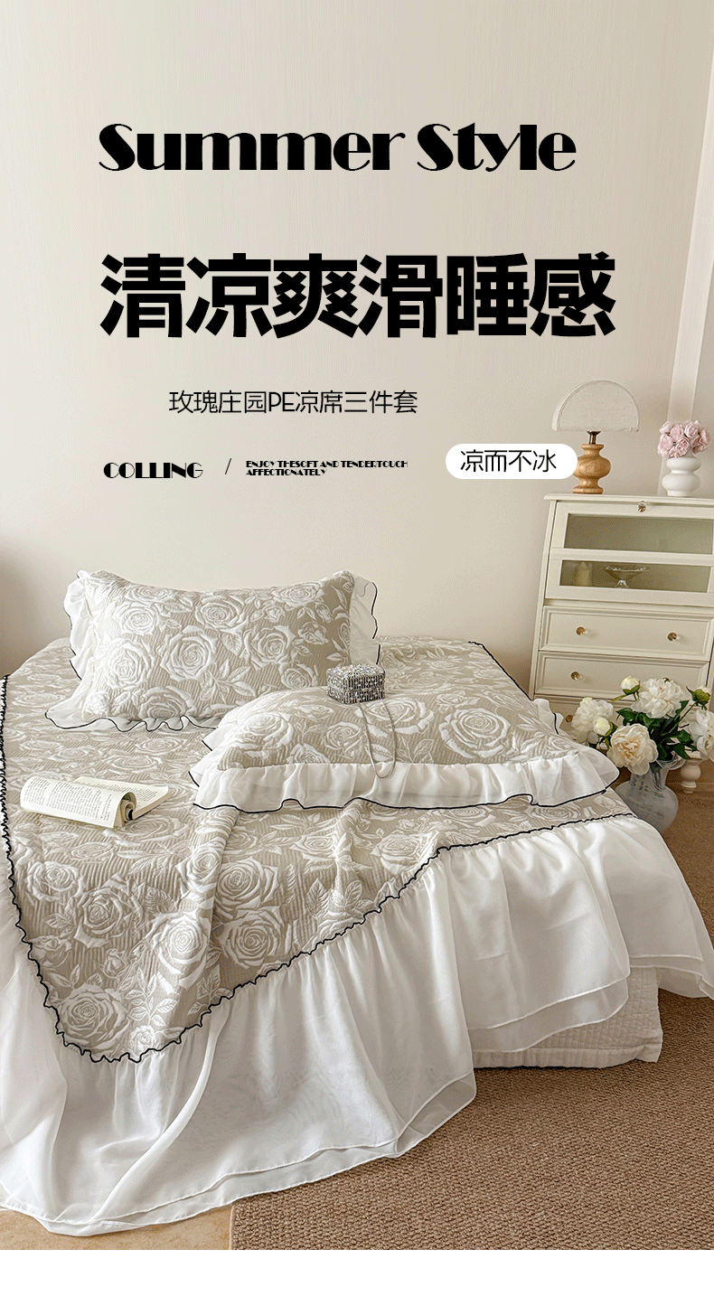 (总)吾欢心 2026新款法式凉感530克高克重PE乙纶双面大提花床裙凉席席子三件套-玫瑰庄园