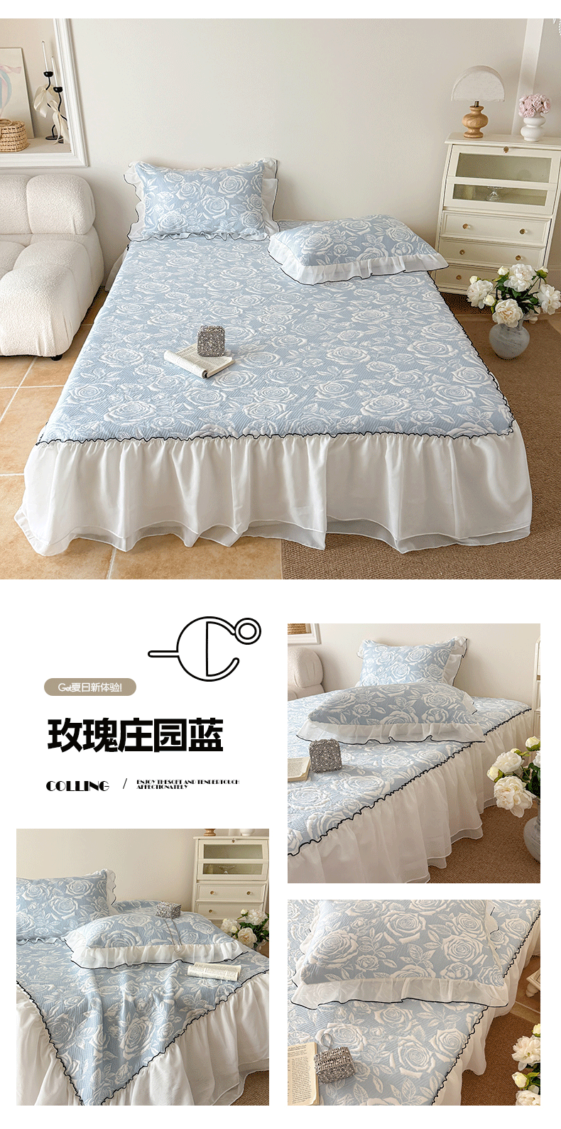 商品名称:(总)吾欢心 2026新款法式凉感530克高克重PE乙纶双面大提花床裙凉席席子三件套-玫瑰庄园