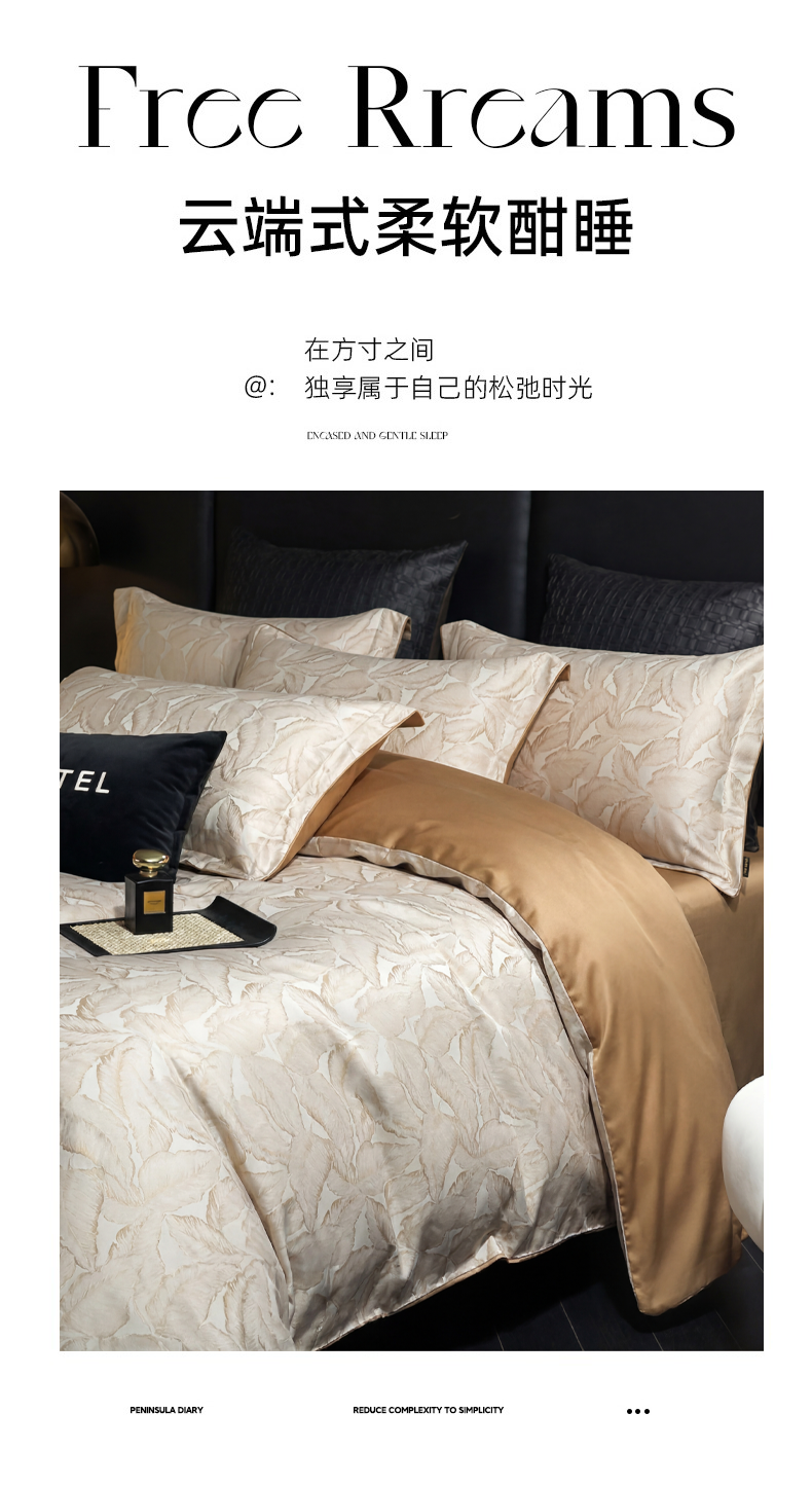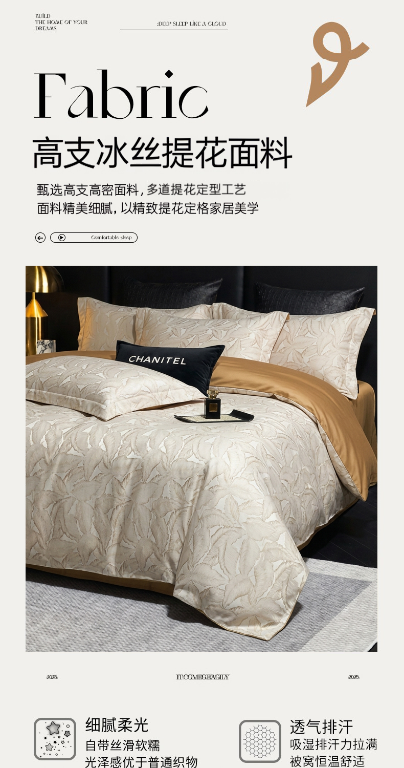 (总)悦织湾家纺 2026新款水洗冰丝贡缎提花亲肤四件套春夏凉爽床上用品四件套,铂雅金樽,墨影灰羽,奶雾羽光,青岚雅序,青羽松影,琼华锦序,玄墨疏影,银羽清辉,紫雾羽痕,棕羽鎏金