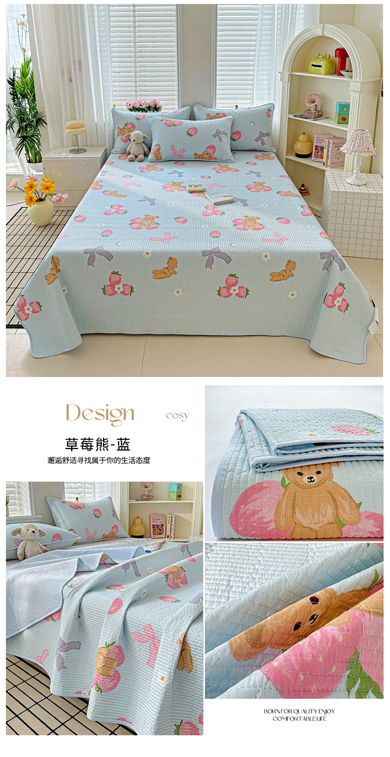 文黛家居 2026新款全棉夹棉印花床盖三件套 草莓熊-蓝