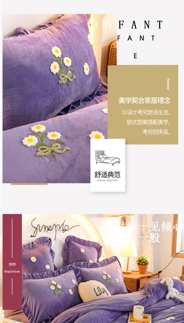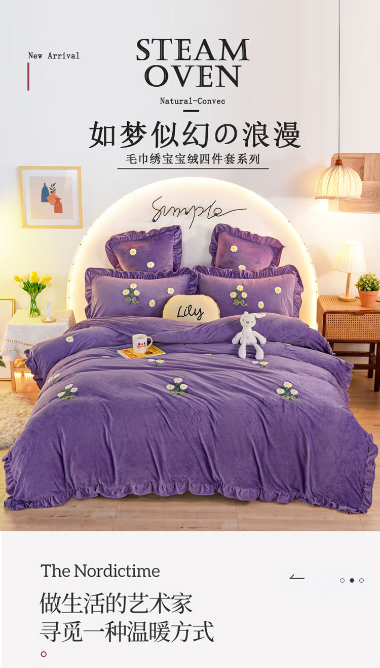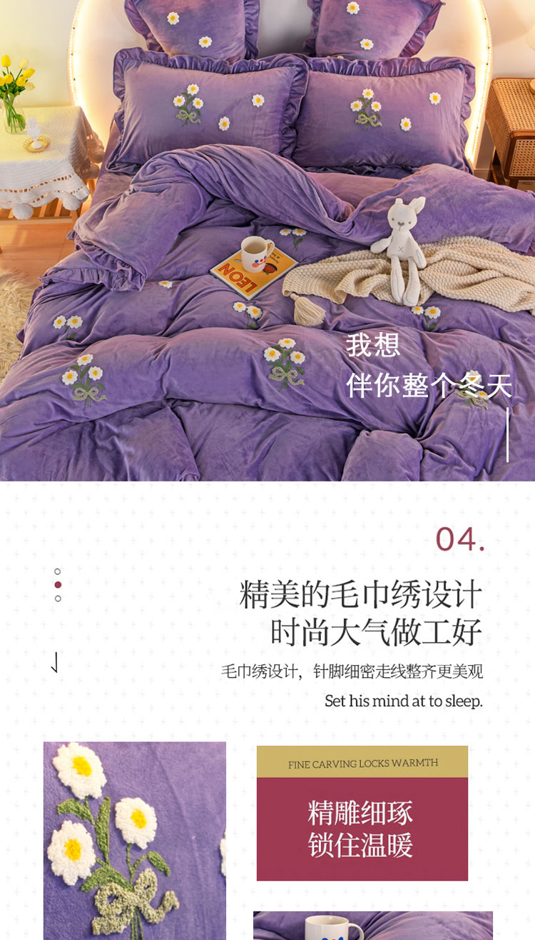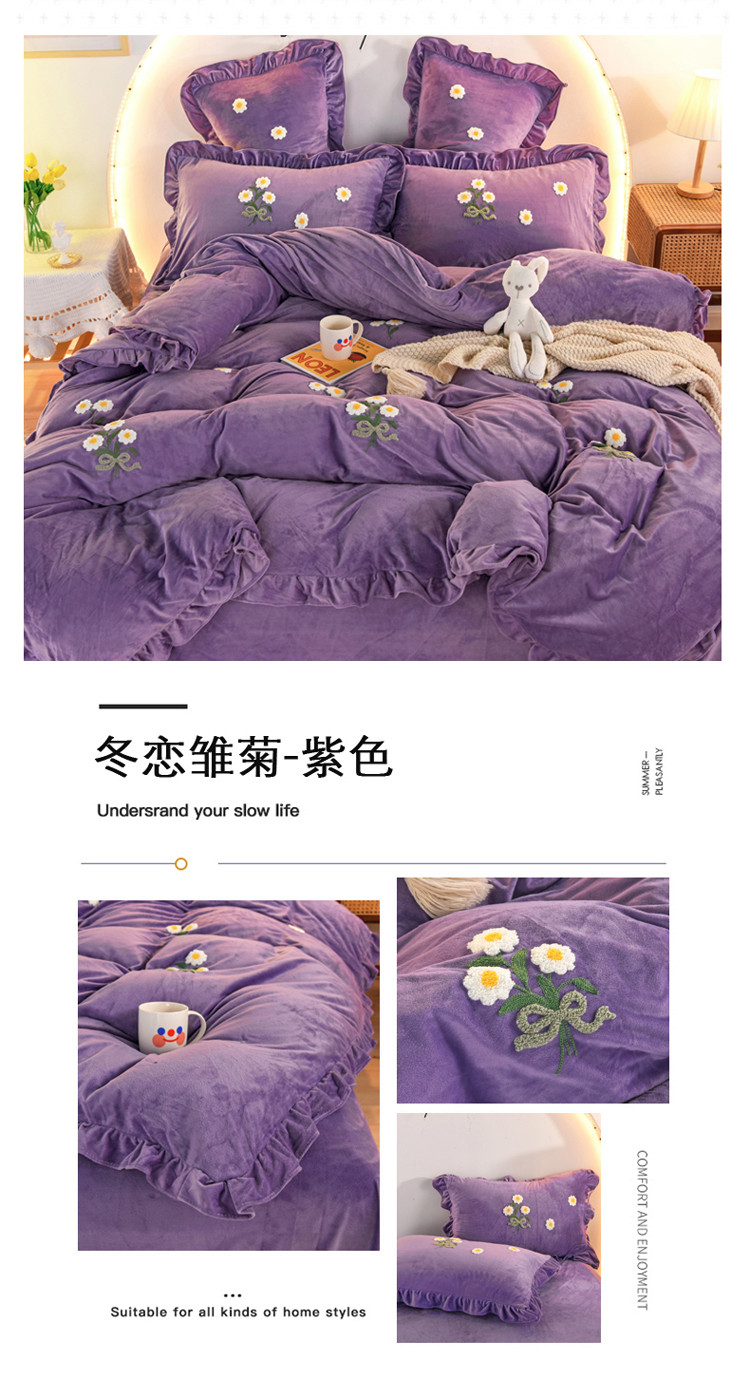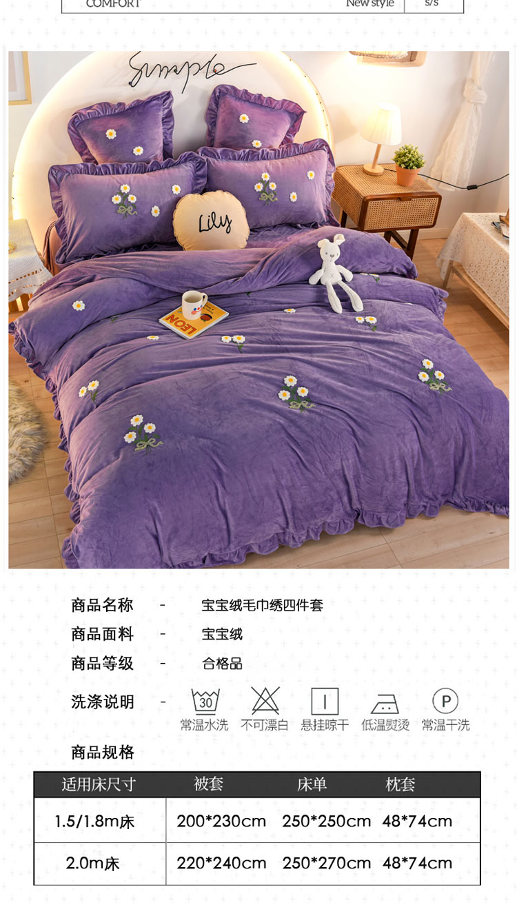 商品名称:唐人居 2025新款宝宝绒毛巾绣雏菊系列四件套冬恋雏菊-紫色