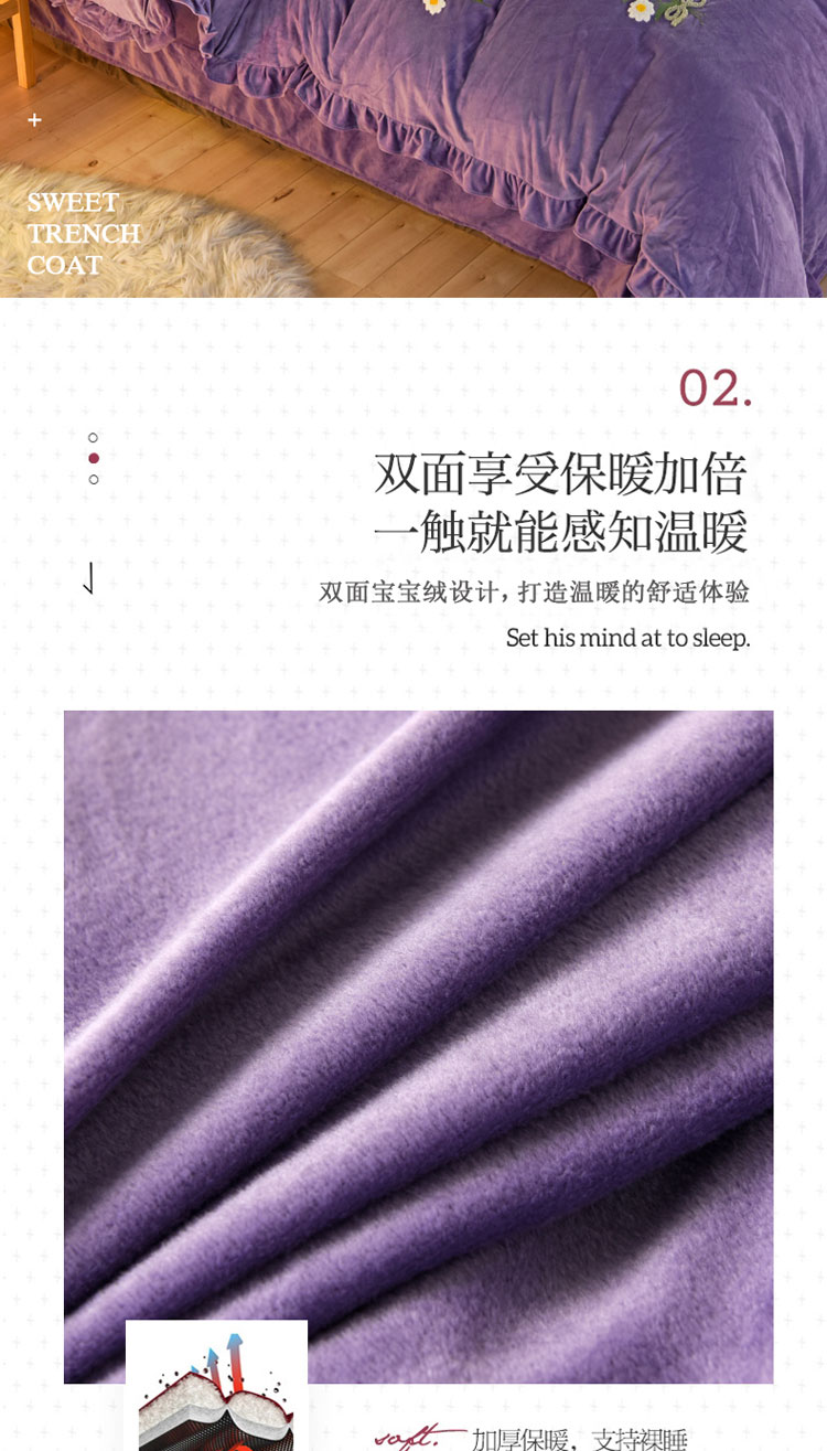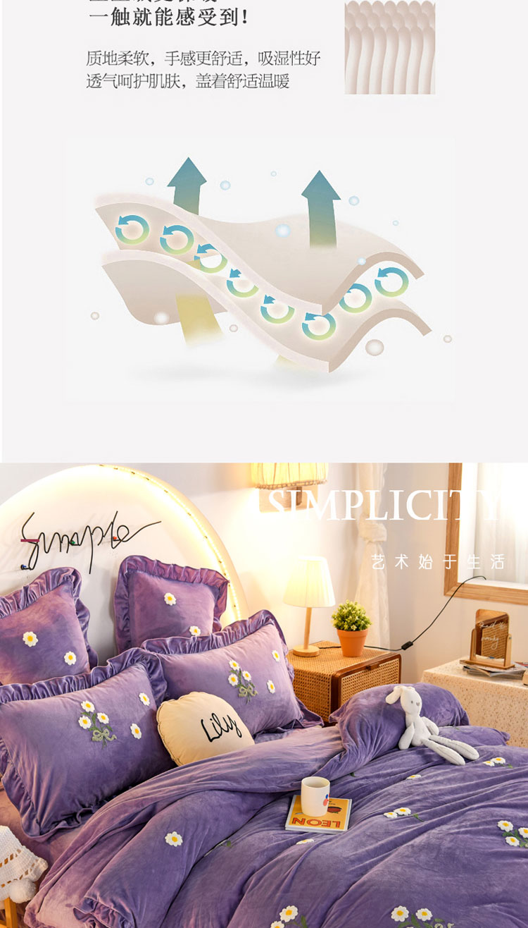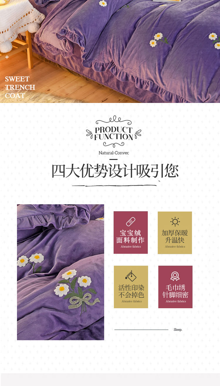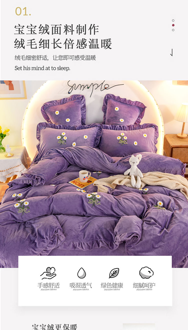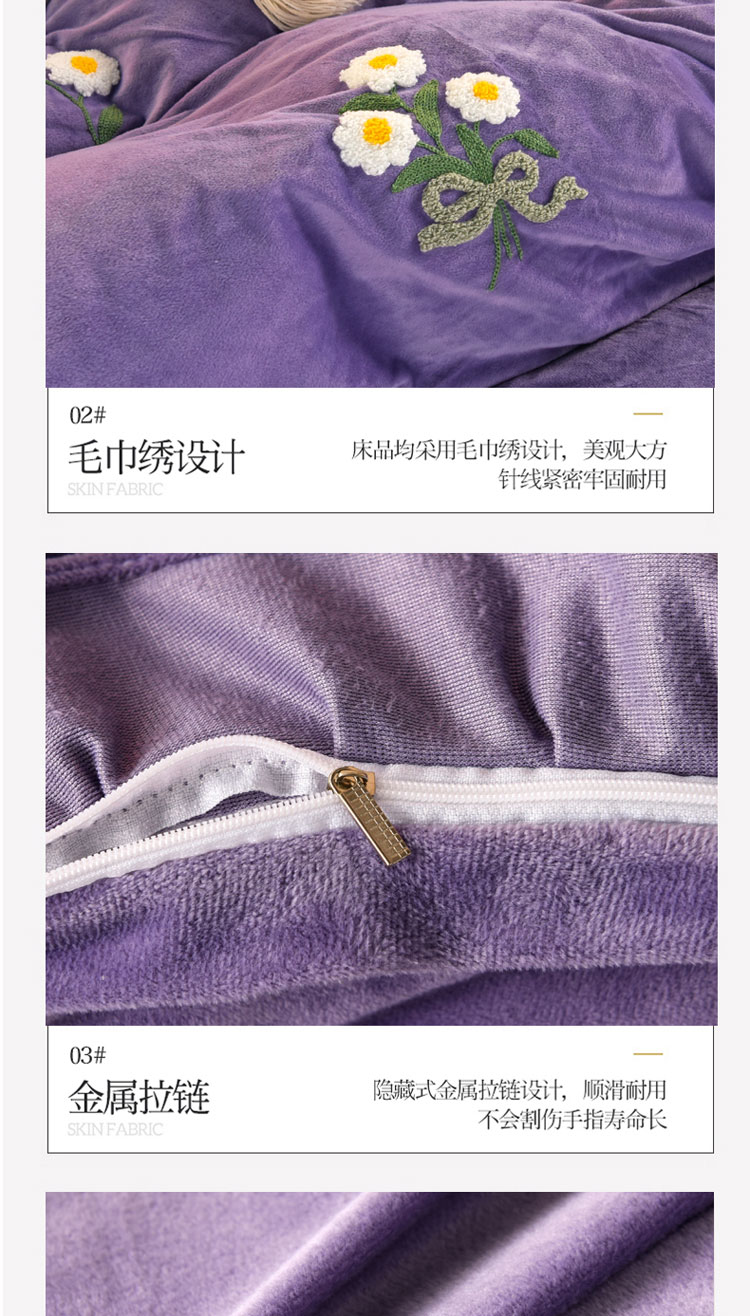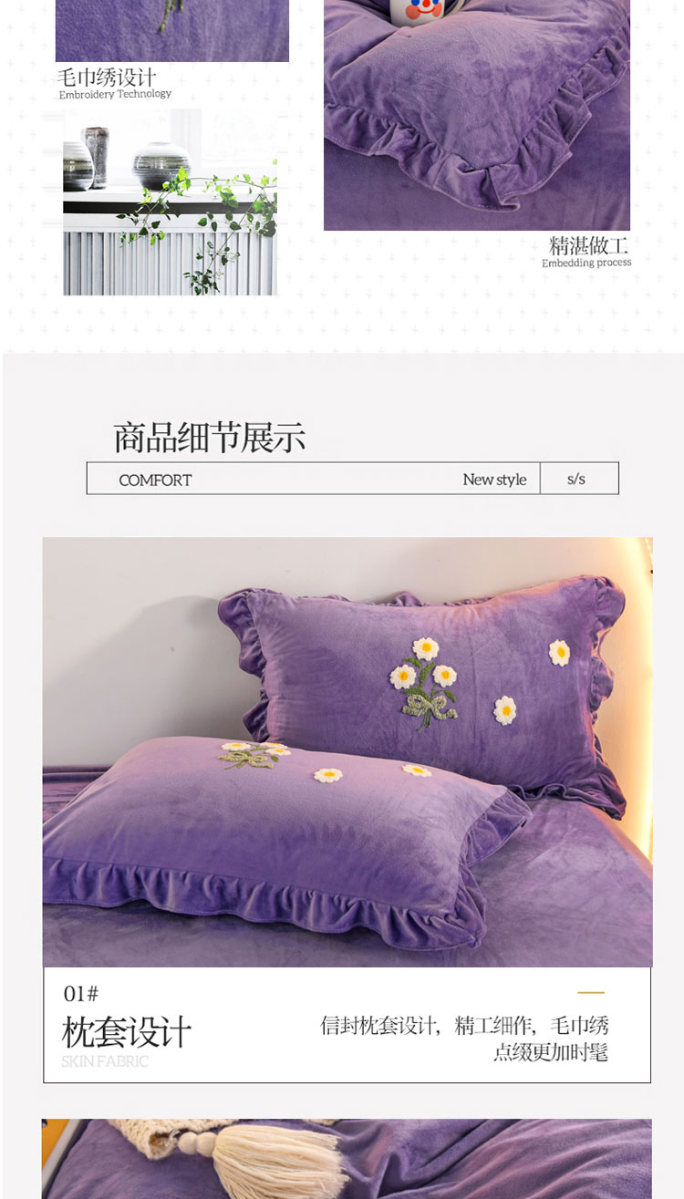 商品名称:唐人居 2025新款宝宝绒毛巾绣雏菊系列四件套冬恋雏菊-紫色
