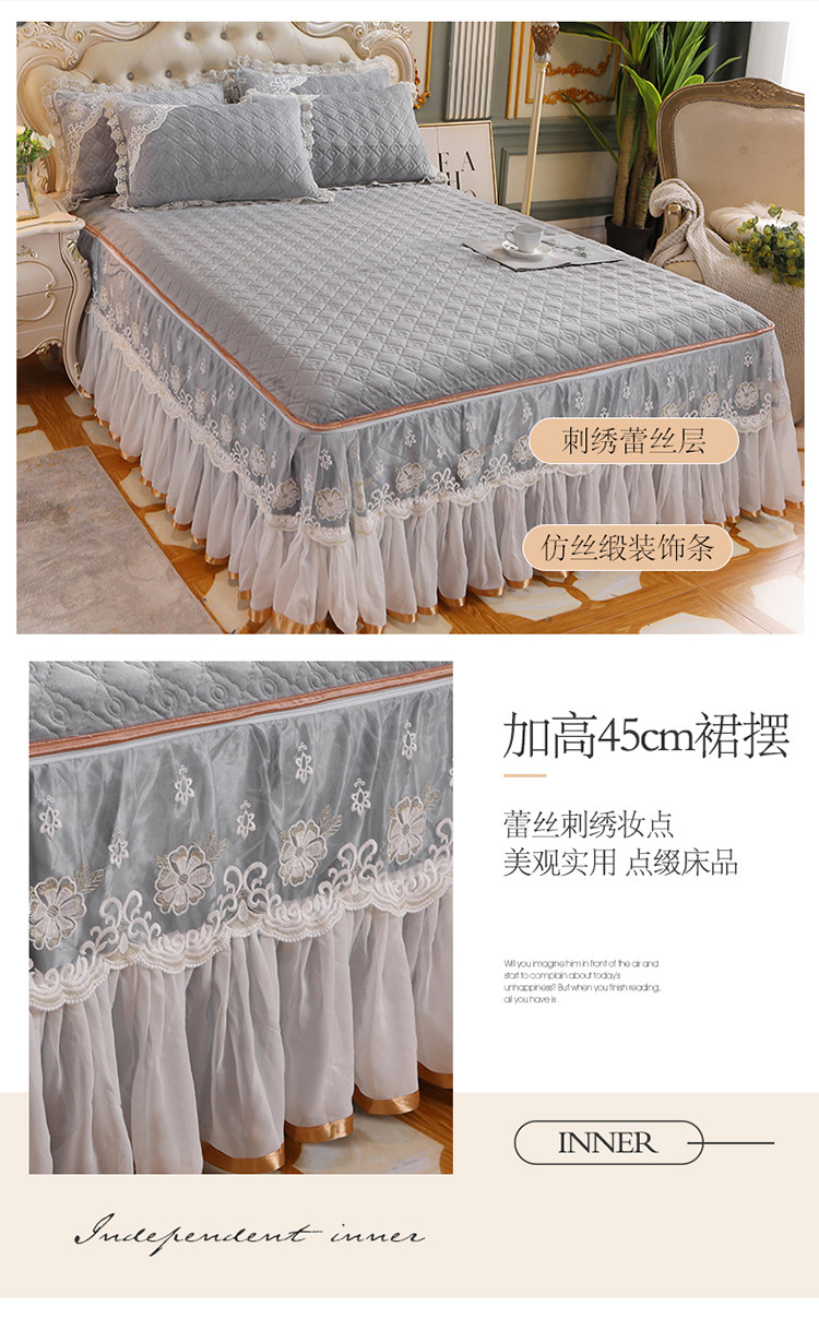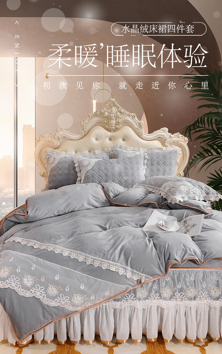 网红馆 2025新款水晶绒蕾丝床裙四件套 雅致灰