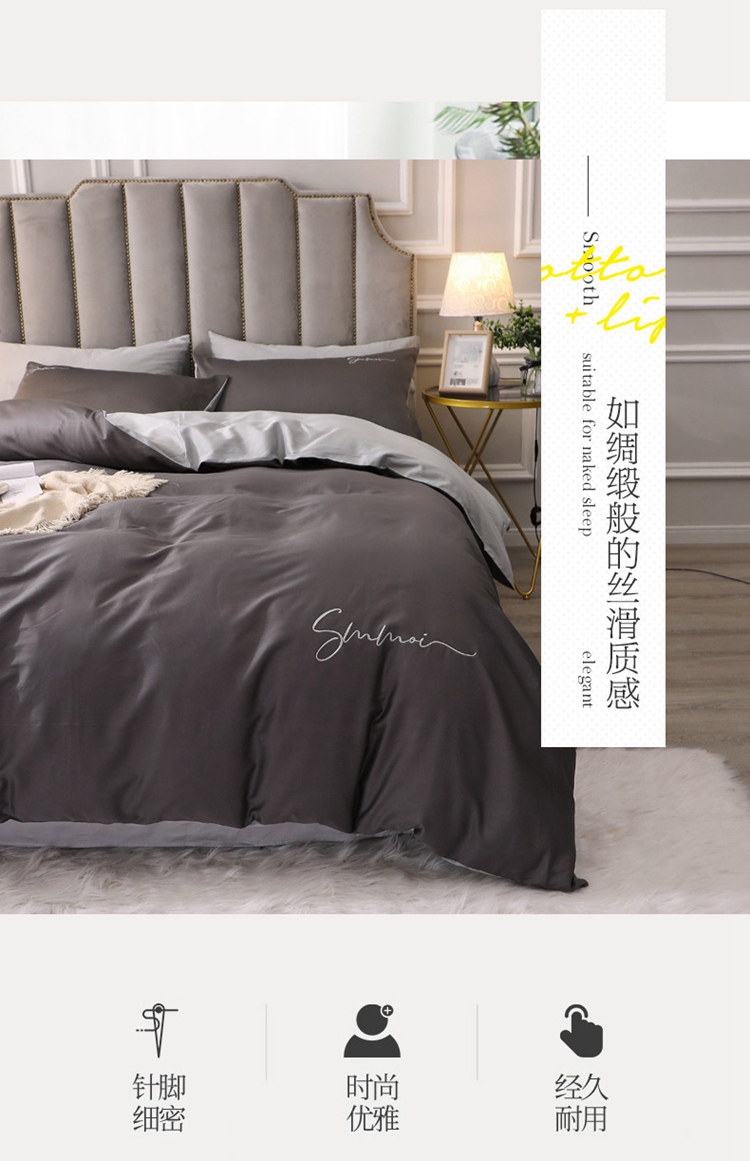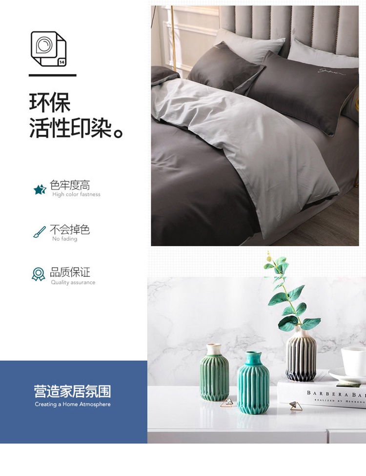 商品名称:2021新款纯色拼色纯棉全棉60S贡缎长绒棉绣花四件套 黑灰