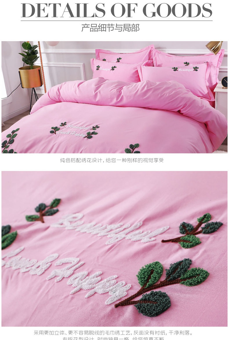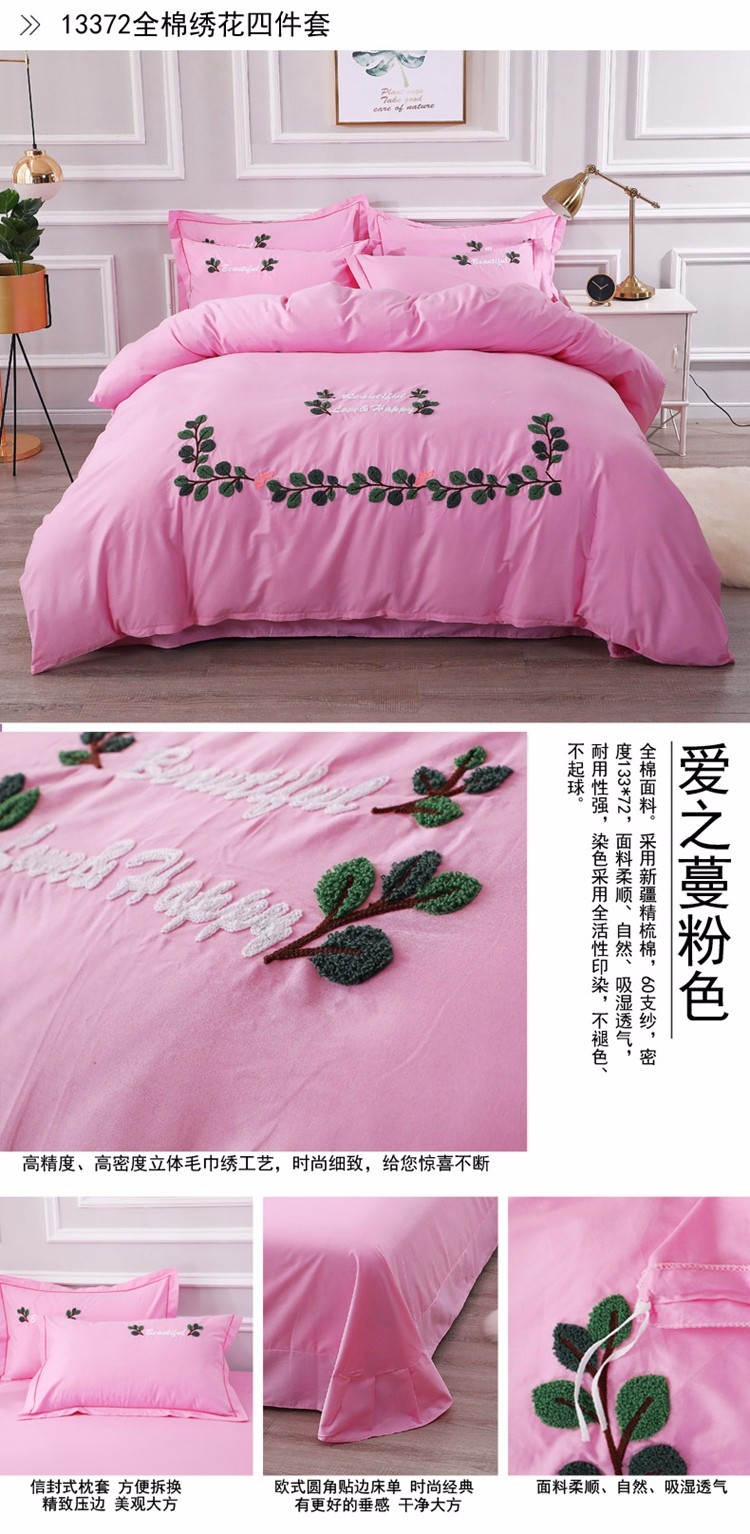 商品名称:2021新款全棉13372毛巾绣纯棉刺绣花四件套 爱之蔓粉色
