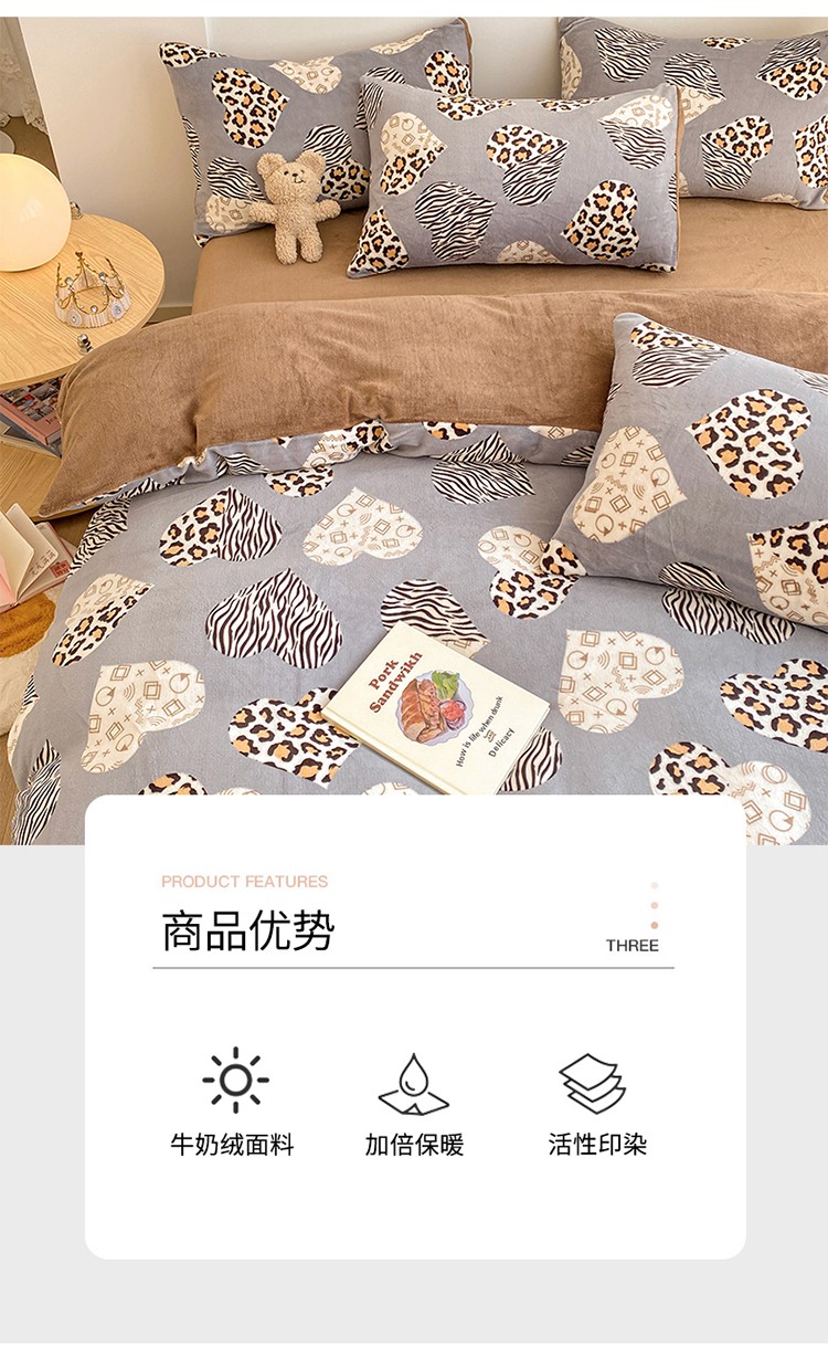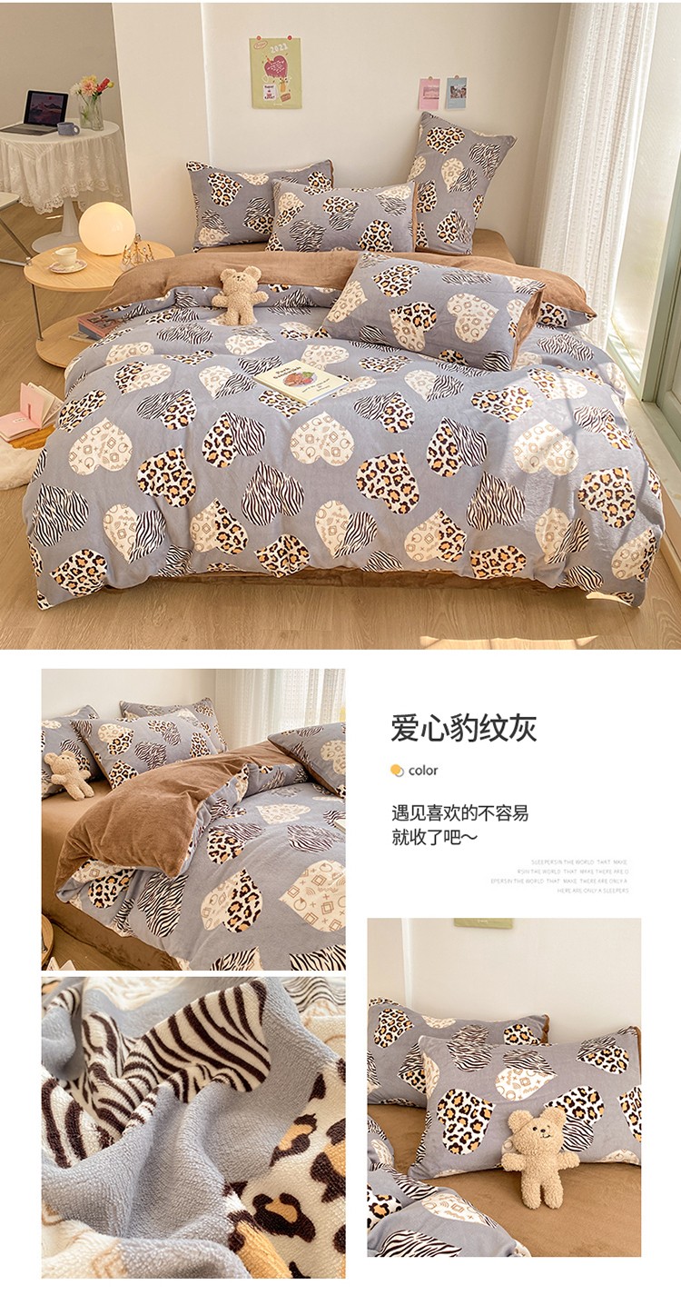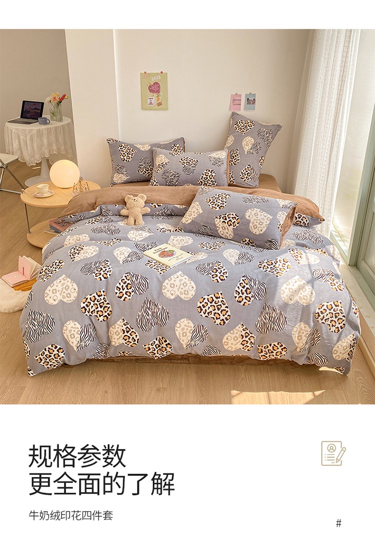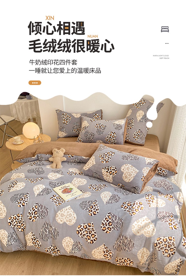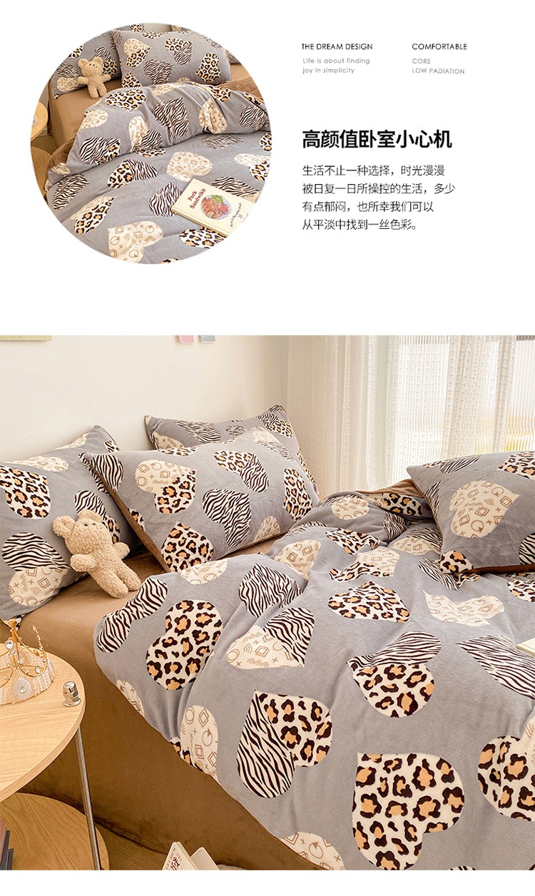 商品名称:雅居纺 2022新款印花牛奶绒四件套 爱心豹纹灰