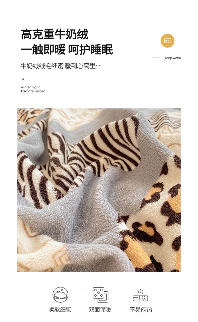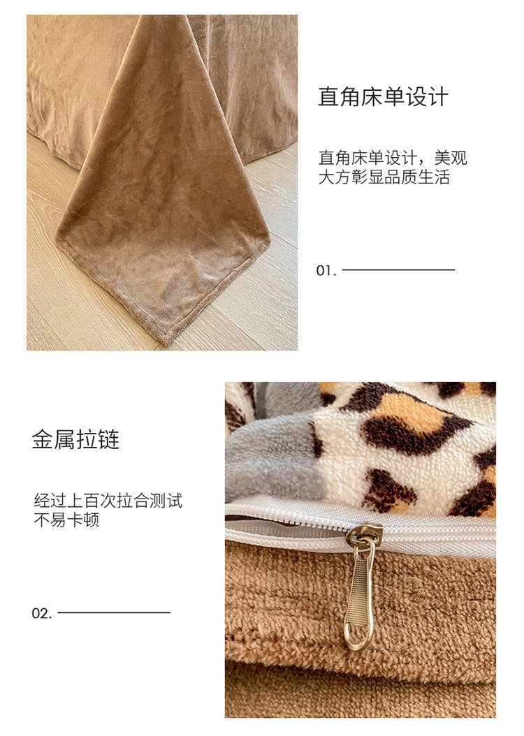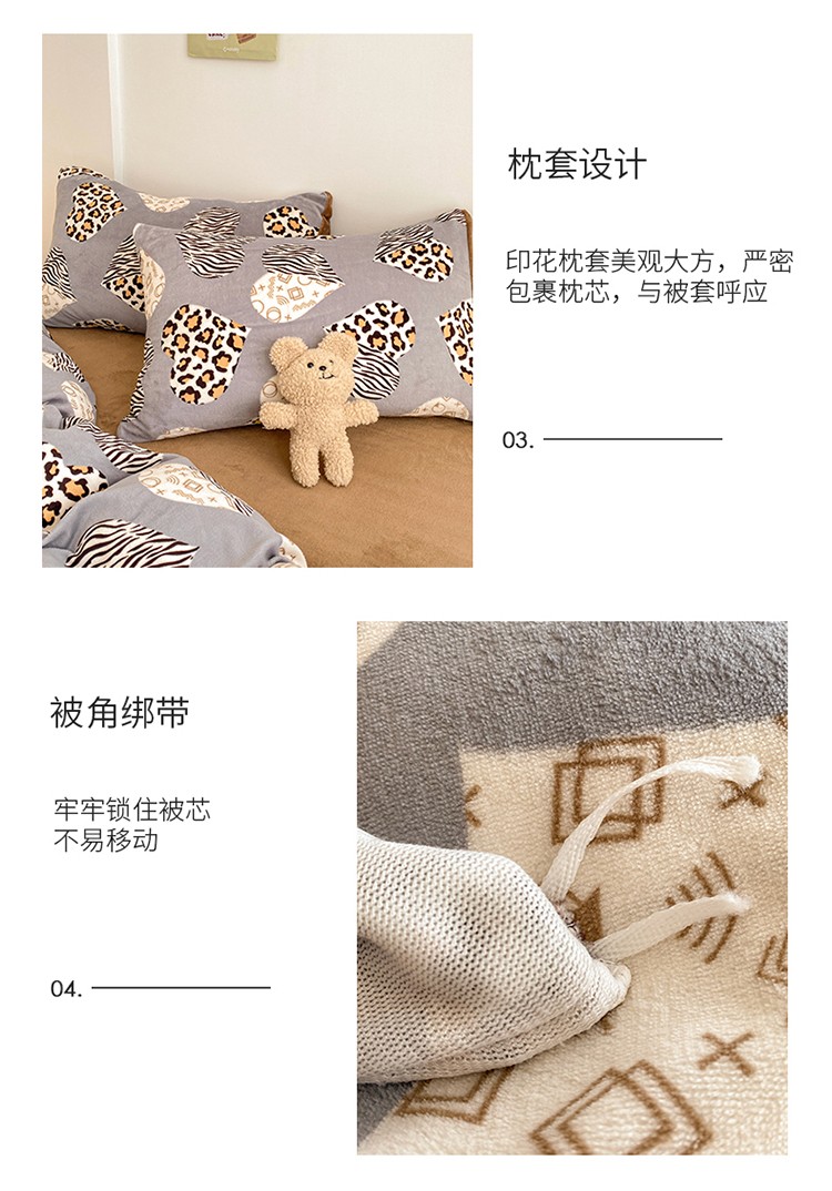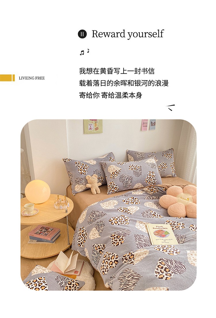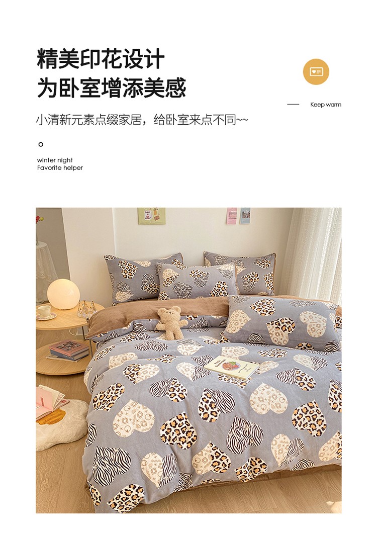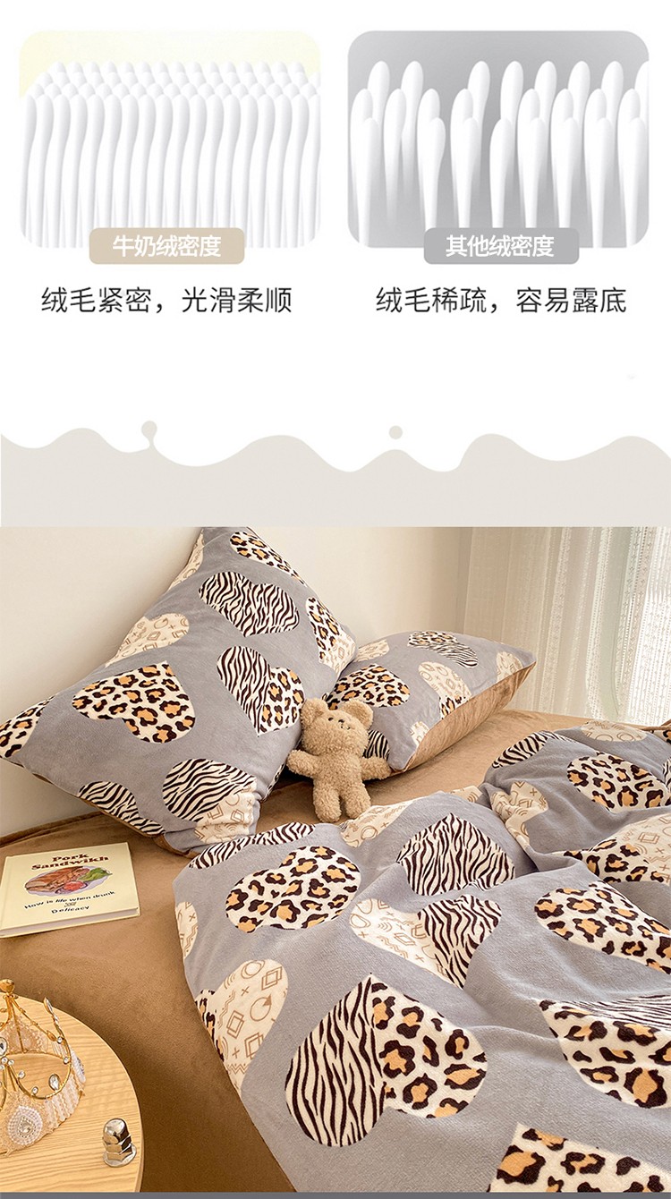 商品名称:雅居纺 2022新款印花牛奶绒四件套 爱心豹纹灰
