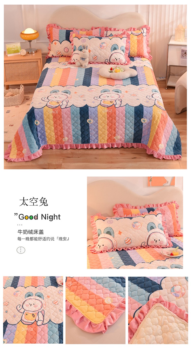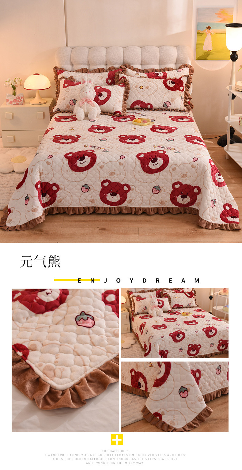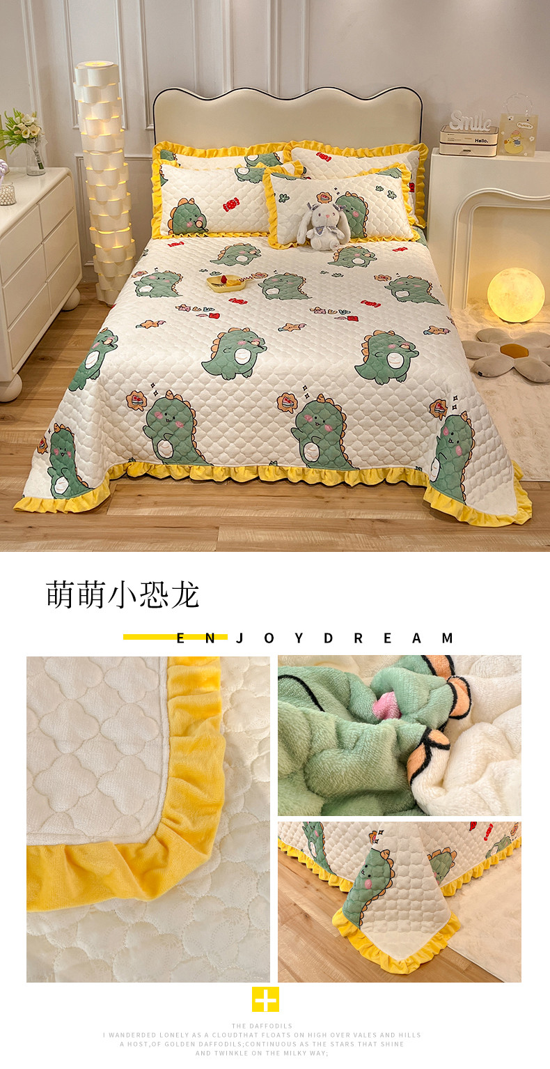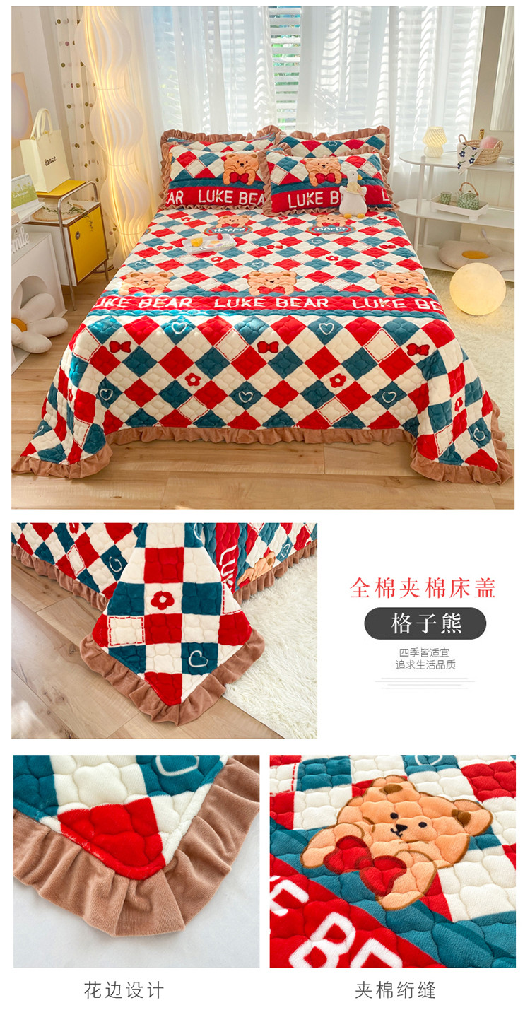 (总)美达家纺 2025新款高克重牛奶绒花边款夹棉床盖三件套,巴拉巴拉,格子萌熊,恐龙星球,梦蝶,时来运转,甜蜜奶吧,微笑熊,针织熊