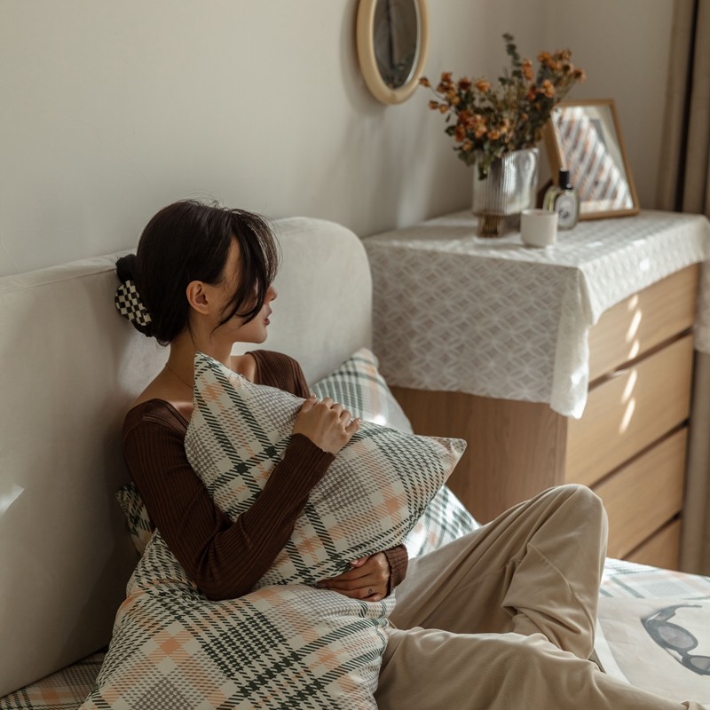 (总)寐眠 2025新款印花牛奶绒三角针贝壳款四件套,红蓝律动,黄绿森语,米韵红痕,墨格独白,暖黄千鸟,桃粉千鸟,雾灰千鸟,棕格时光