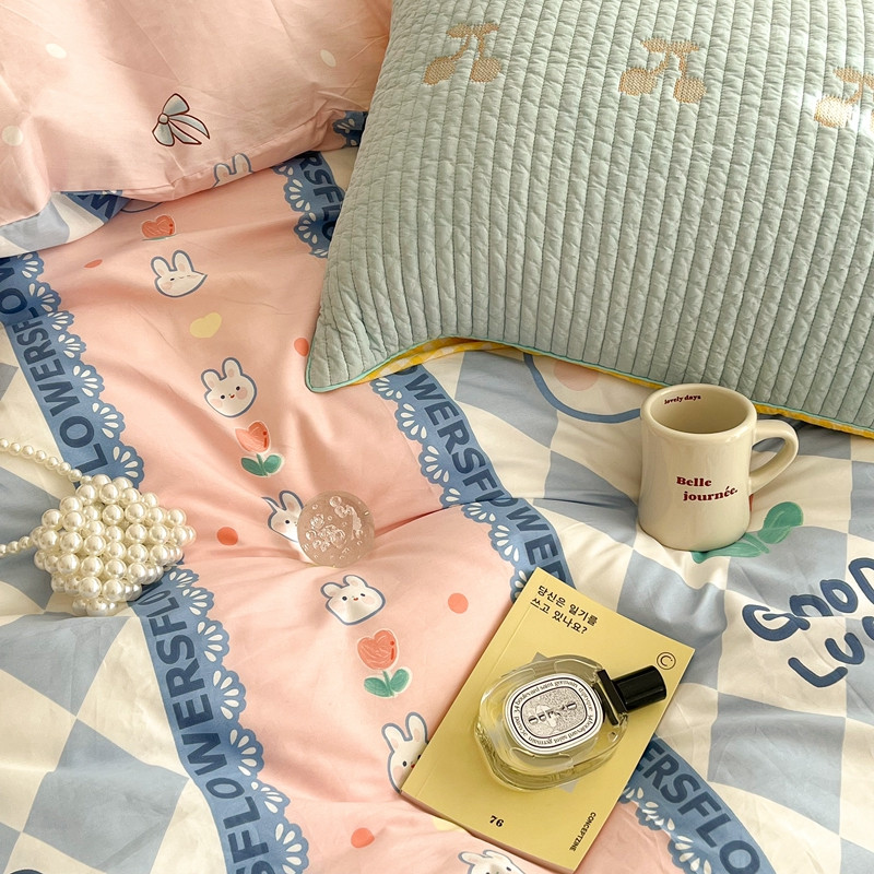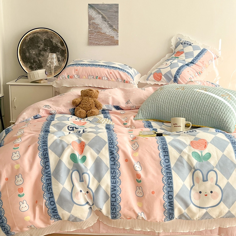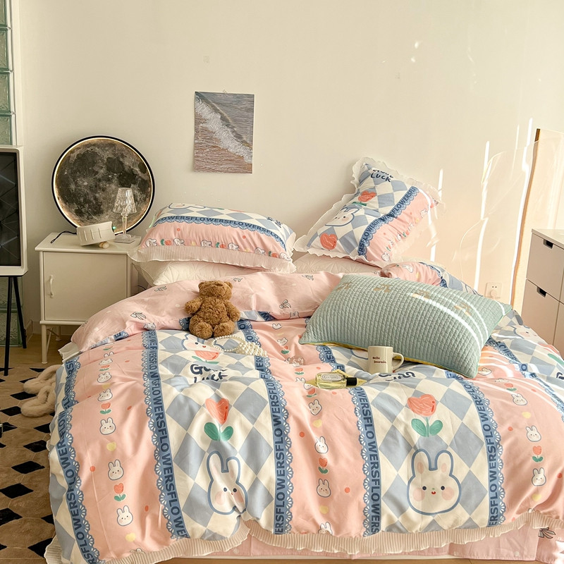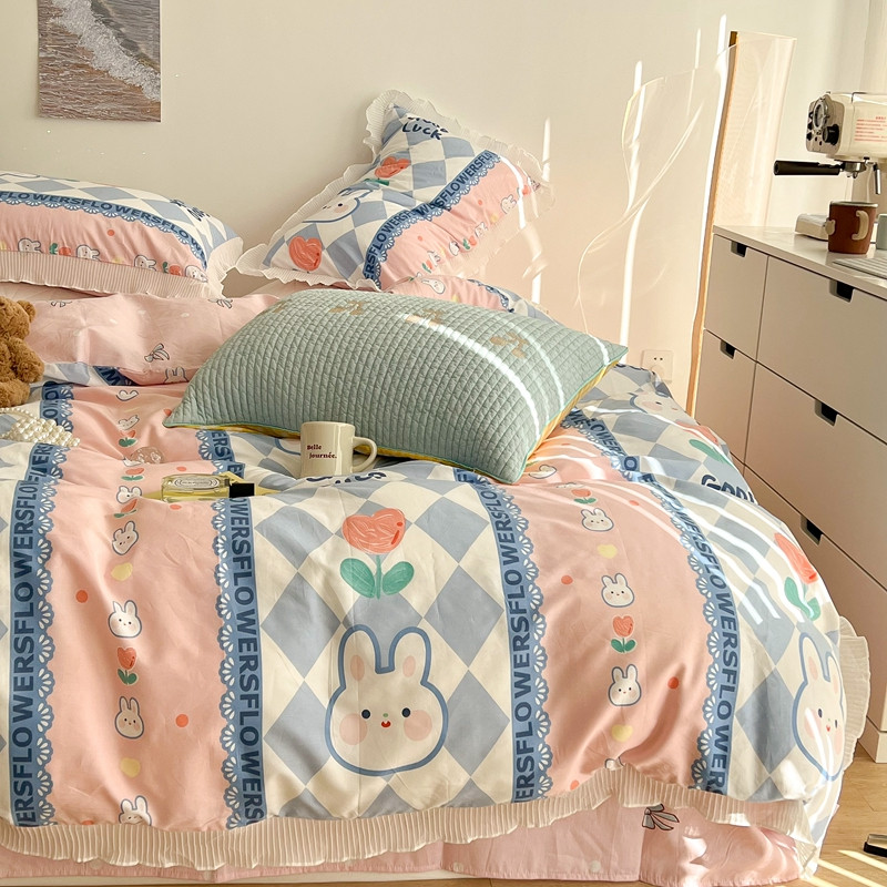 昔可家纺 2022新款13372全棉百褶花边四件套 竖条兔兔