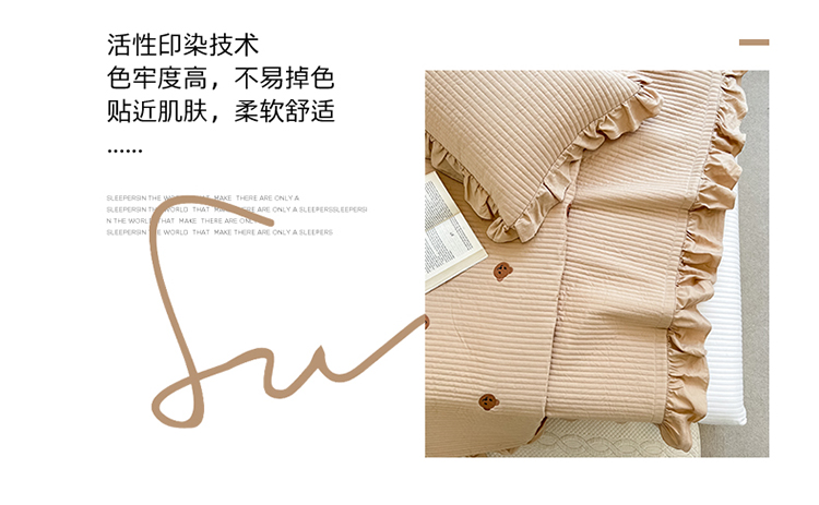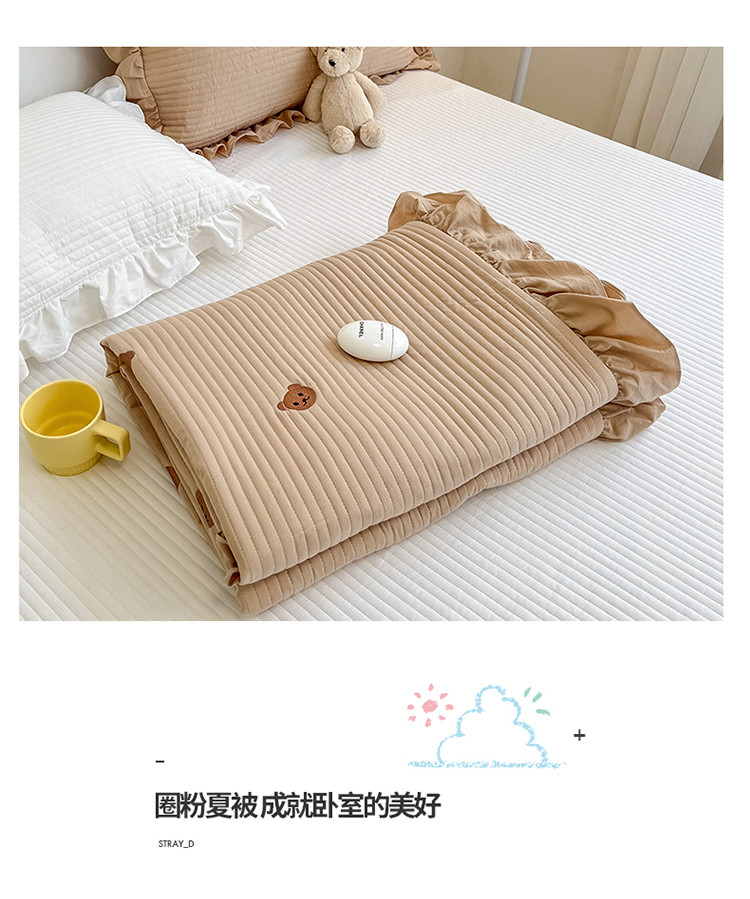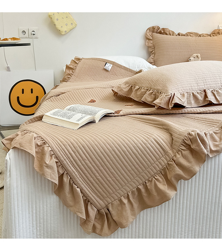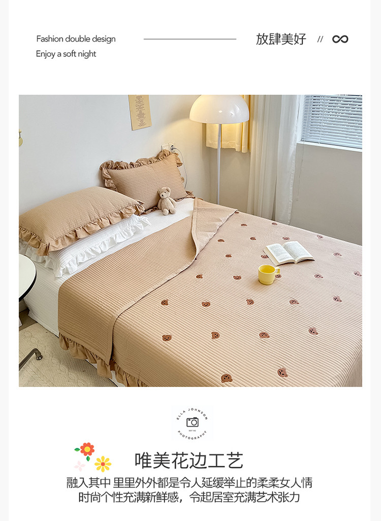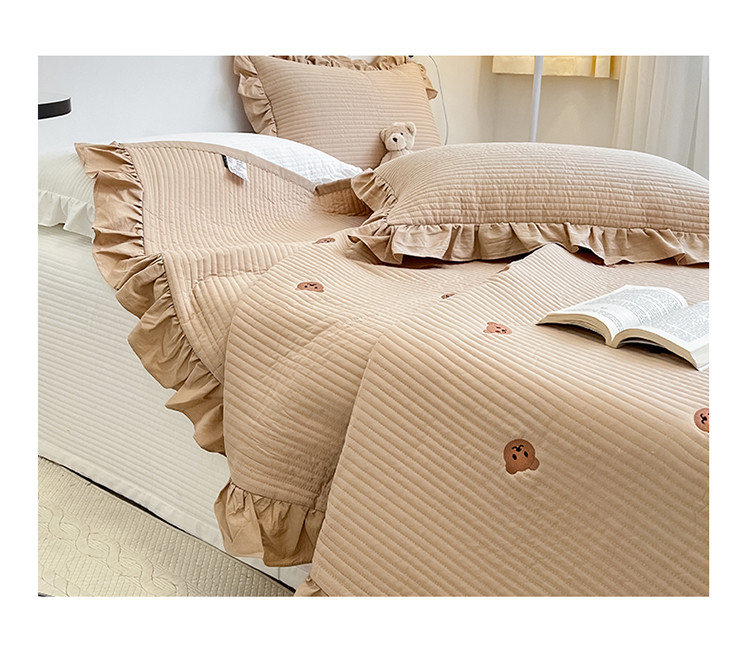 漫调ins风韩版荷叶边水洗全棉绗缝刺绣夏被床盖三件套小熊卡其