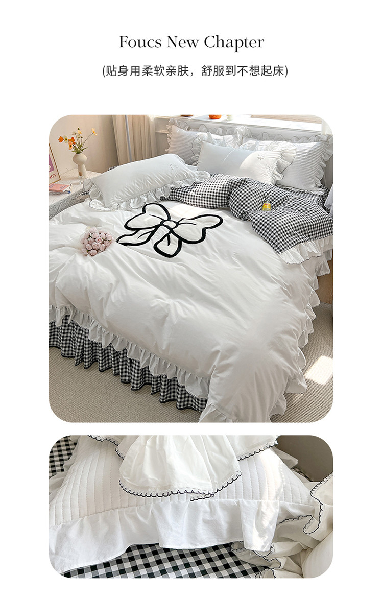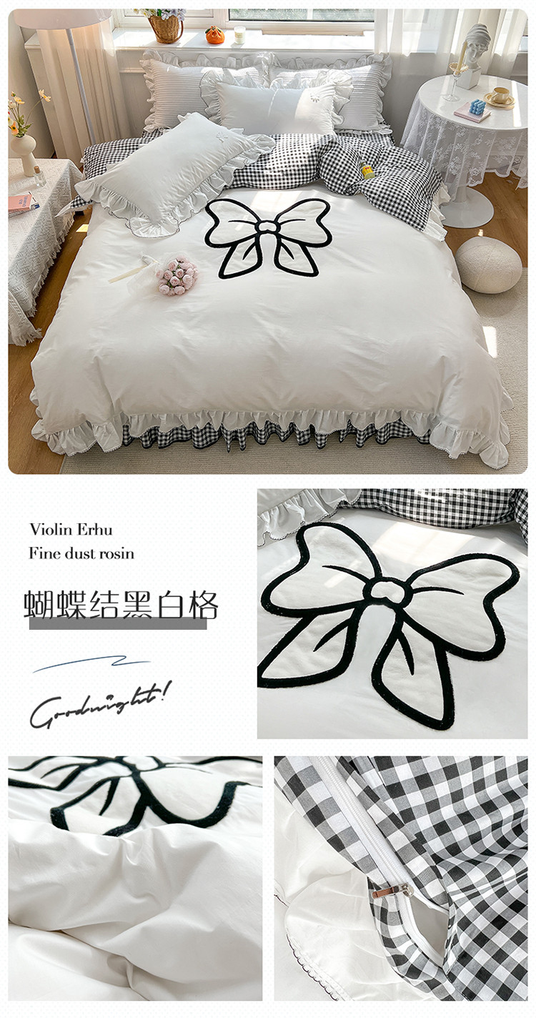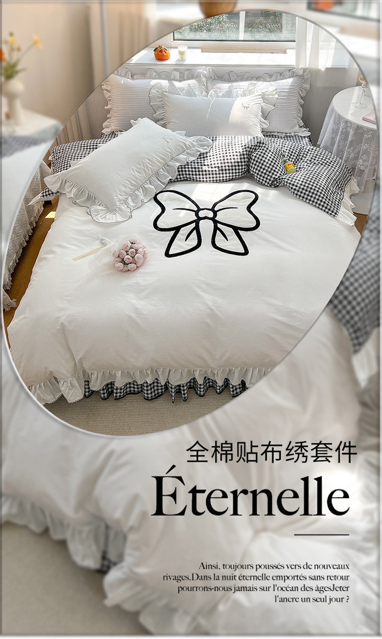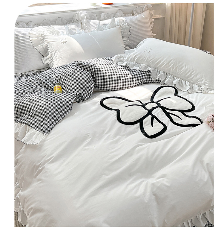 婳庭家居 2023新款全棉13376贴布绣蝴蝶结四件套 蝴蝶结黑白格