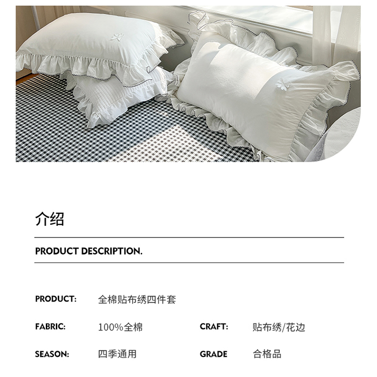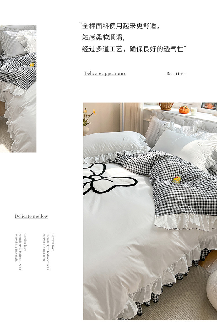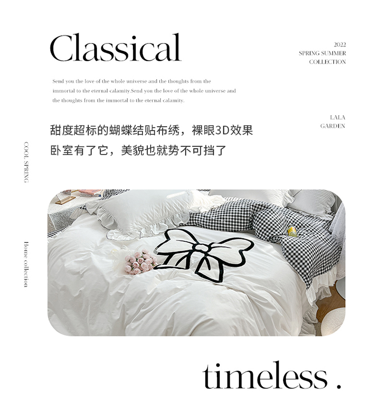 商品名称:婳庭家居 2023新款全棉13376贴布绣蝴蝶结四件套 蝴蝶结黑白格